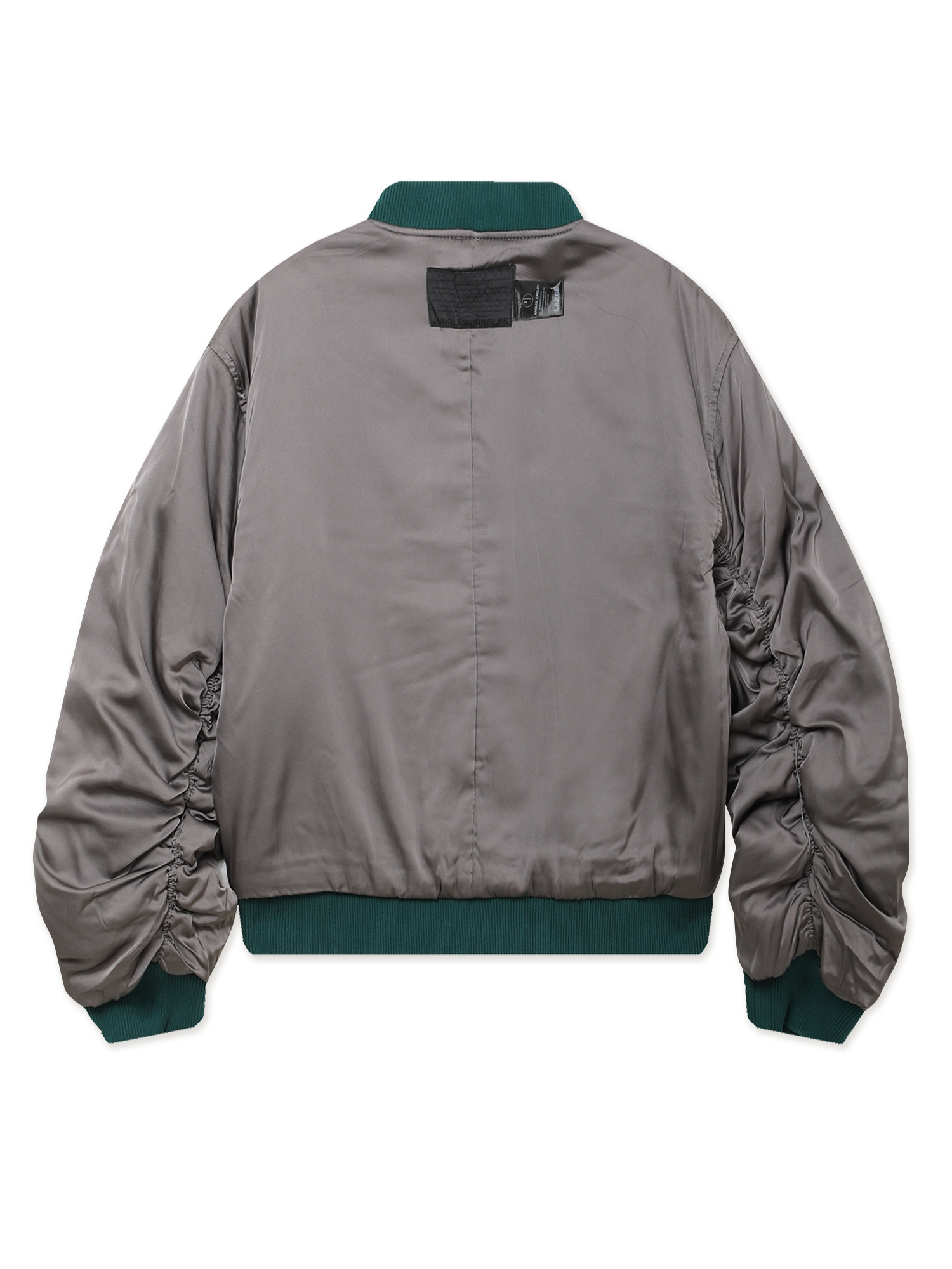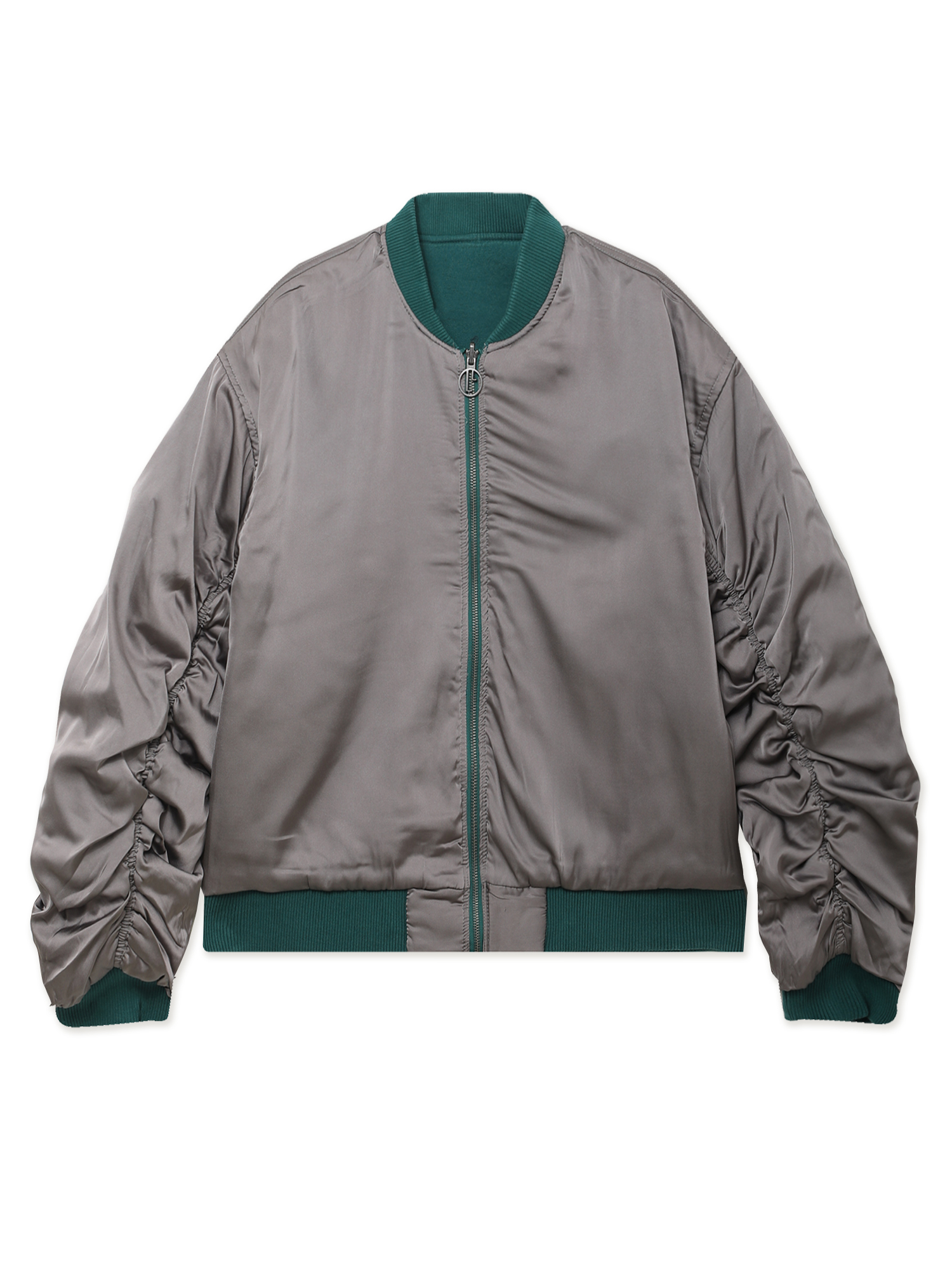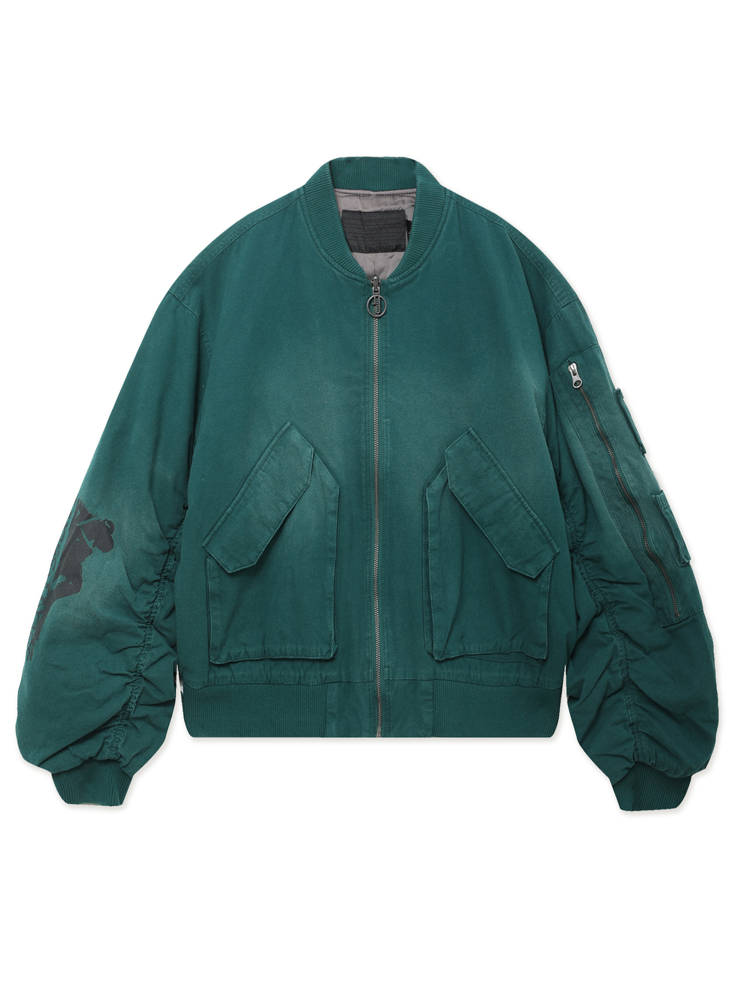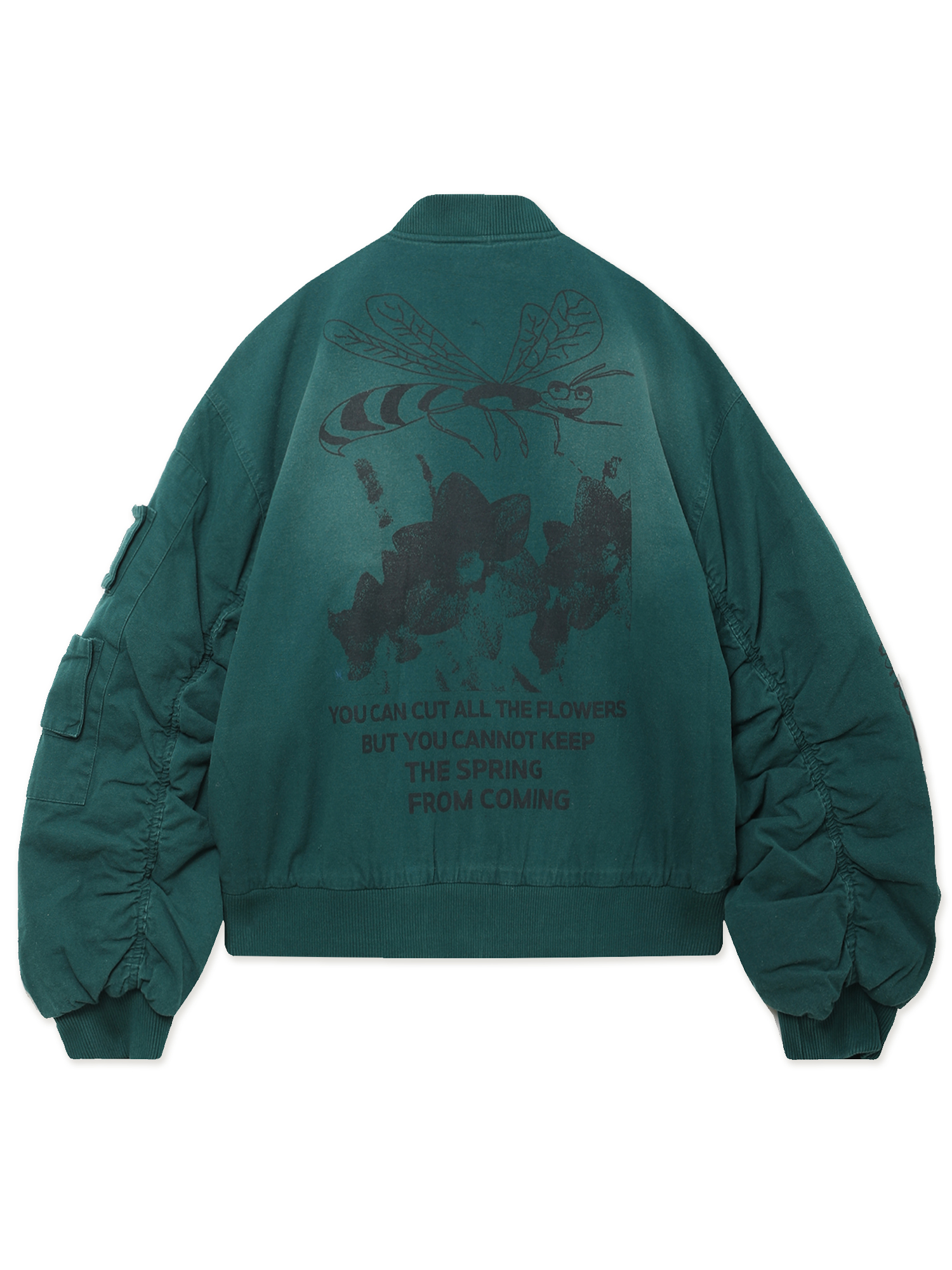 Двусторонний бомбер Jungles Jungles с верхом из прочного канваса, выстиранного для получения винтажного эффекта. Обратная сторона выполнена из контрастного сатина. Изделие дополнено принтами, посвященными творчеству чиллийского поэта Пабло Неруда. Бренд прошел сертификацию BSCI — инициативы по соблюдению социальных норм бизнеса.