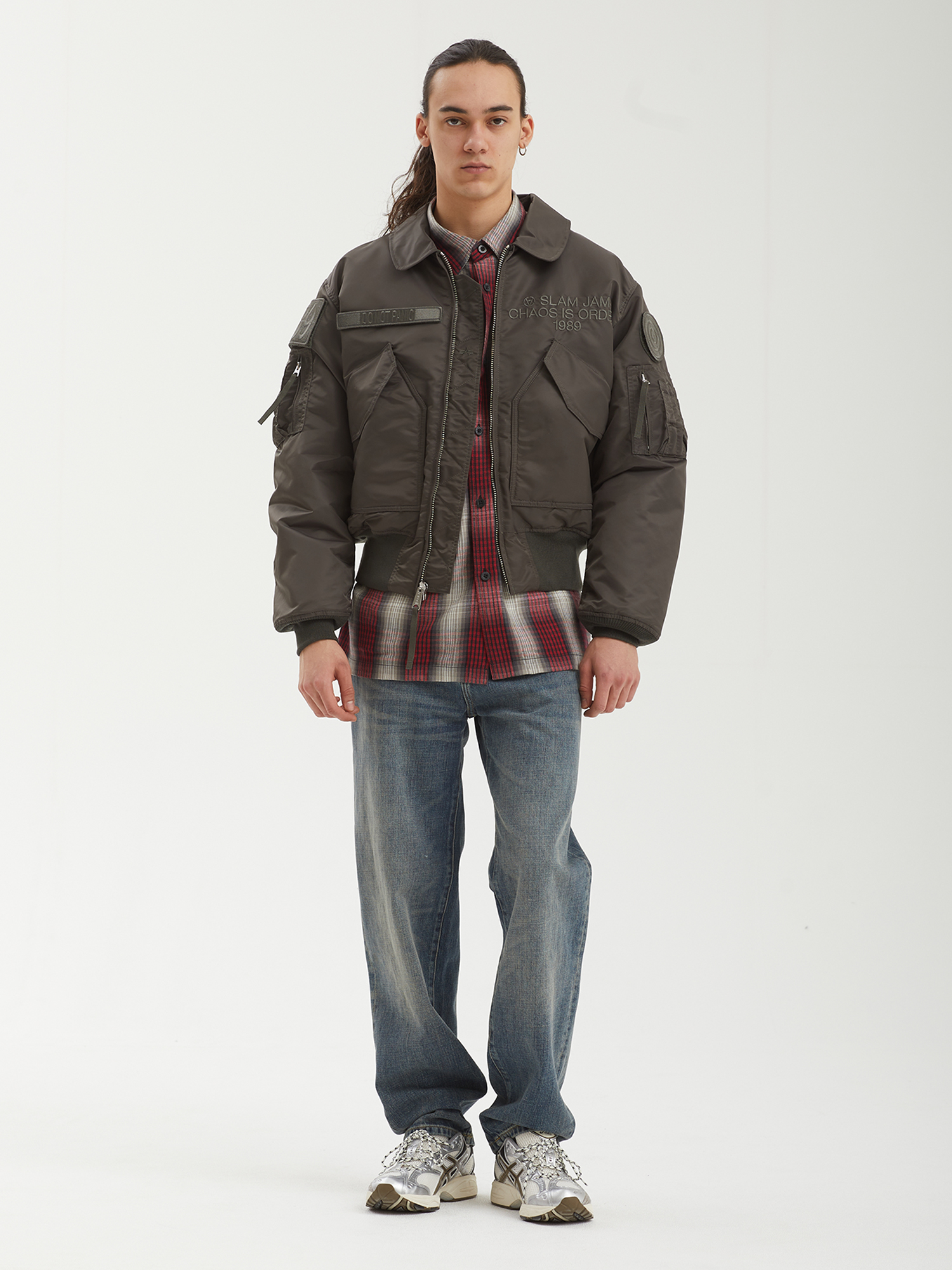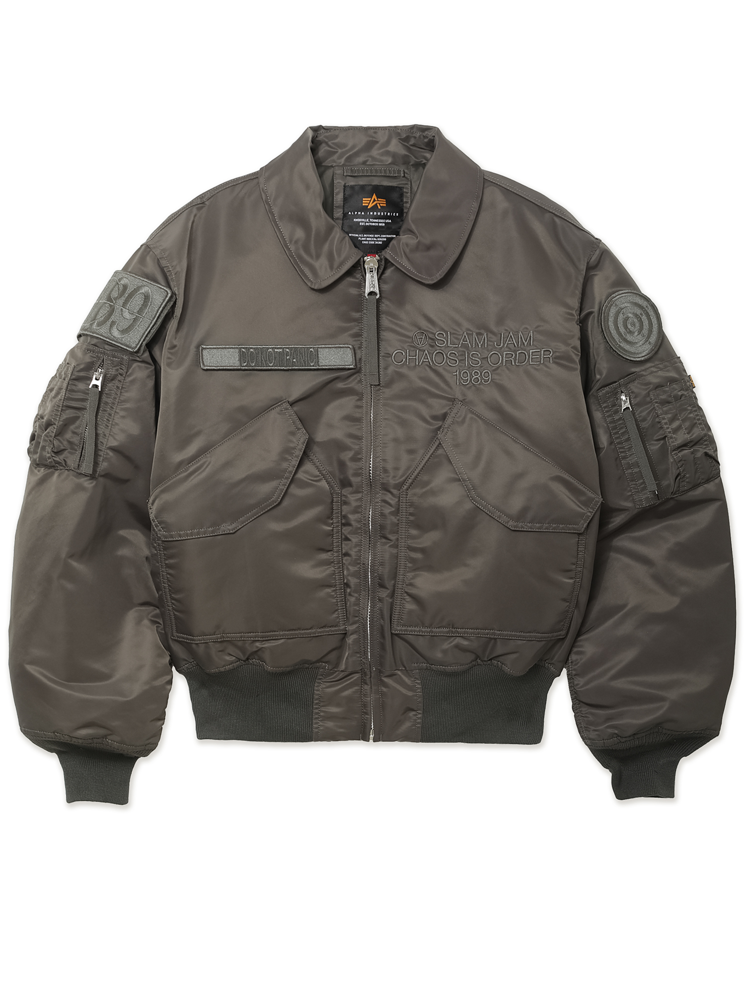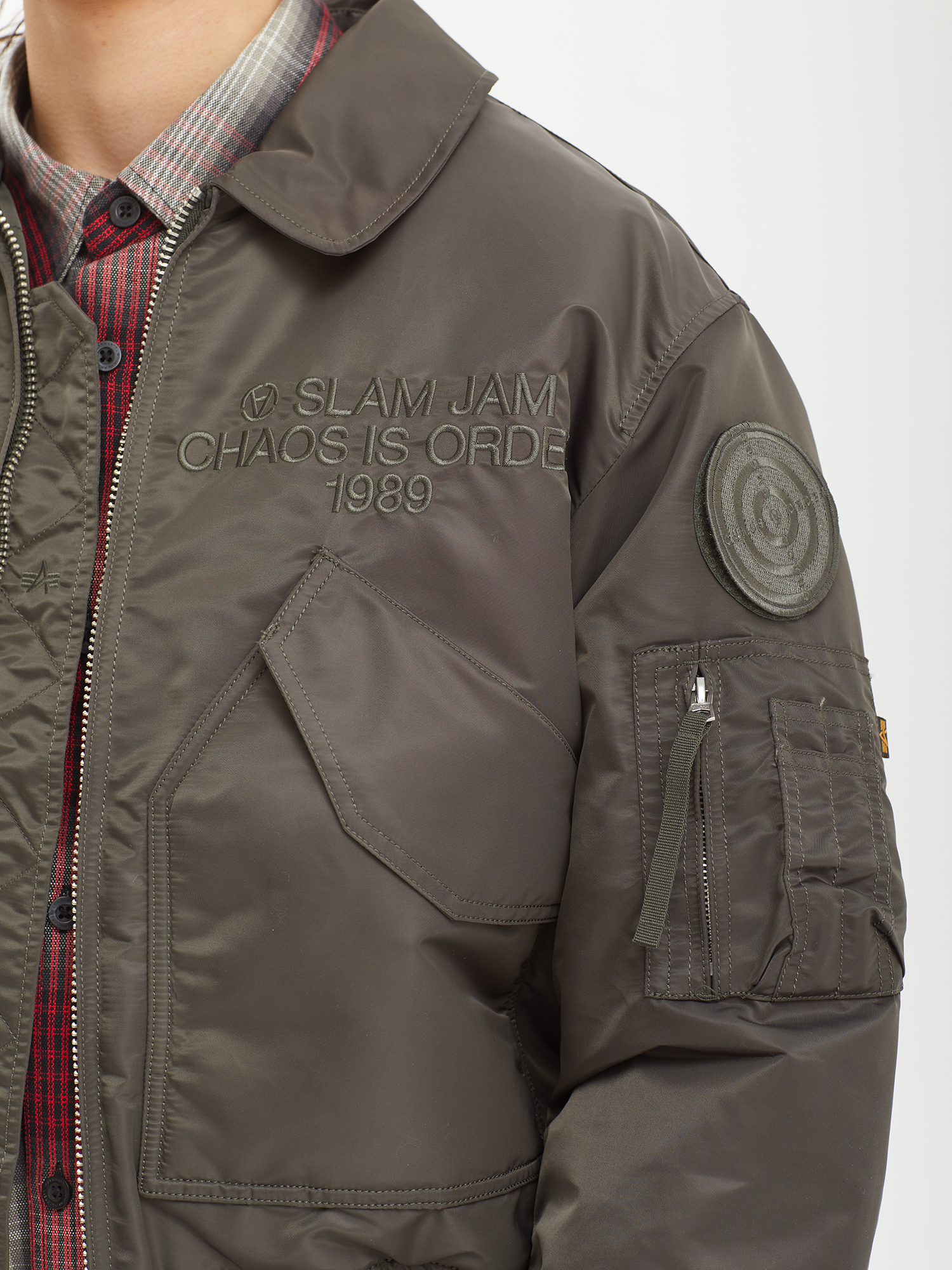 Бомбер Alpha Industries из коллаборации с ритейлером Slam Jam. Верх выполнен из водоотталкивающего нейлона, подкладка с утеплителем. Дизайн вдохновлен классической летной курткой CWU-45, изделие дополнено двойным брендингом в милитари-эстетике.