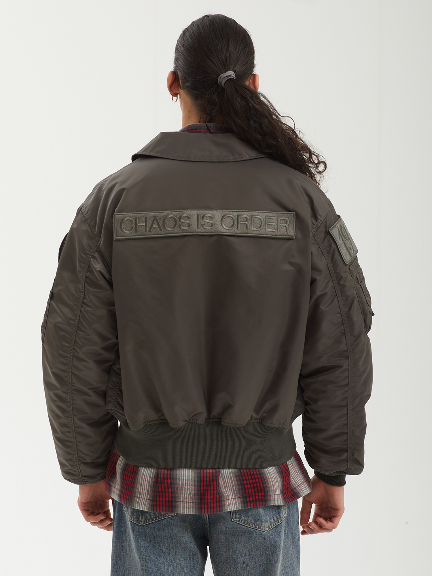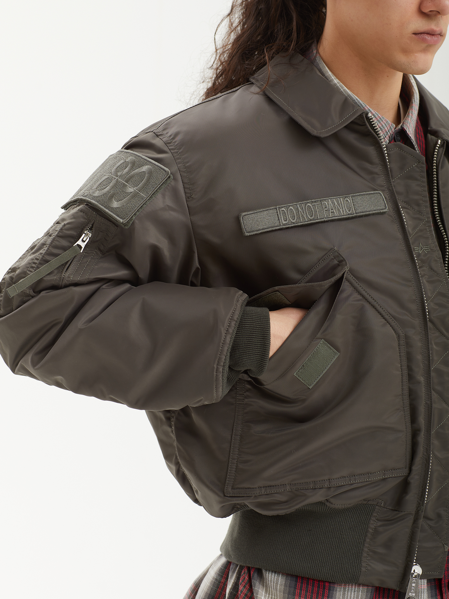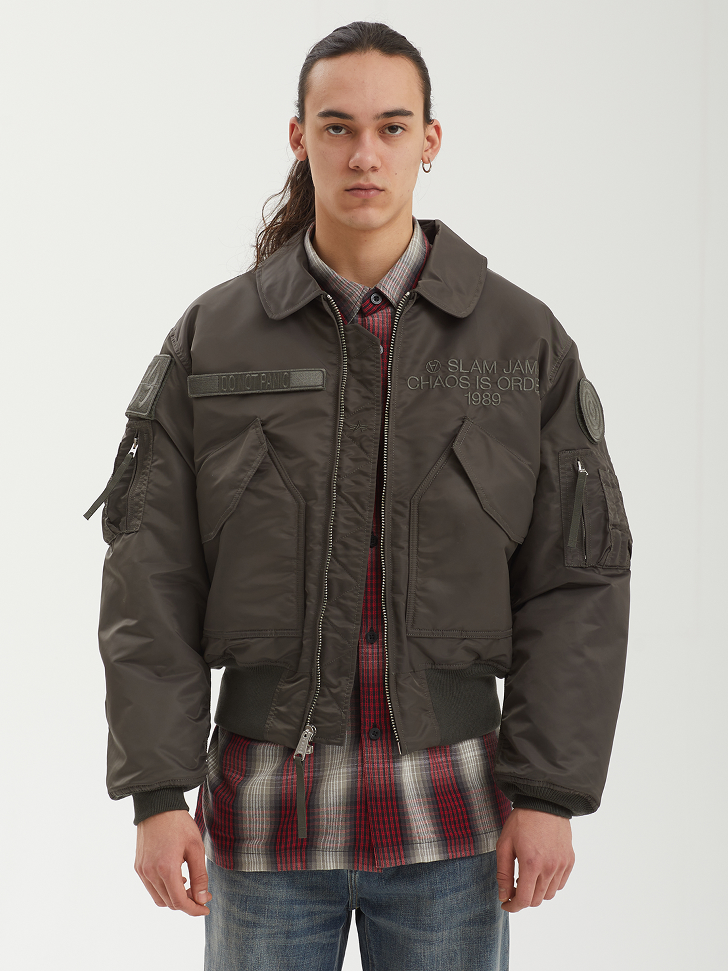 Бомбер Alpha Industries из коллаборации с ритейлером Slam Jam. Верх выполнен из водоотталкивающего нейлона, подкладка с утеплителем. Дизайн вдохновлен классической летной курткой CWU-45, изделие дополнено двойным брендингом в милитари-эстетике.