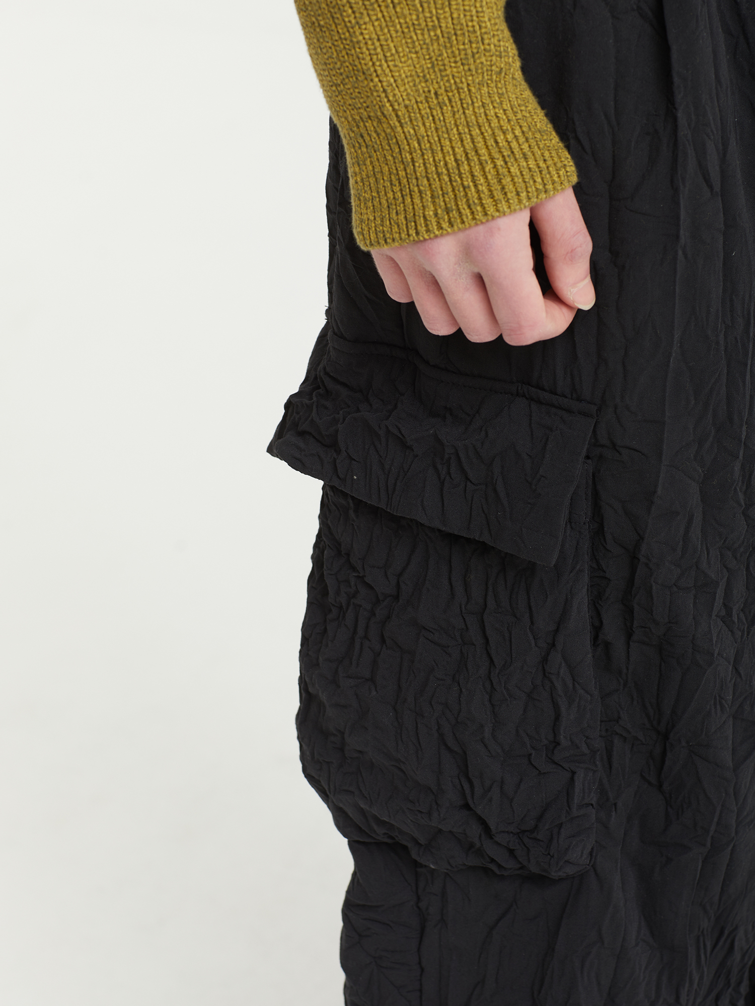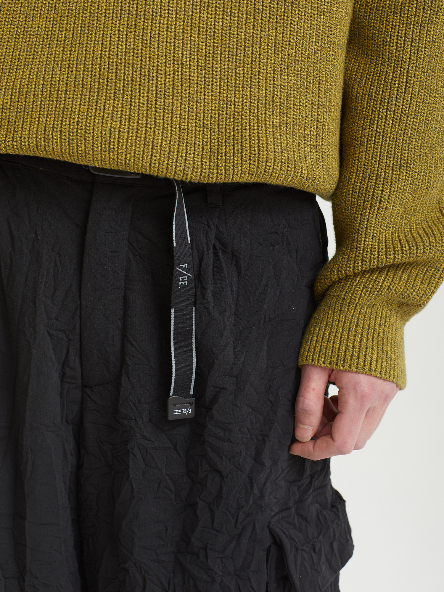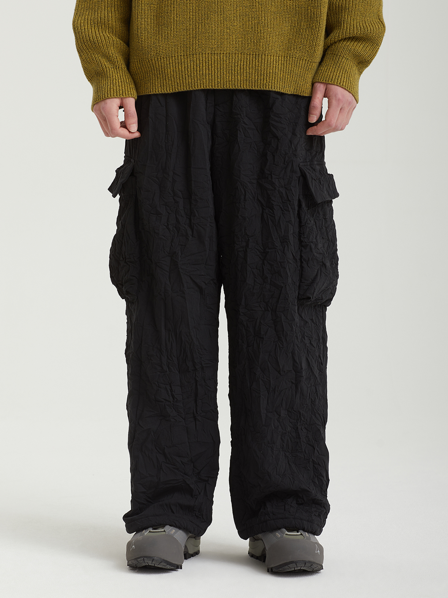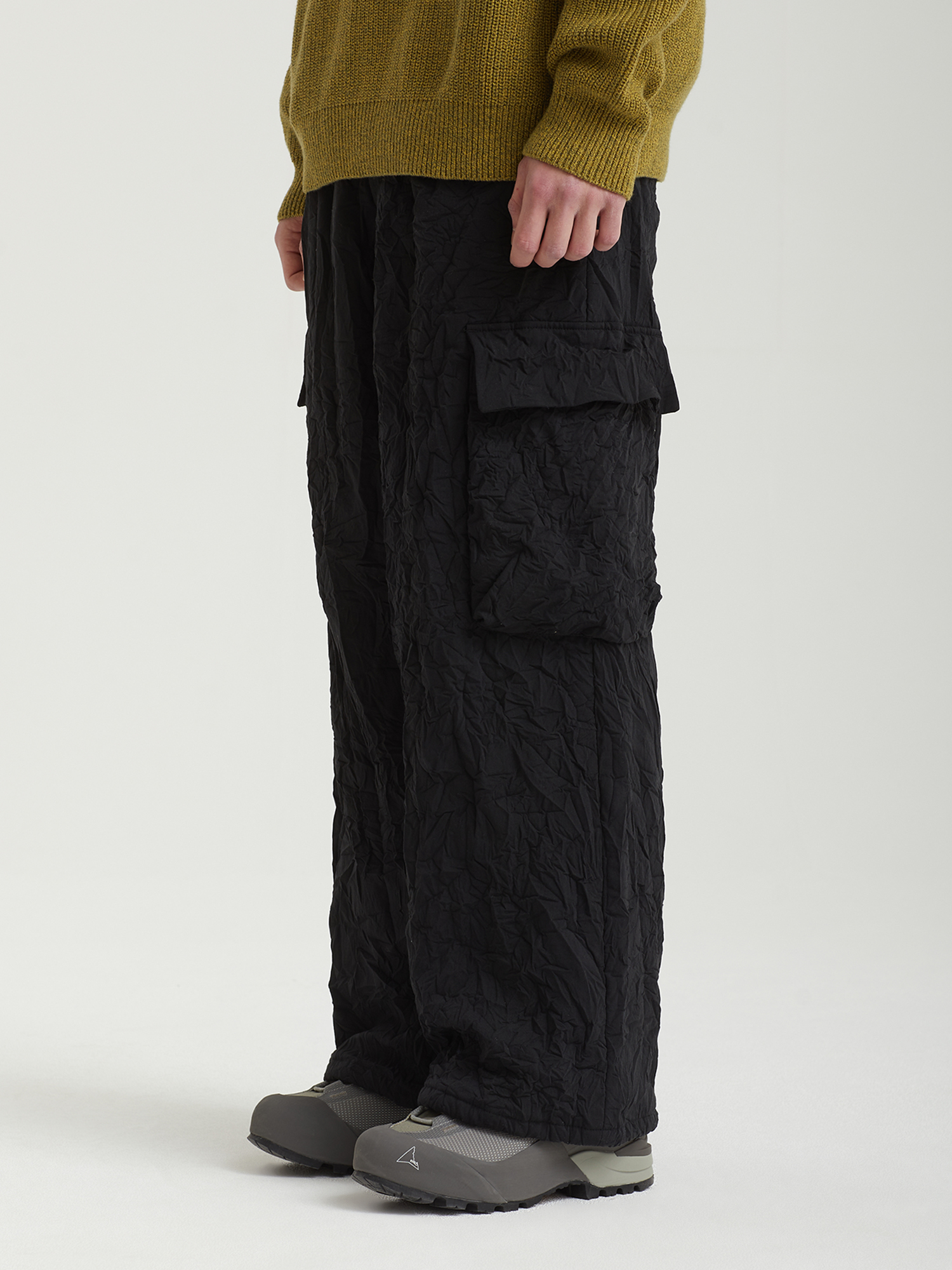 Брюки-карго F/CE с легким утеплением Primaloft и фирменным материалом «Catchwasher». Верхний слой — расчесанный полиэстер с мягкой текстурой, напоминающей шерсть. Ключевые свойства PrimaLoft включают высокое теплосбережение, сохранение тепла при намокании и хорошую воздухопроницаемость. Свободный крой, крупные карманы и регулируемый пояс делают брюки функциональными и удобными.