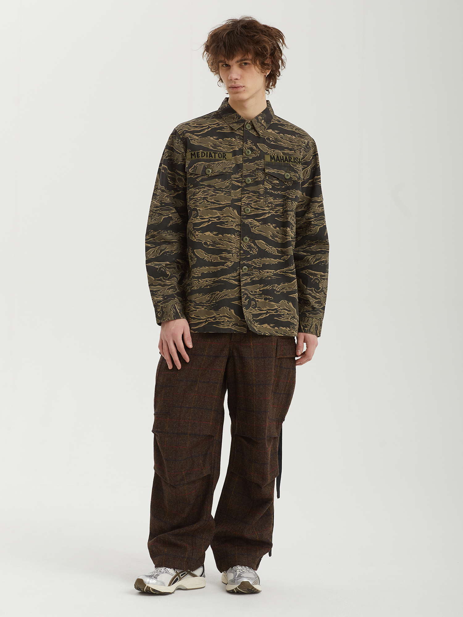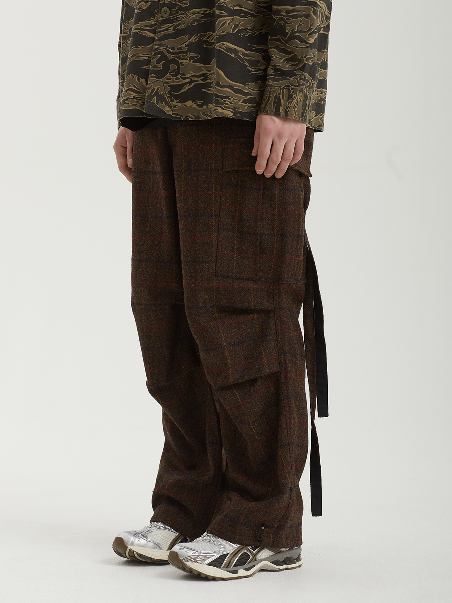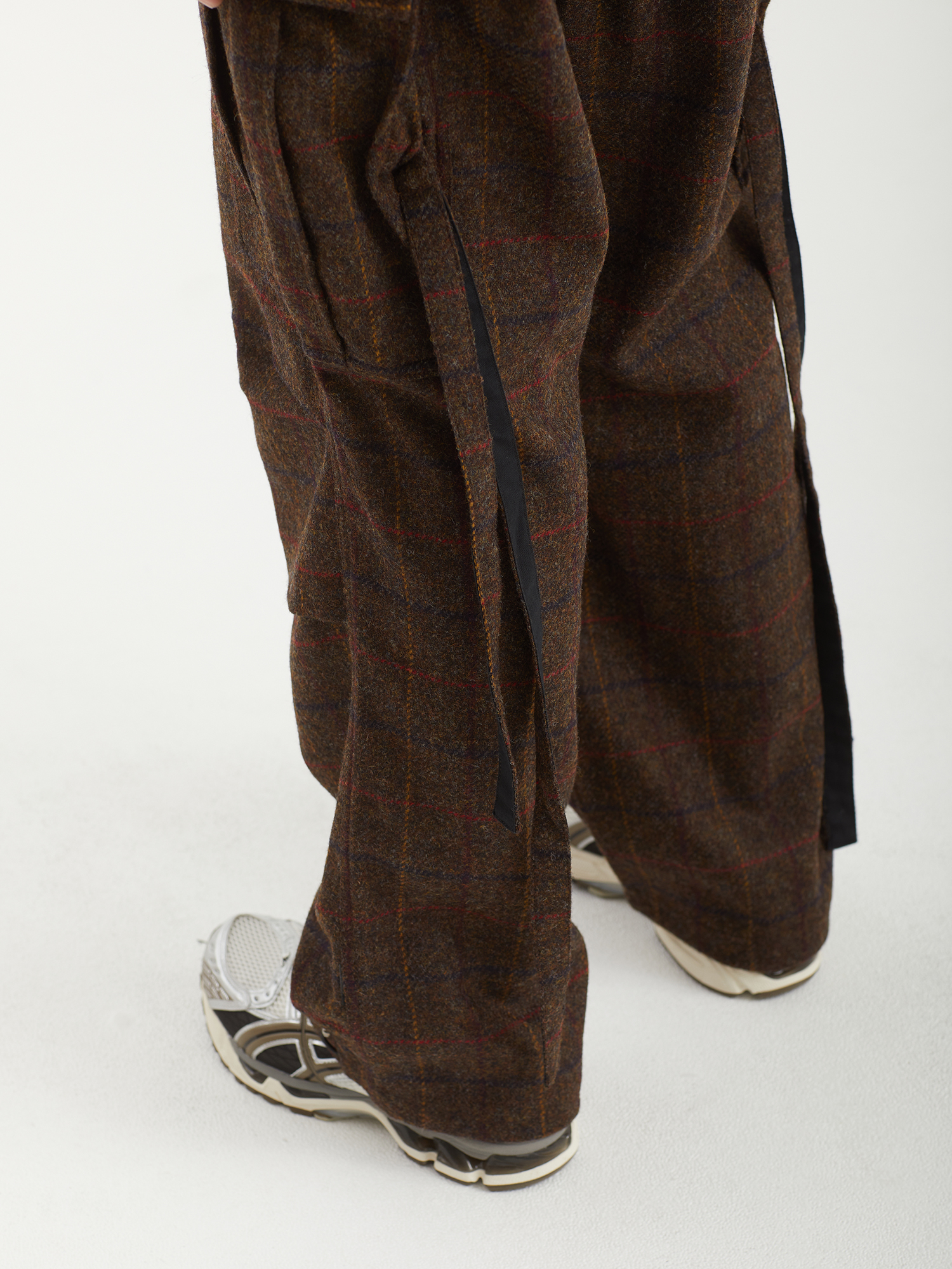 Брюки-карго Maharishi из плотного шерстяного твида. Изделие дополнено регулируемым поясом и складками на коленях для лучшей посадки. Материал произведен в Великобритании.