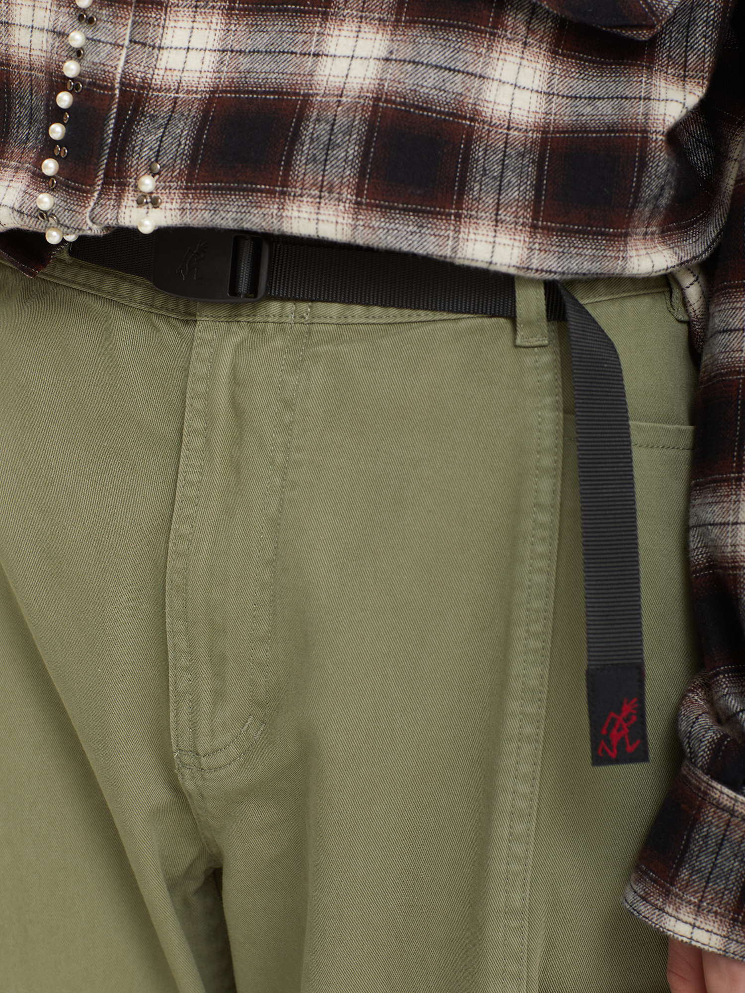 Брюки-чино Gramicci из прочного хлопкового твила. Эта модель получила эластичный пояс на регулируемом ремне и вместительные карманы.