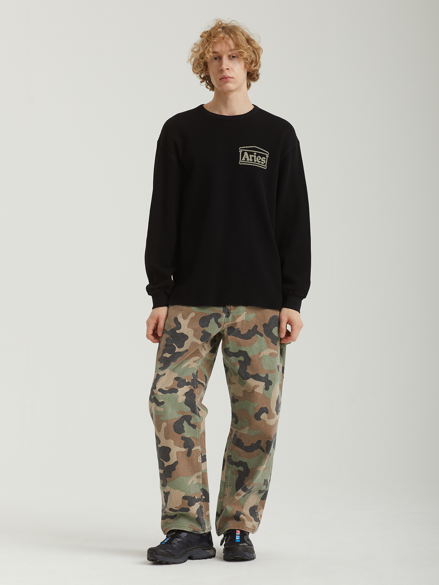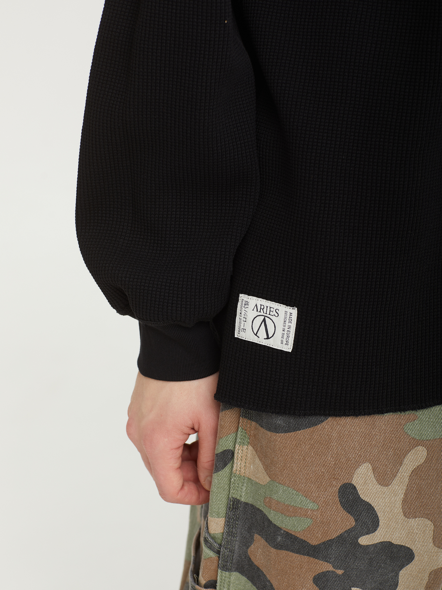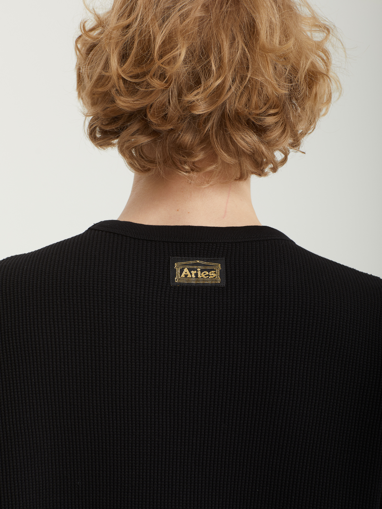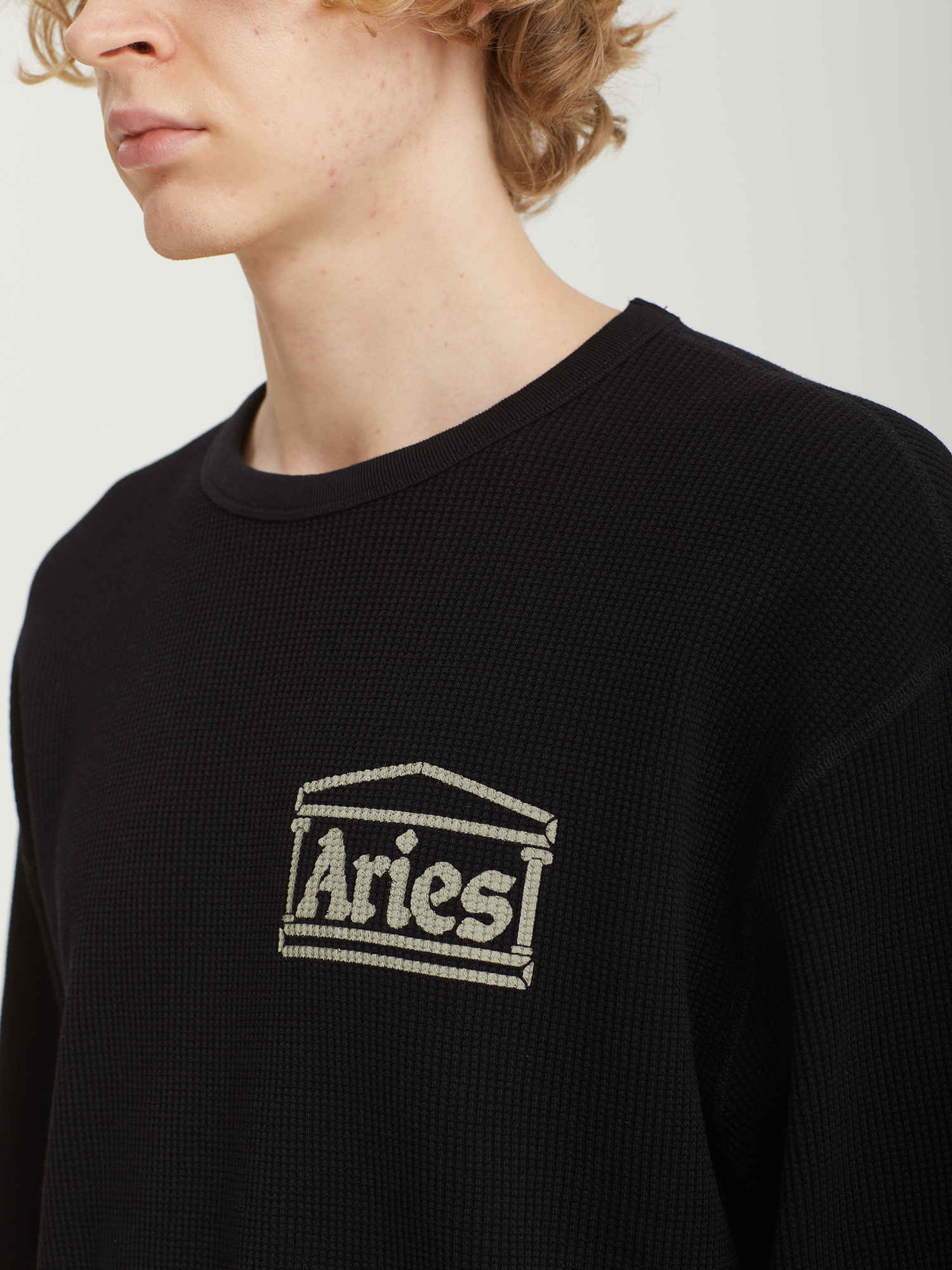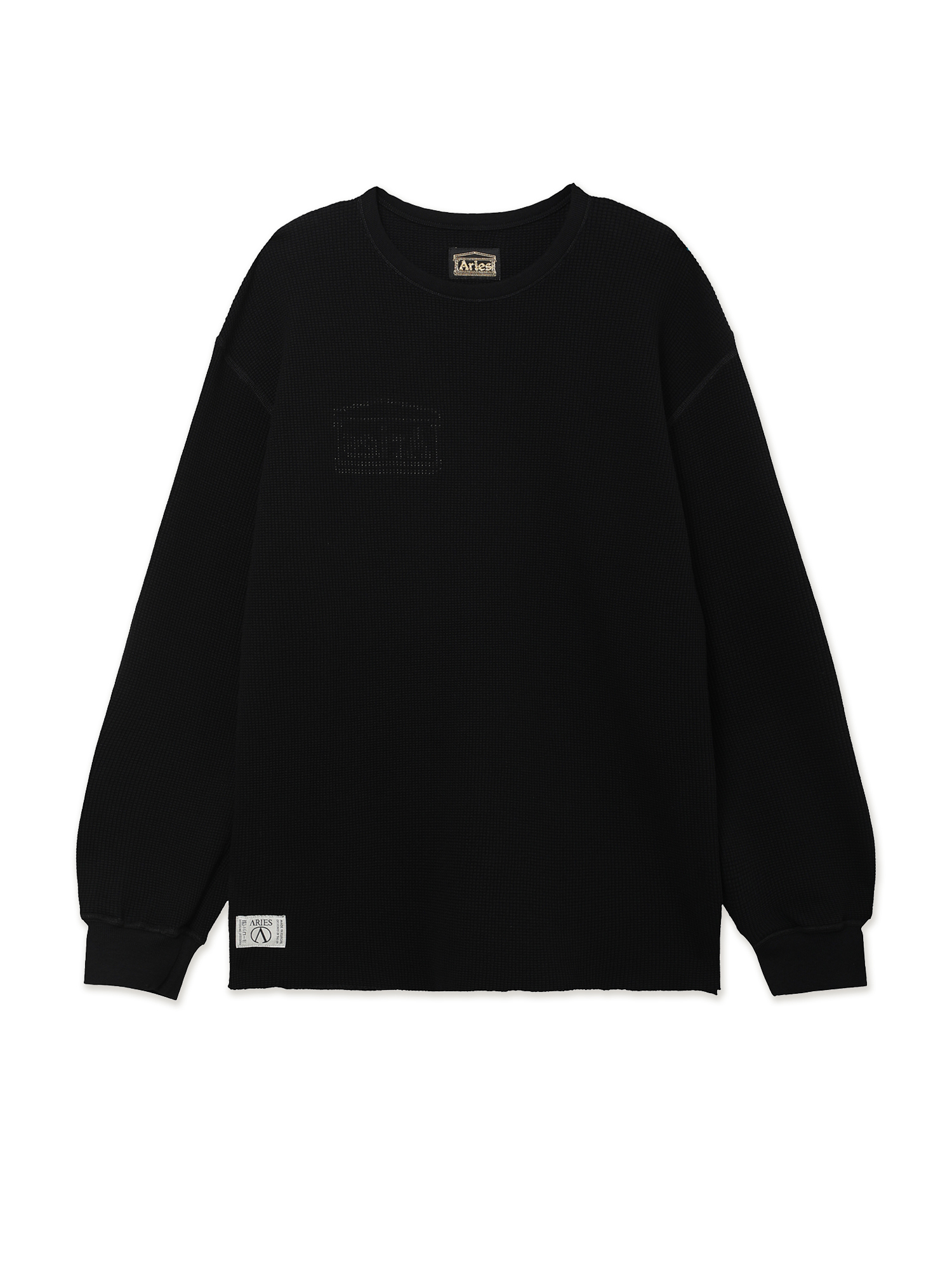 Лонгслив Aries из хлопкового джерси с вафельной текстурой. Модель отличается двусторонним дизайном и декоративной строчкой. С одной стороны — напечатанный логотип бренда, с другой — фирменные тканые нашивки.