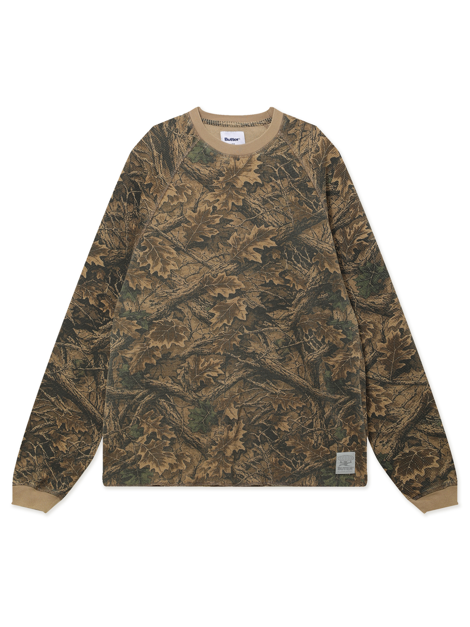 Джемпер Butter Goods из плотного вафельного материала с камуфляжным принтом. Изделие выстирано в готовом виде для мягкости и легкого винтажного эффекта.