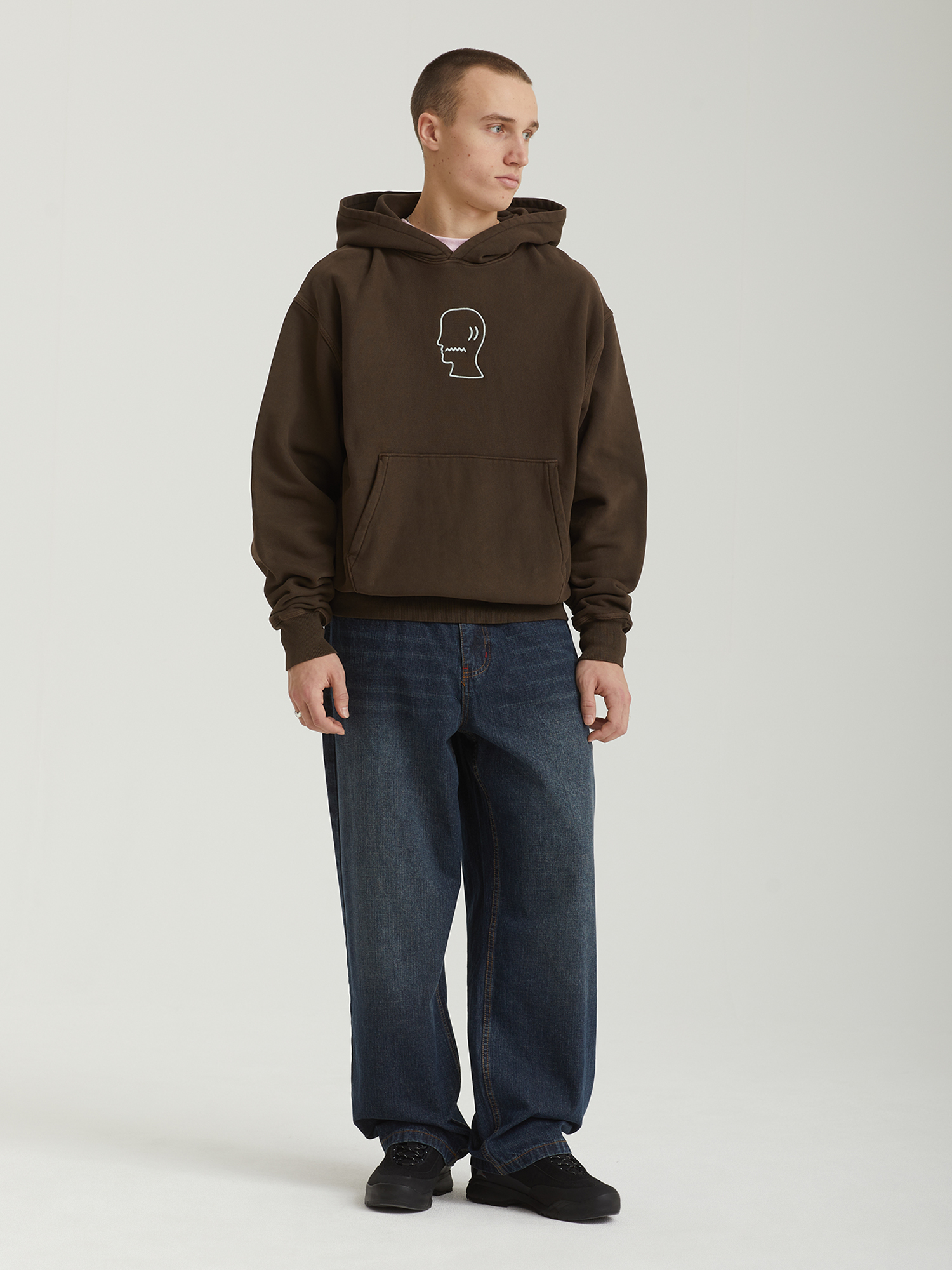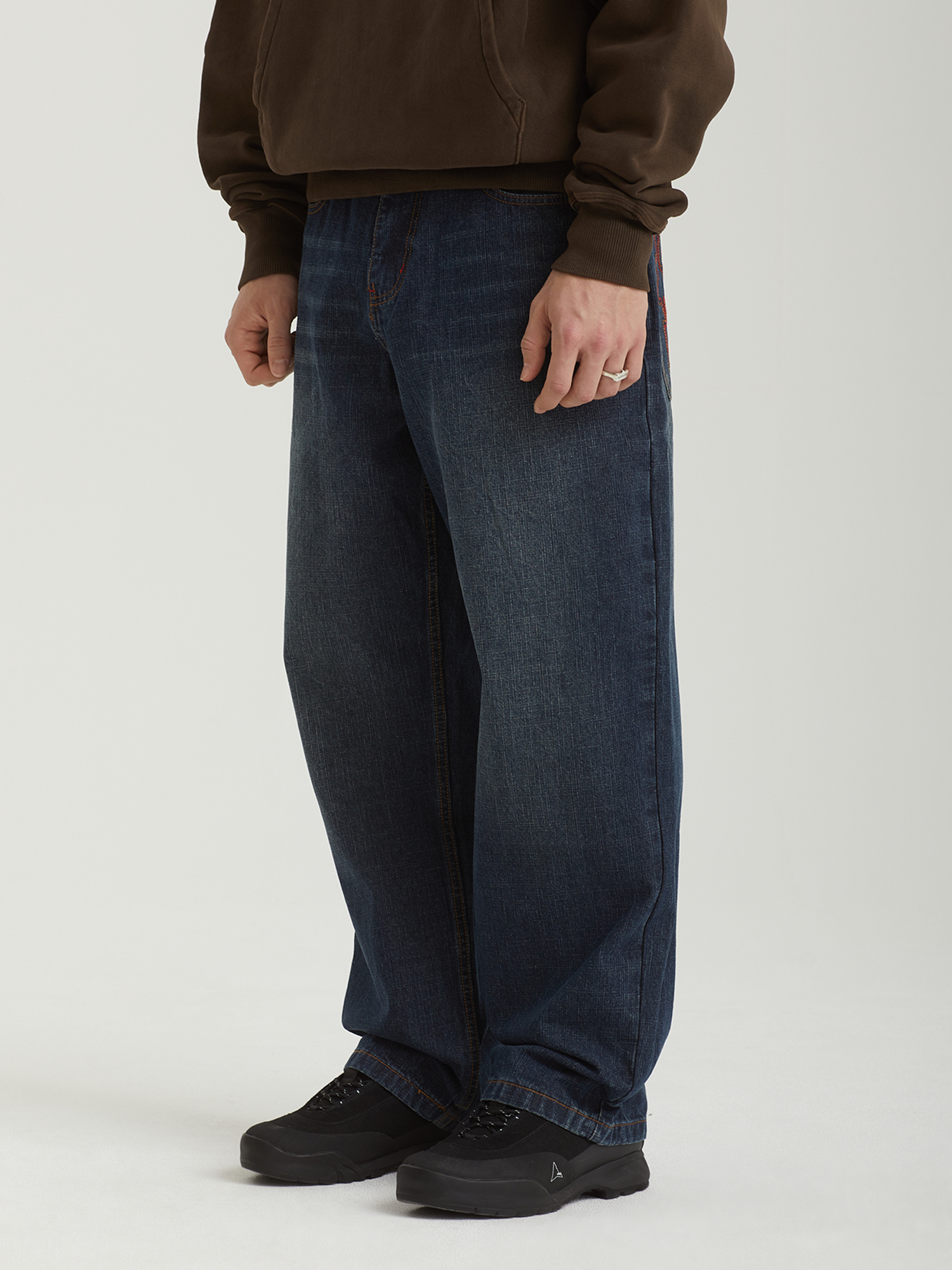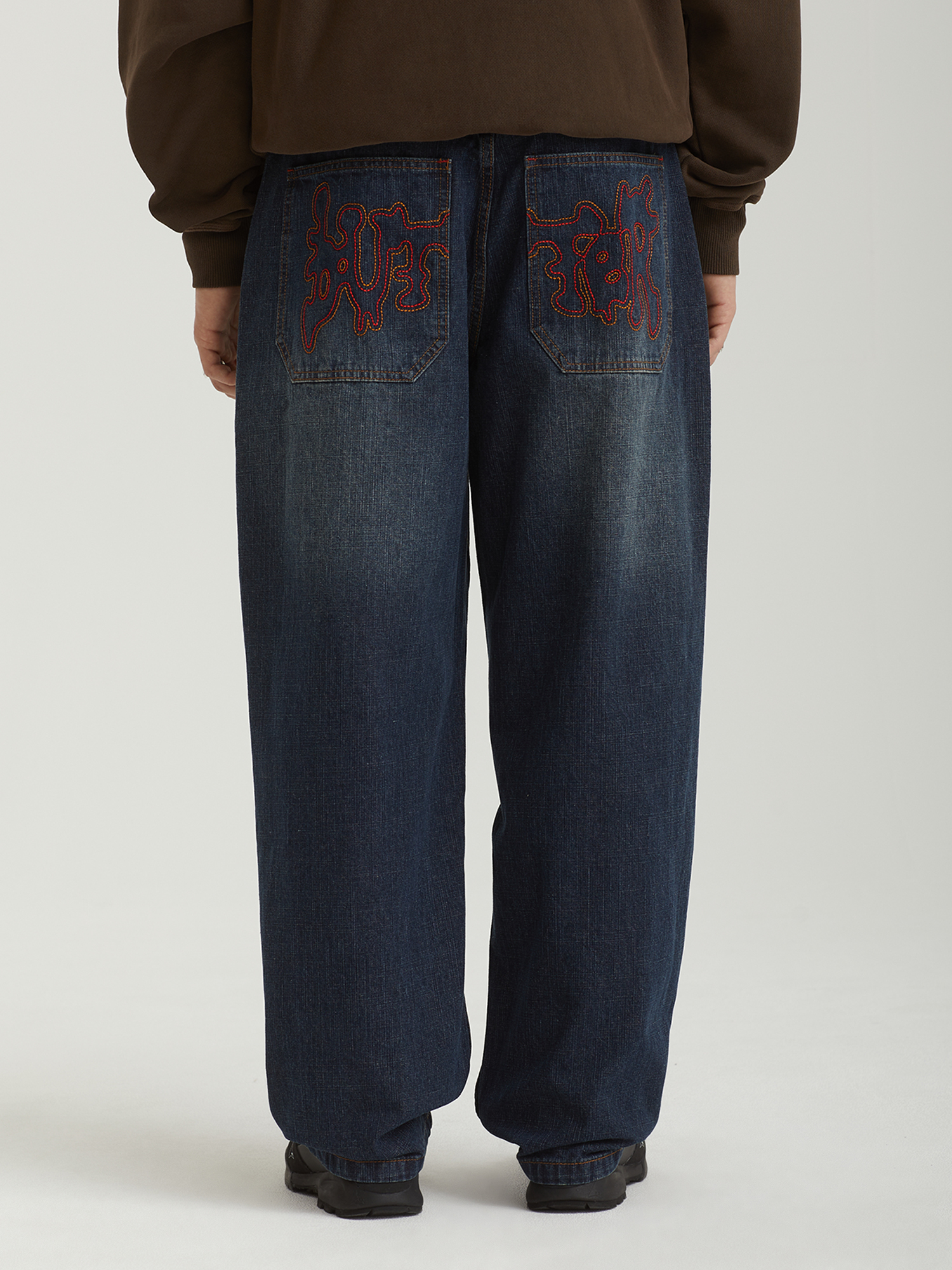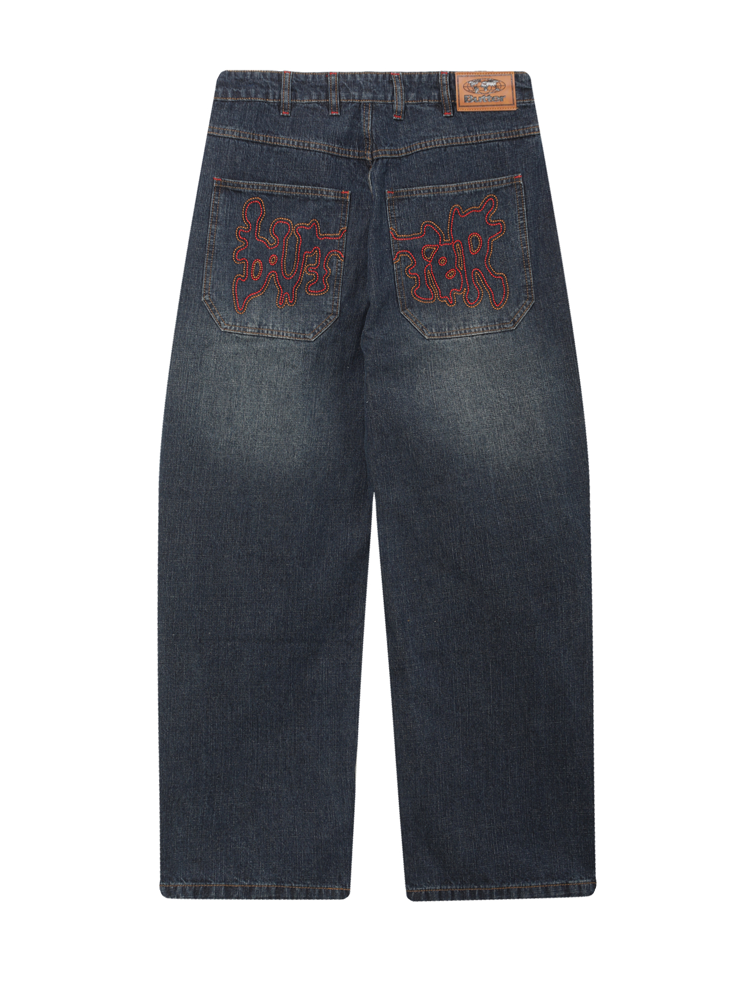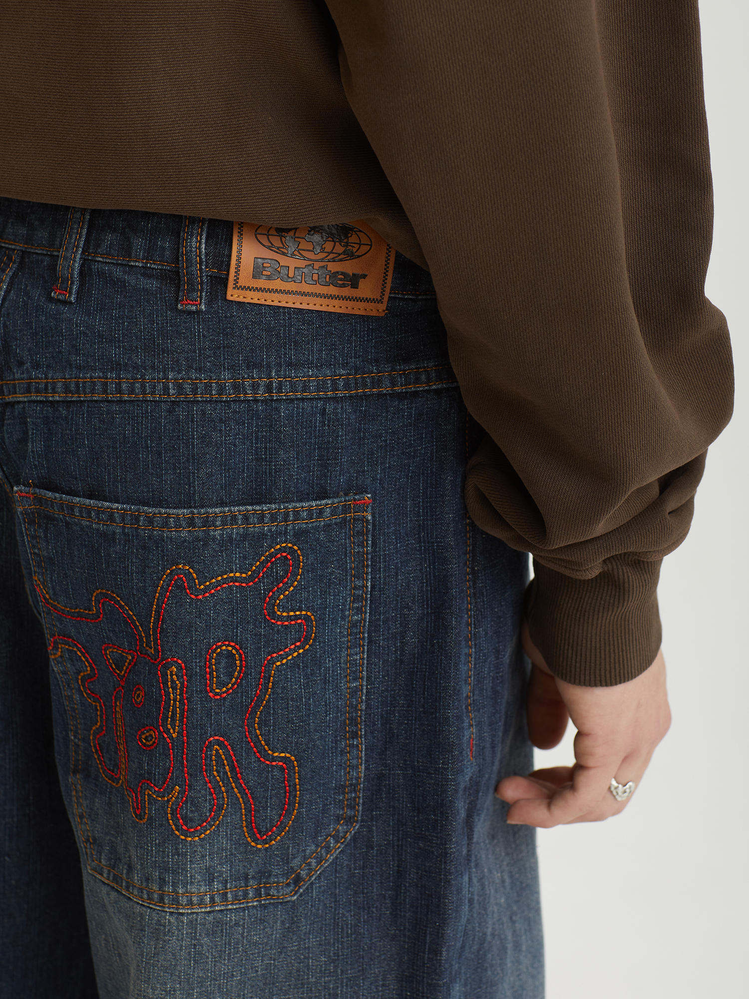 Джинсы Butter Goods выполнены из плотного хлопкового денима и имеют свободный baggy fit — широкий в области бедер и слегка зауженный к низу изделия. Модель отличается легким эффектом винтажности, благодаря фабричной обработке ткани. На поясе расположены шлевки и внутренний шнурок, позволяющий настроить посадку без ремня. Задние накладные карманы дополнены вышивкой цепным стежком, придающей изделию характерный почерк бренда.