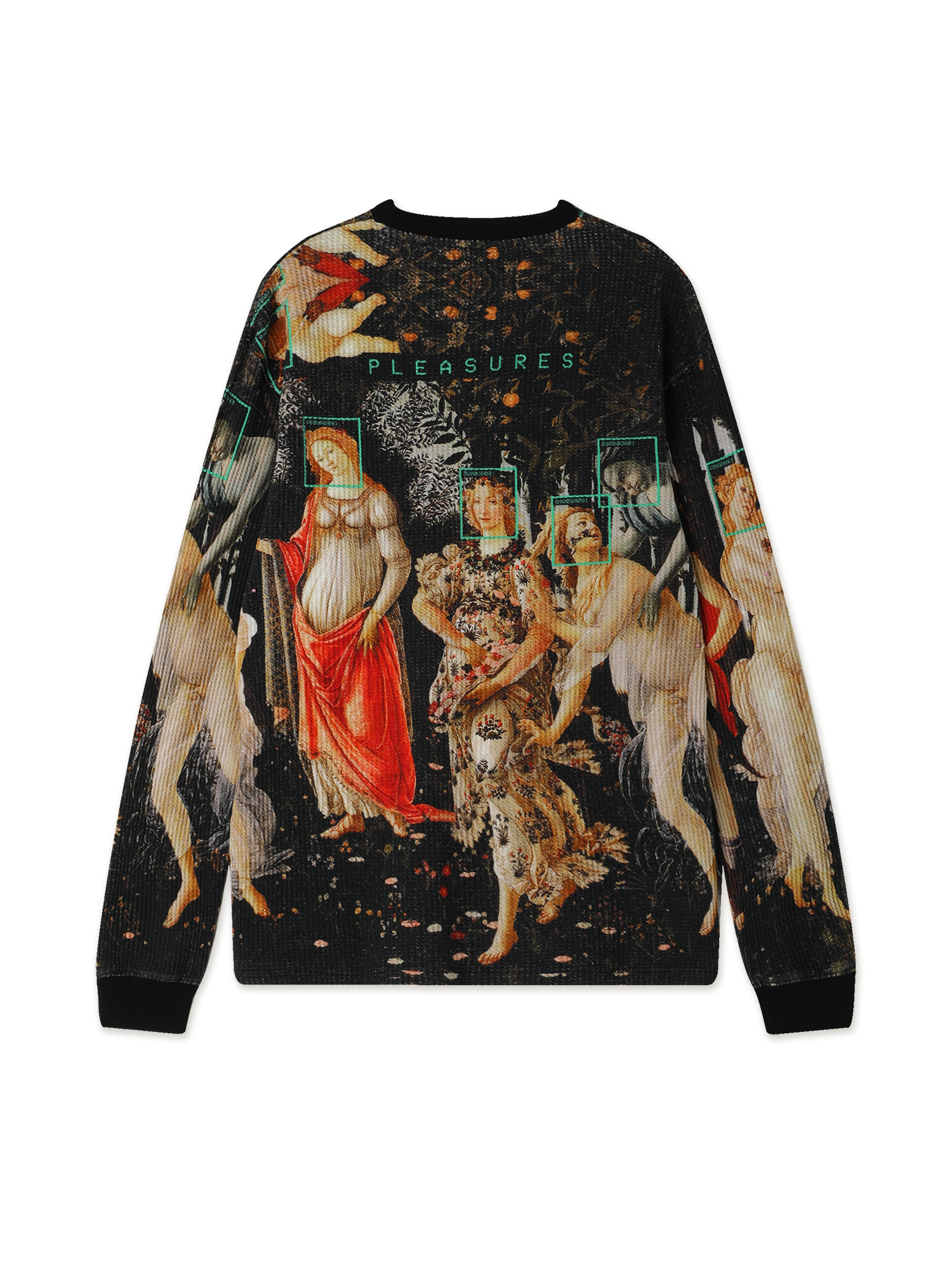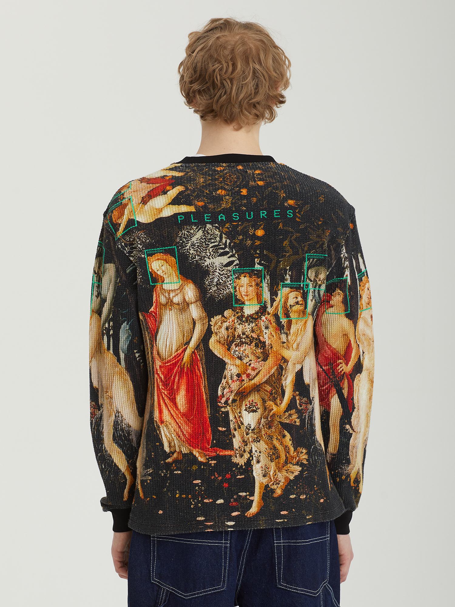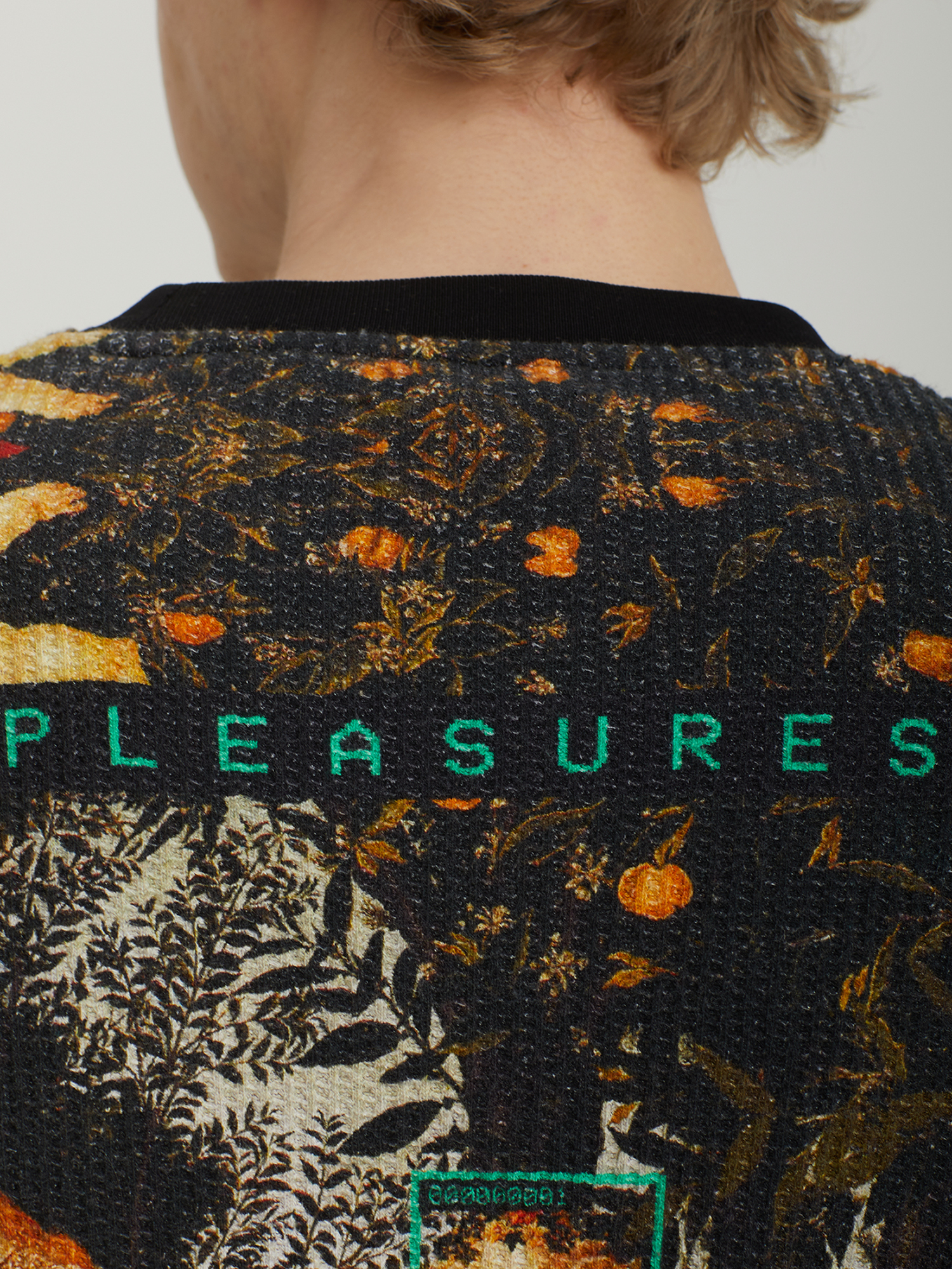 Термальный лонгслив Pleasures из вафельного хлопкового джерси. Изделие дополнено сплошным графическим принтом.