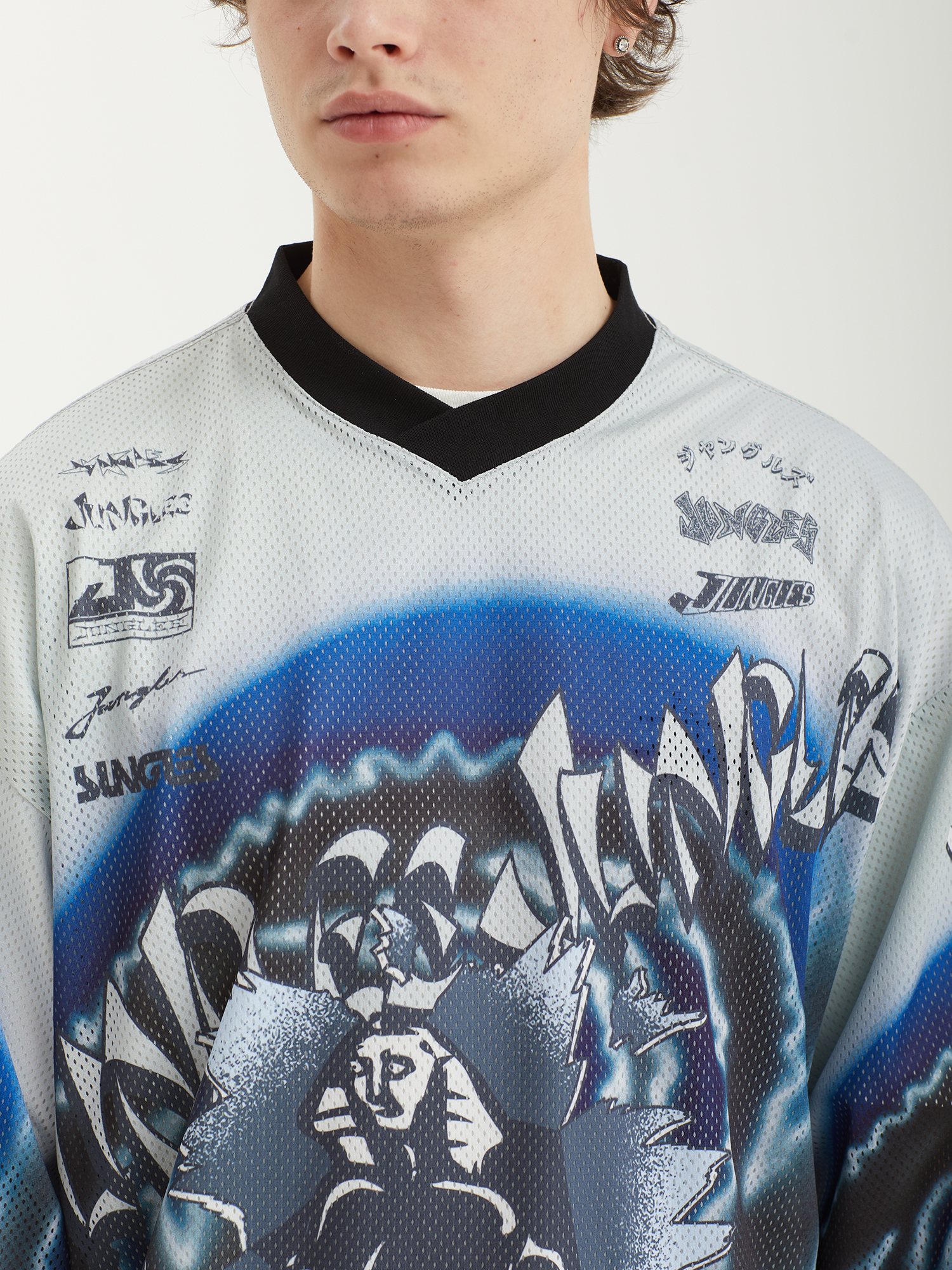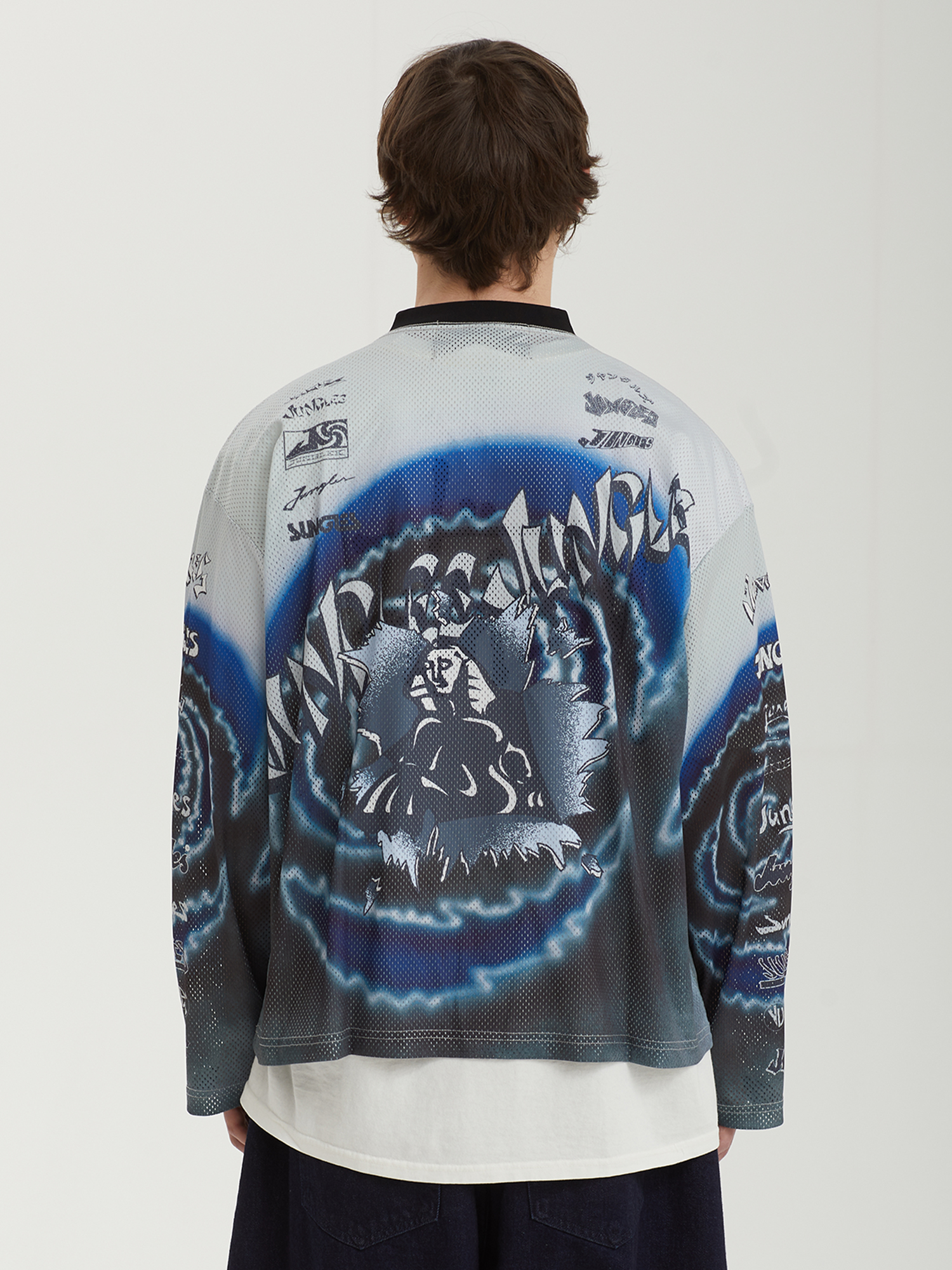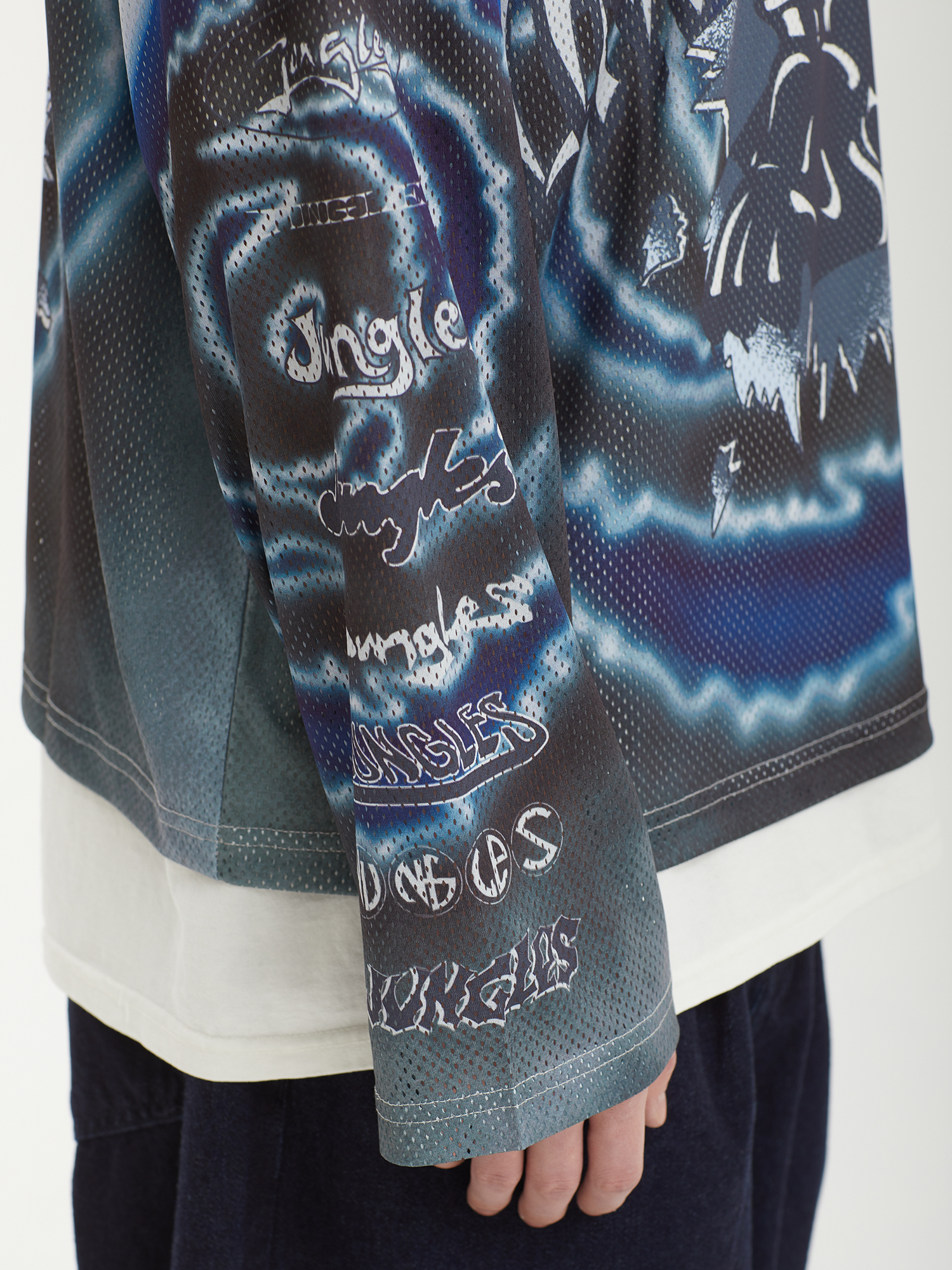 Джерси из сетки Jungles Jungles со сплошным сезонным принтом и архивными логотипами бренда. Бренд прошел сертификацию BSCI — инициативы по соблюдению социальных норм бизнеса.