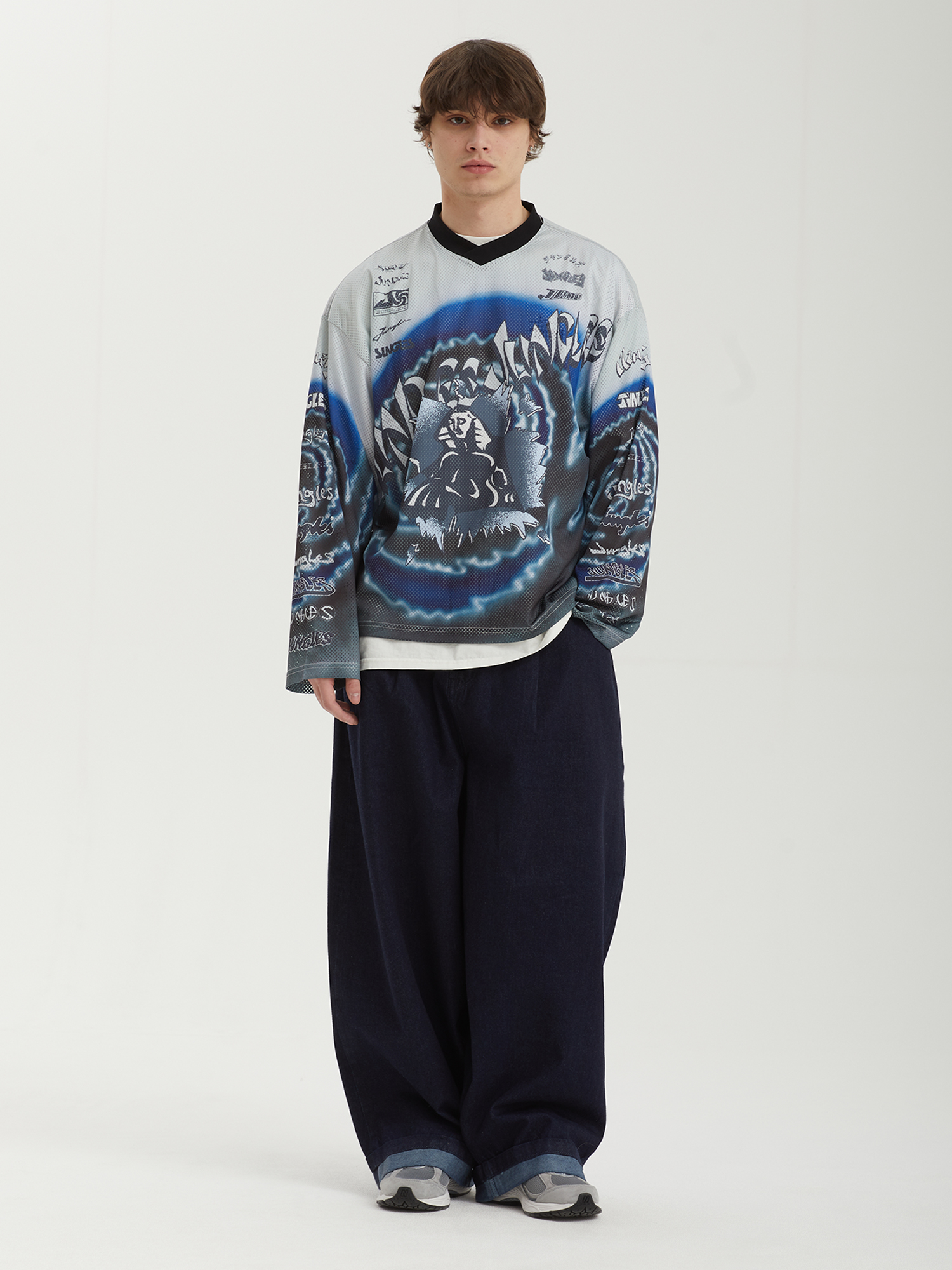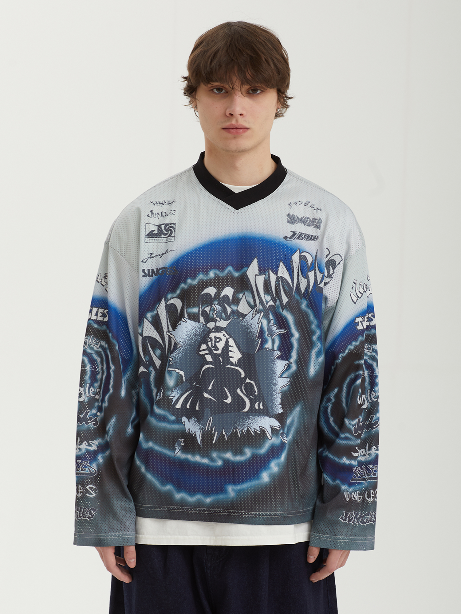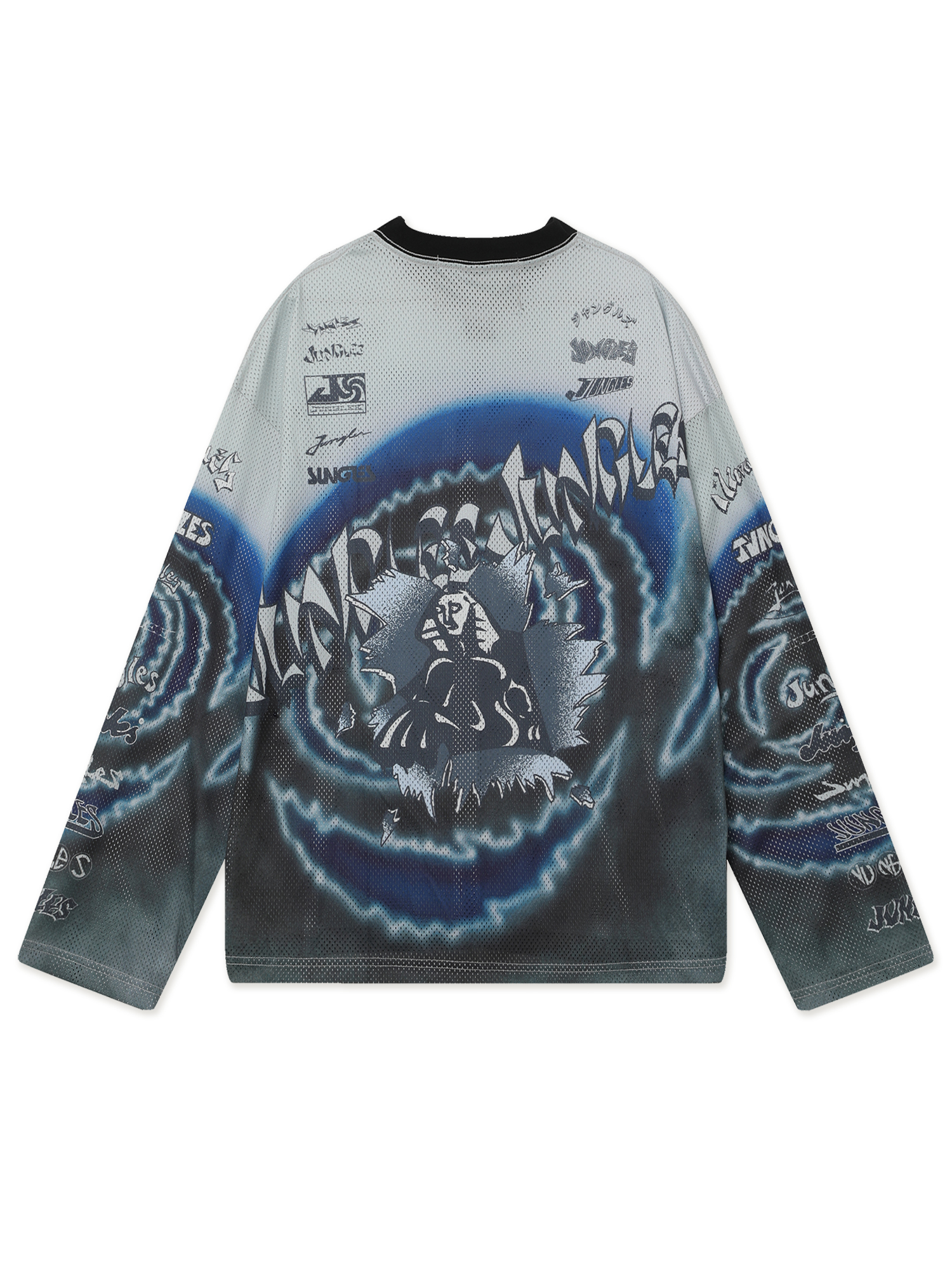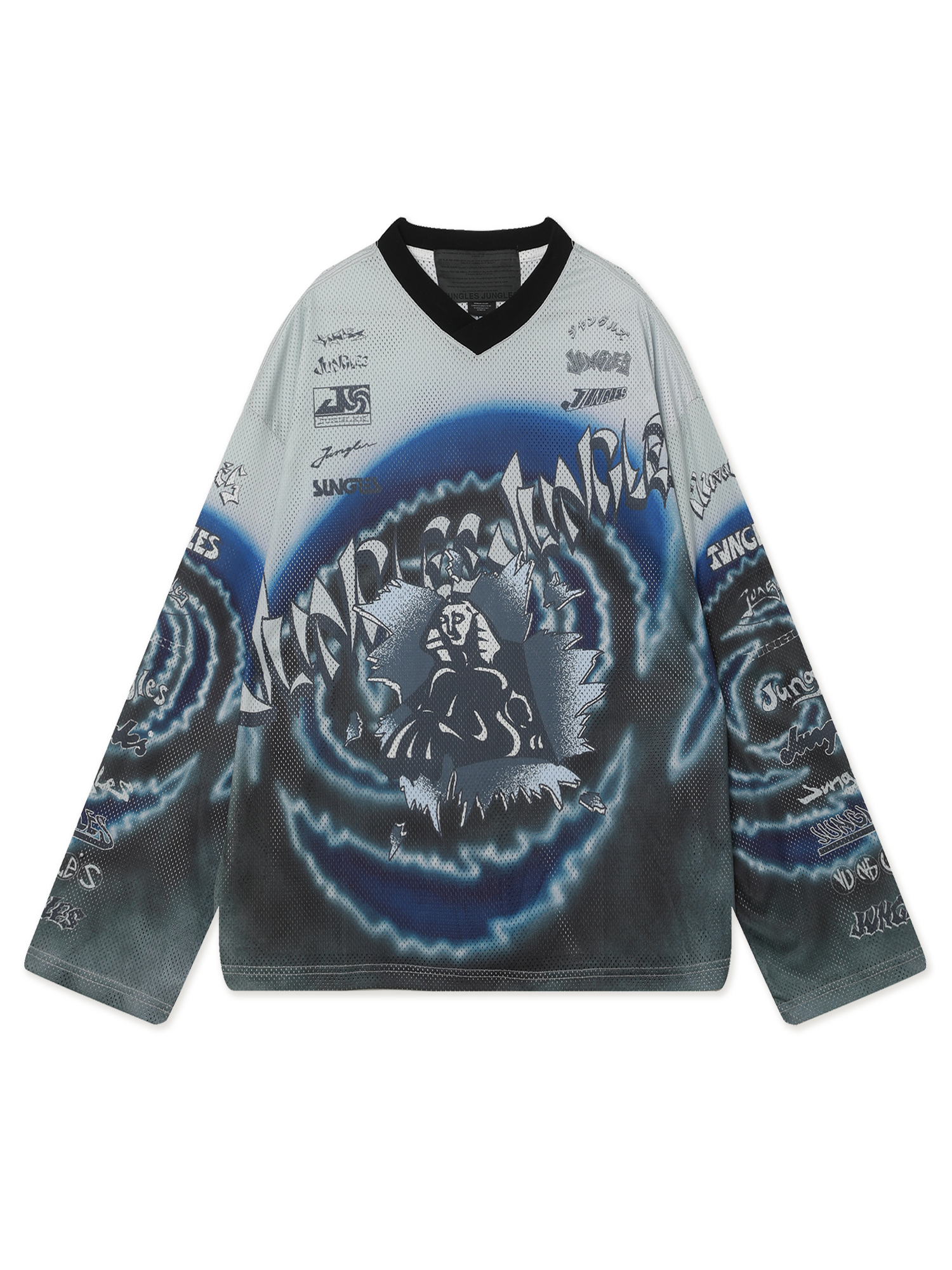 Джерси из сетки Jungles Jungles со сплошным сезонным принтом и архивными логотипами бренда. Бренд прошел сертификацию BSCI — инициативы по соблюдению социальных норм бизнеса.