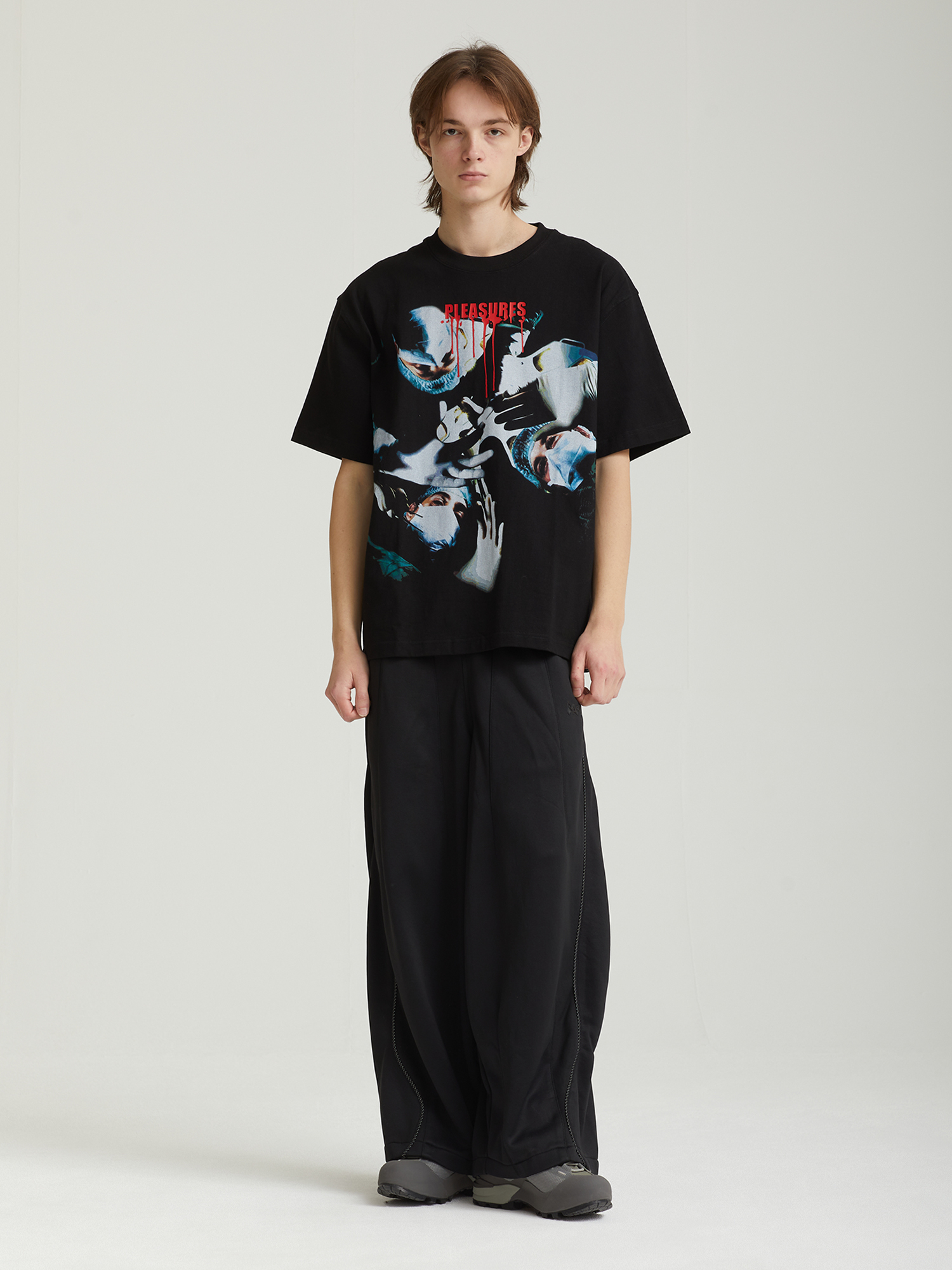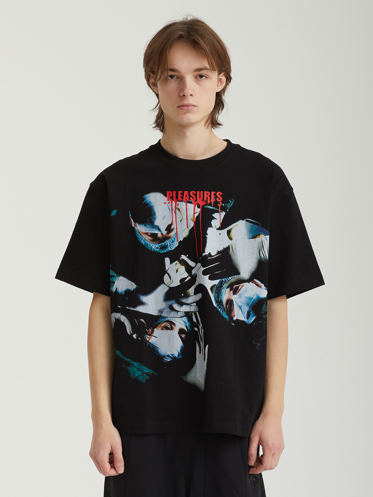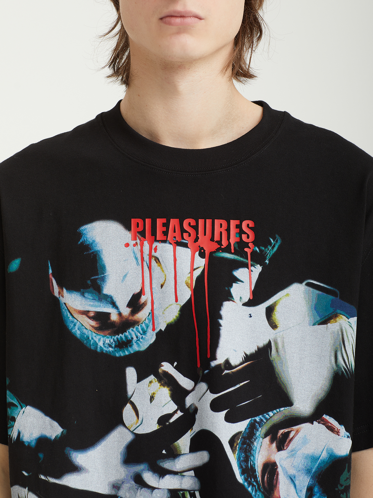 Футболка Pleasures выполнена из плотного хлопкового трикотажа и оформлена крупным графическим принтом на фронтальной части.