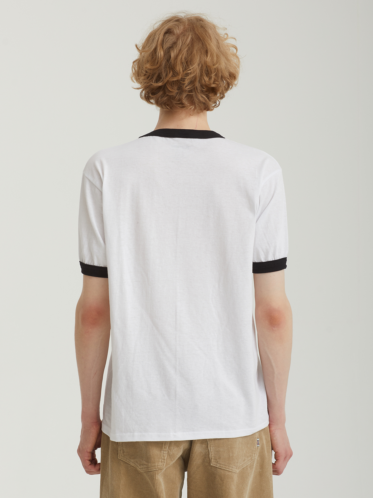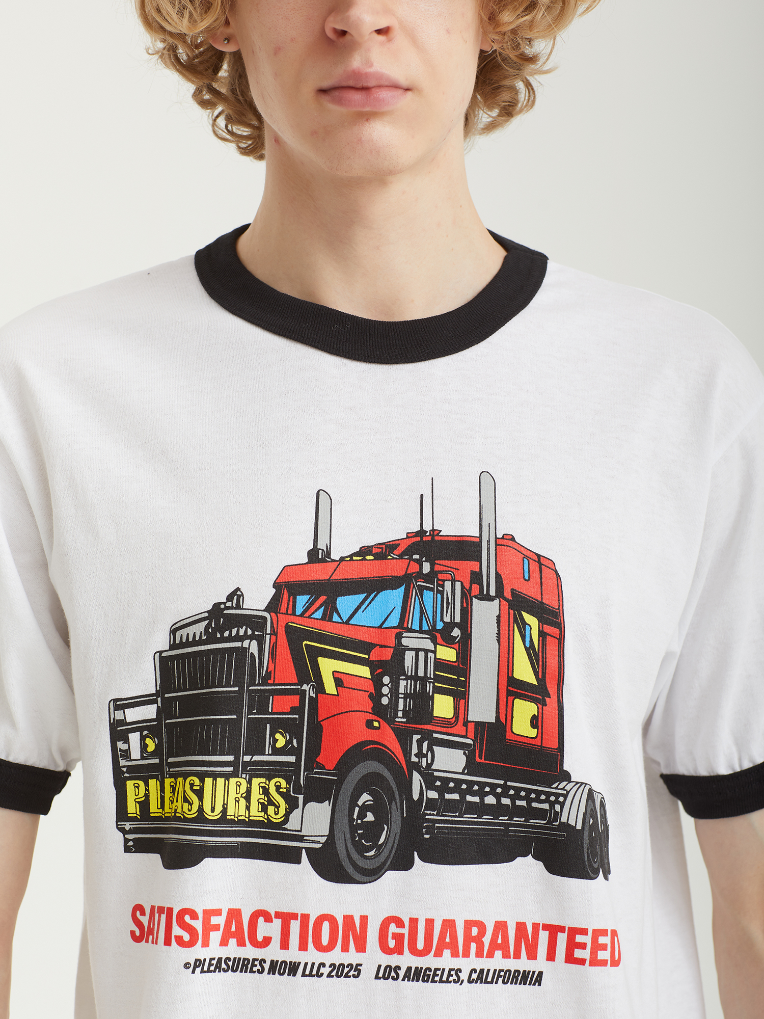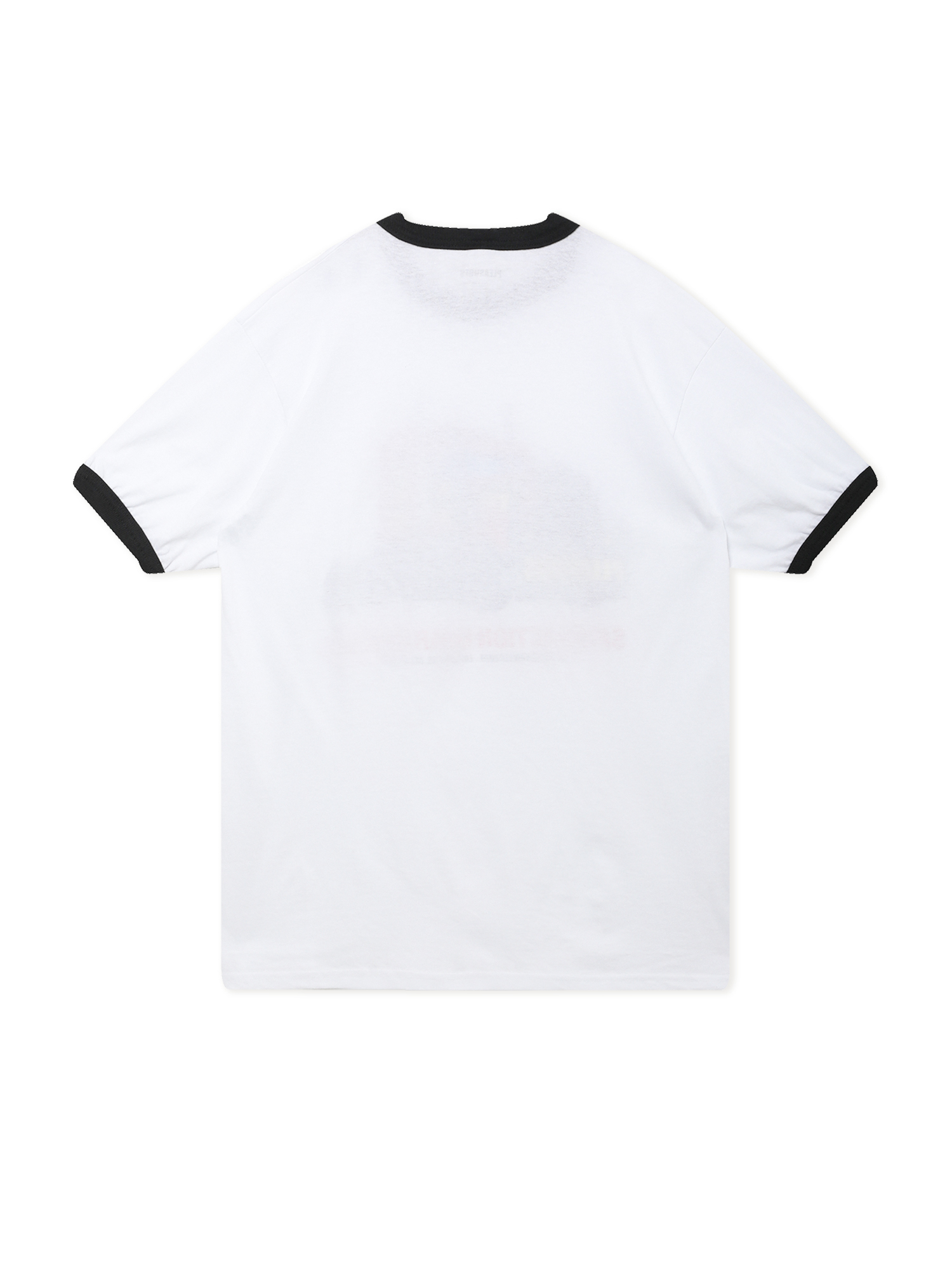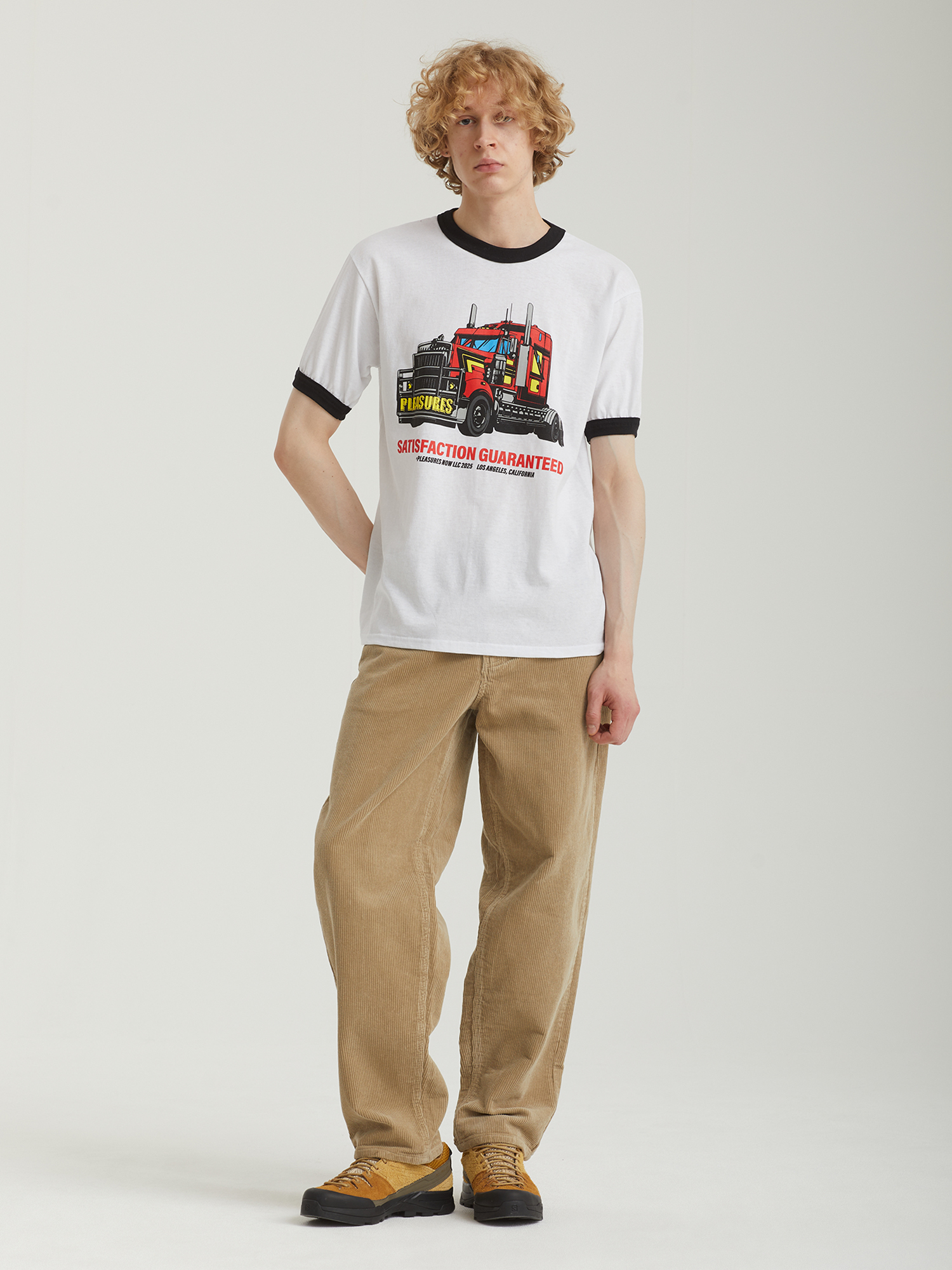 Хлопковая футболка Pleasures с контрастной отделкой горловины и рукавов. Сезонный графический принт размещен на фронтальной панели.