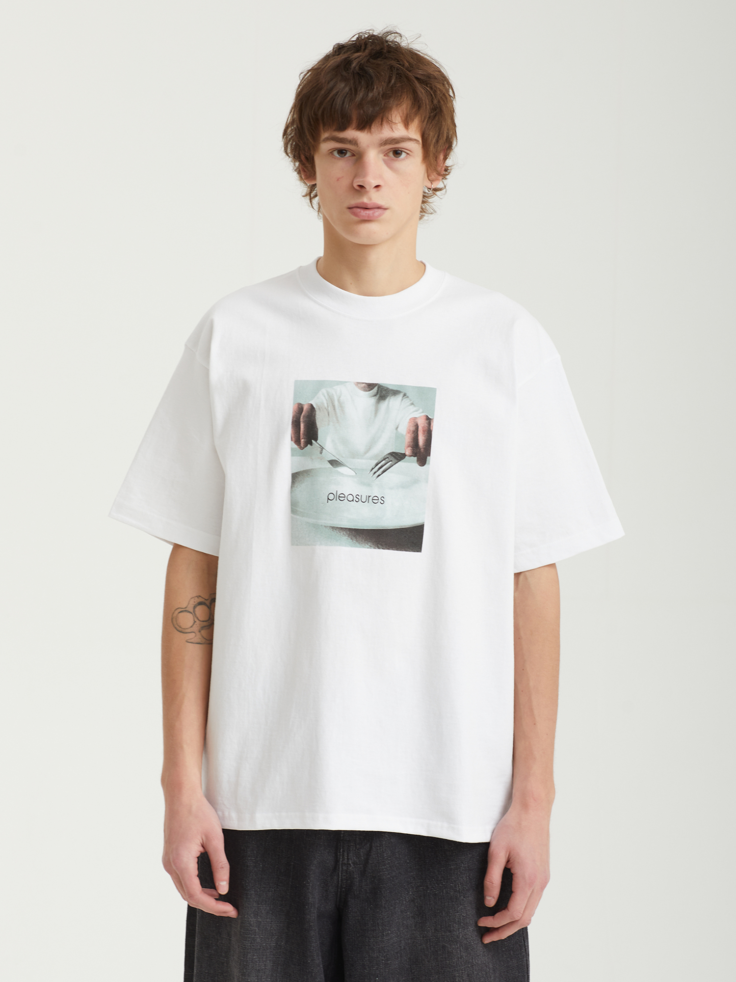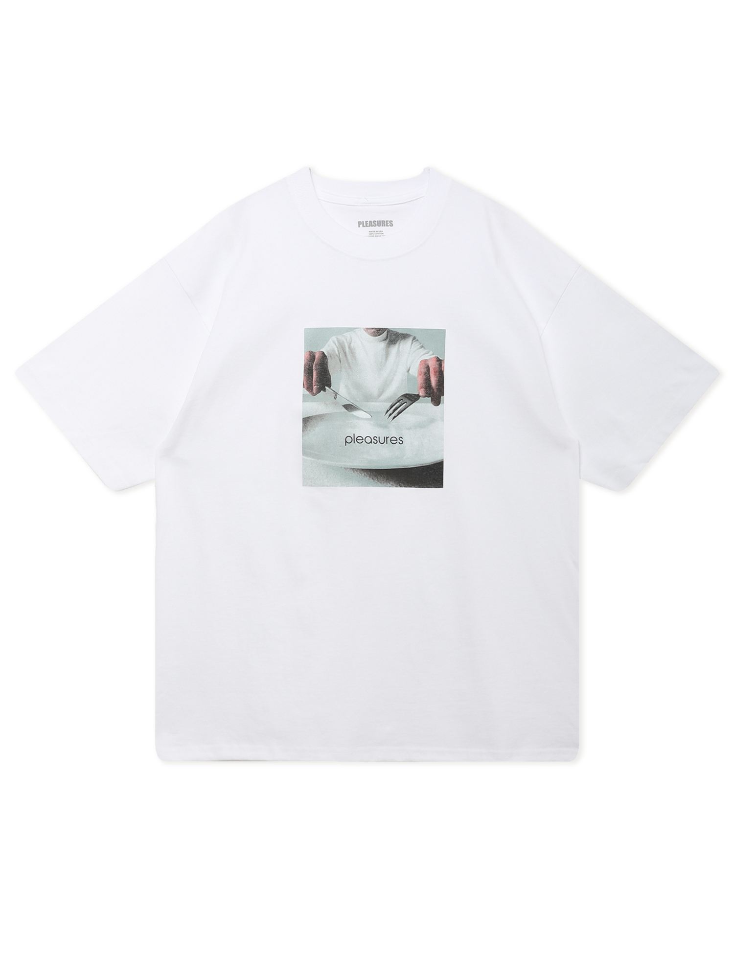 Футболка Pleasures с принтом, основанным на работе Дженезиса Пи-Орриджа. Модель стала частью официальной коллаборации с наследственным фондом английского музыканта.