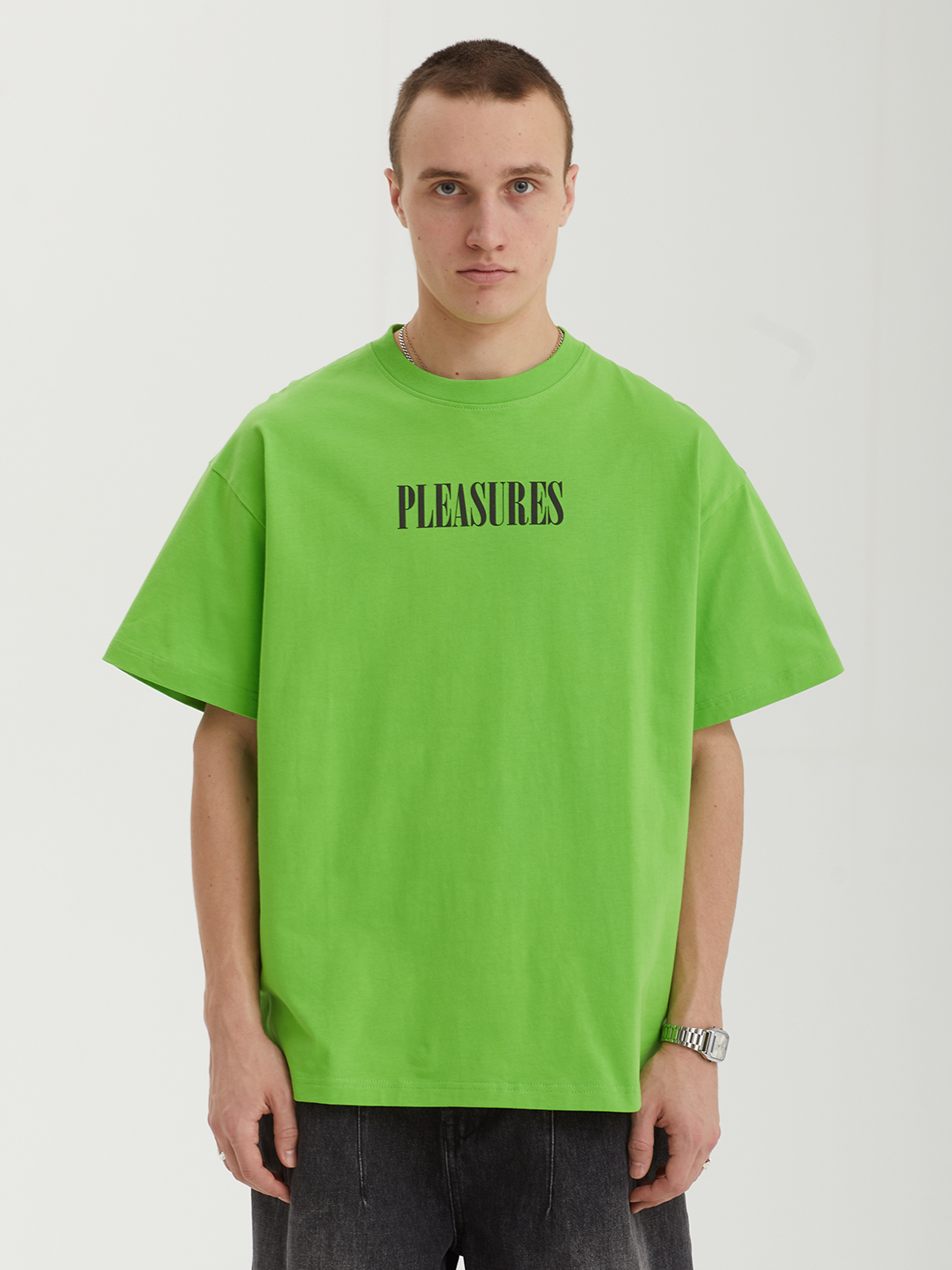 Футболка Pleasures из хлопкового джерси с крупным принтом на спине и логотипом бренда на груди.