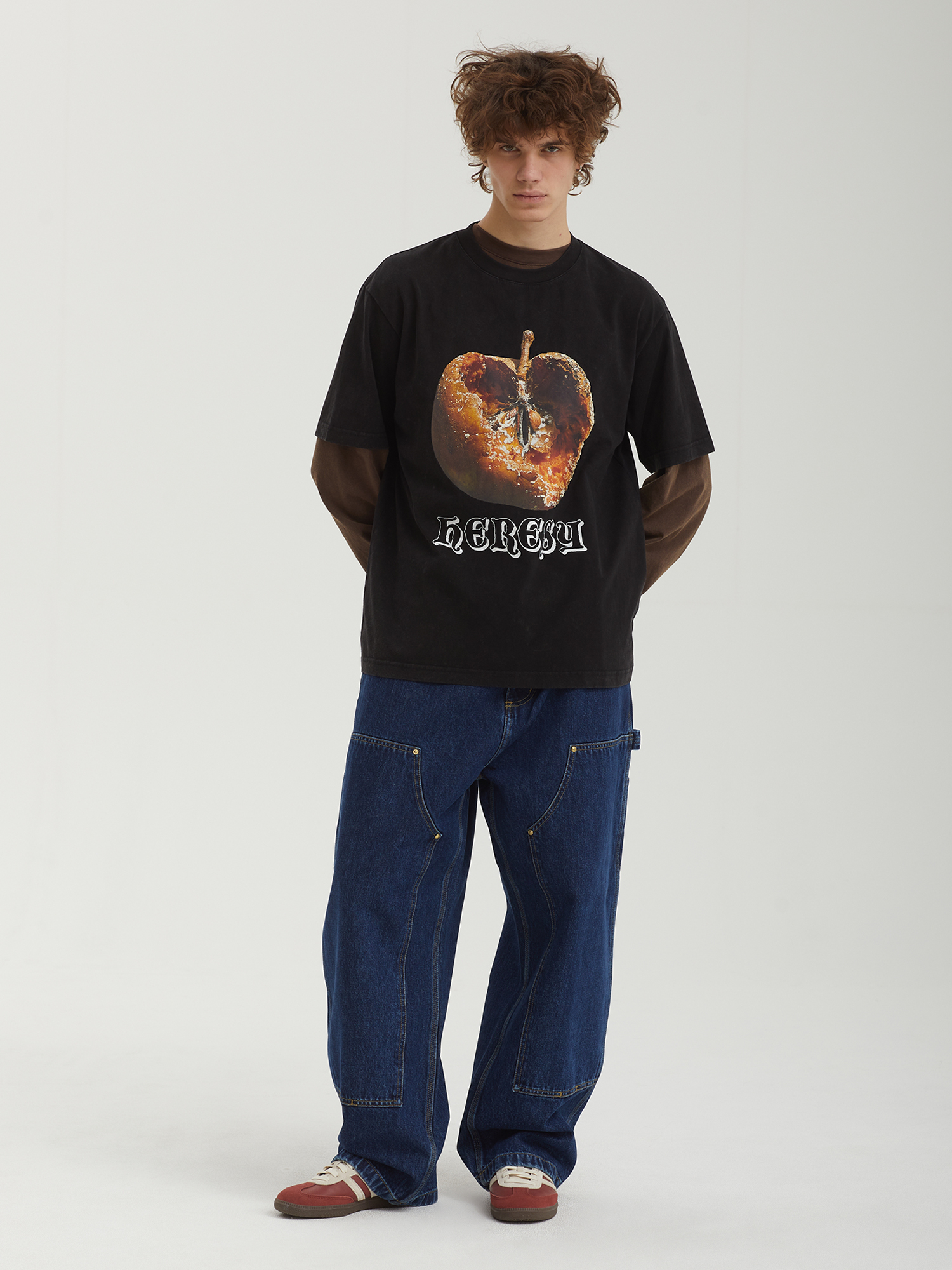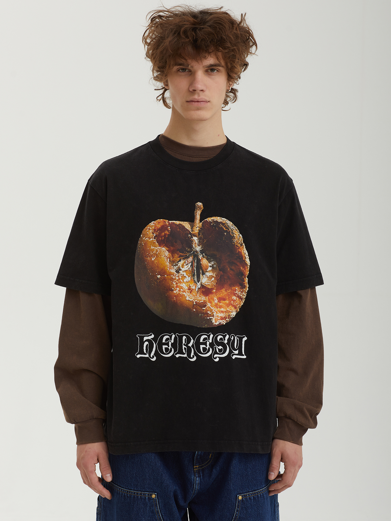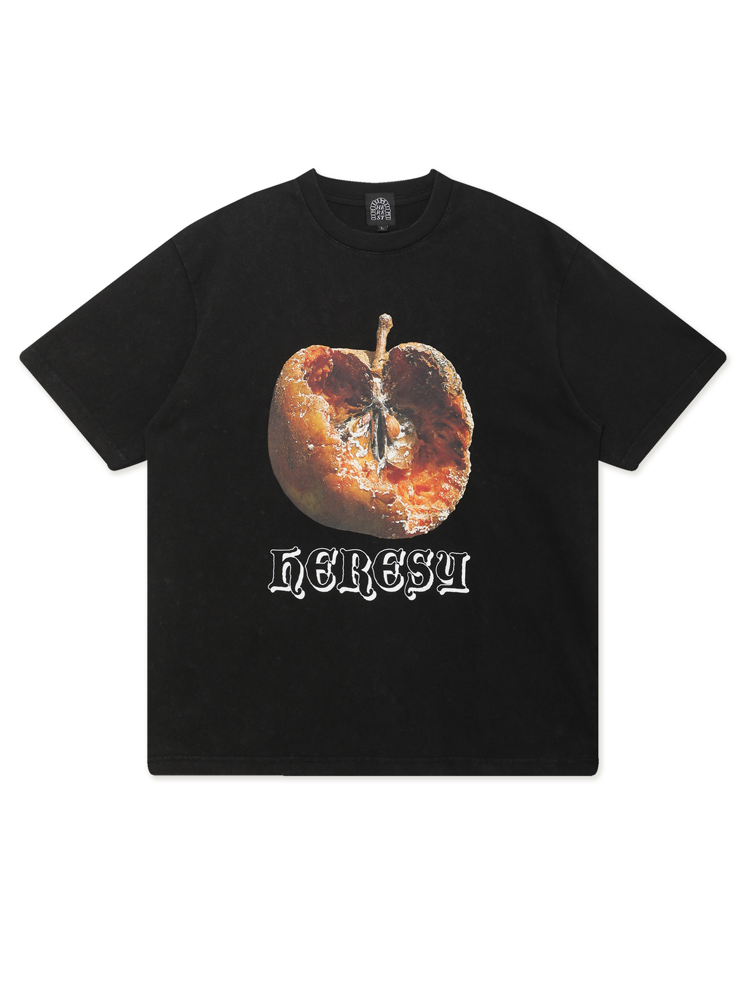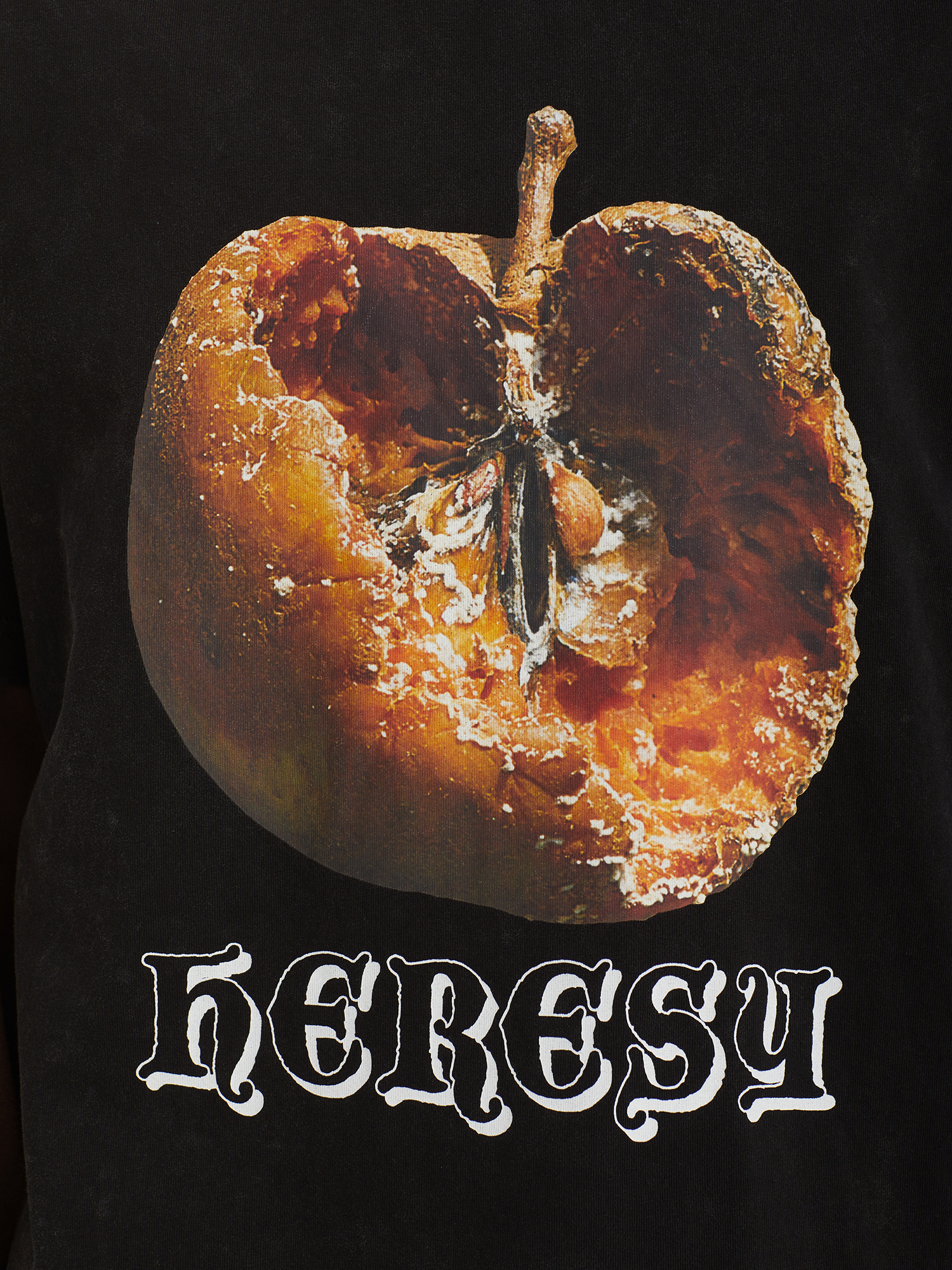 Футболка Heresy из плотного хлопкового джерси с сезонным принтом. Изделие предварительно выстирано для минимизации усадки и получения винтажного эффекта.