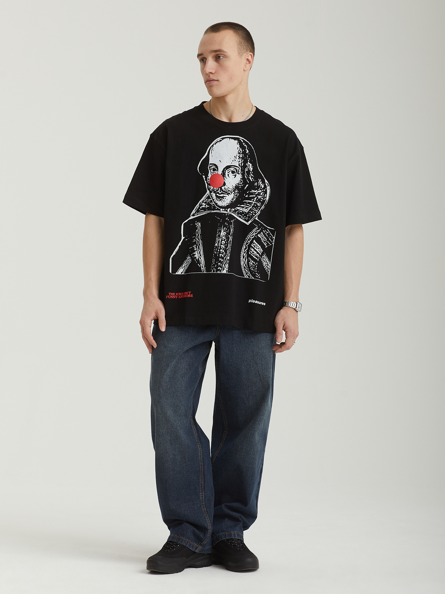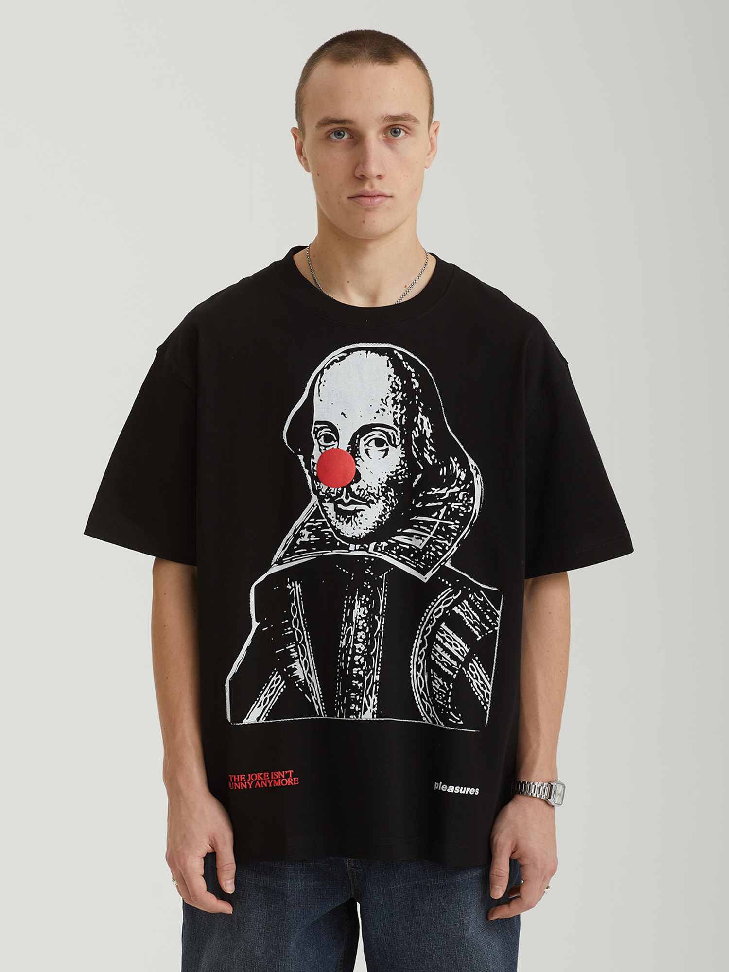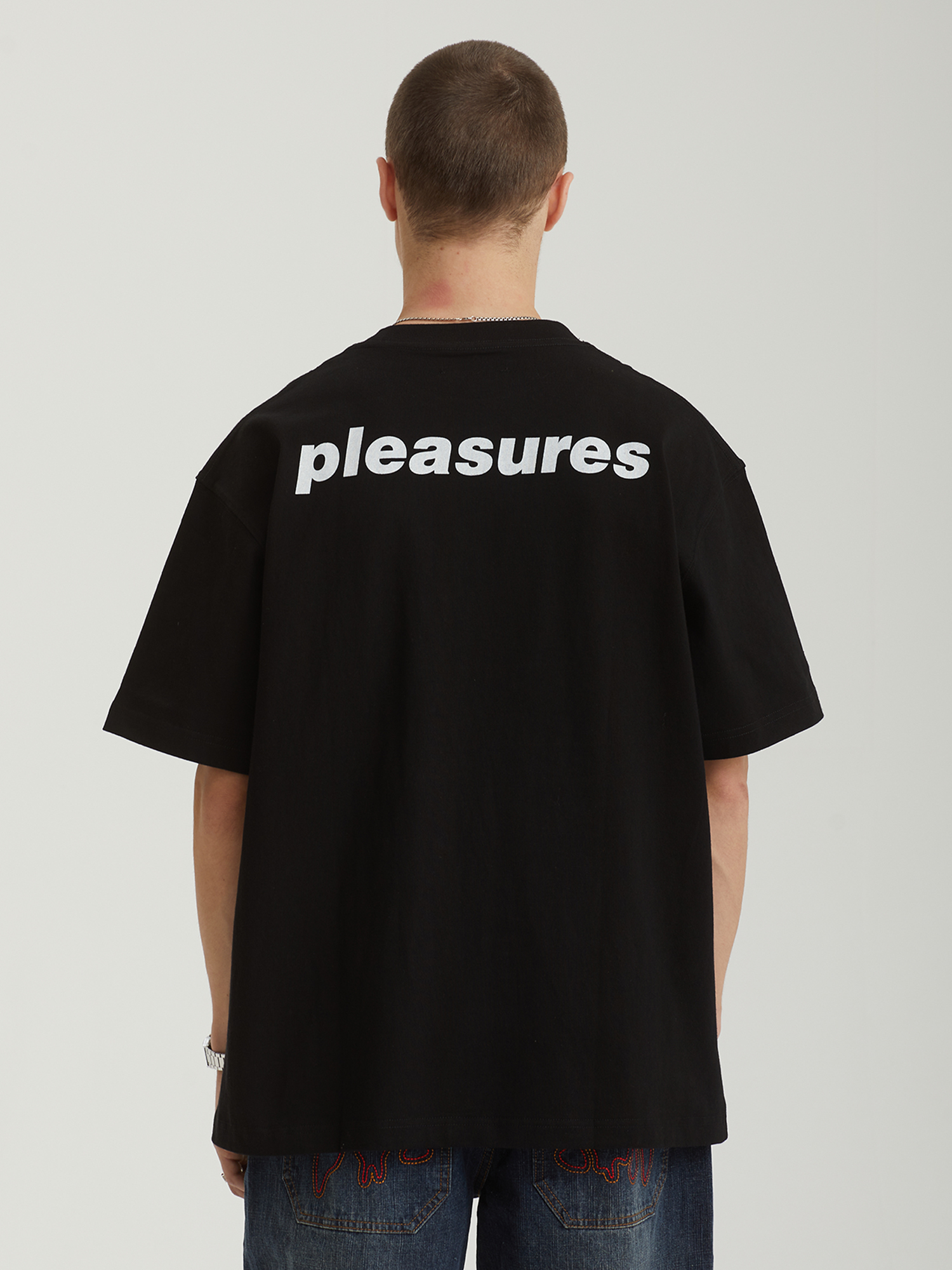 Футболка Pleasures выполнена из плотного хлопкового трикотажа. Модель отличается свободным boxy-cилуэтом и трафаретными принтами с обеих сторон.