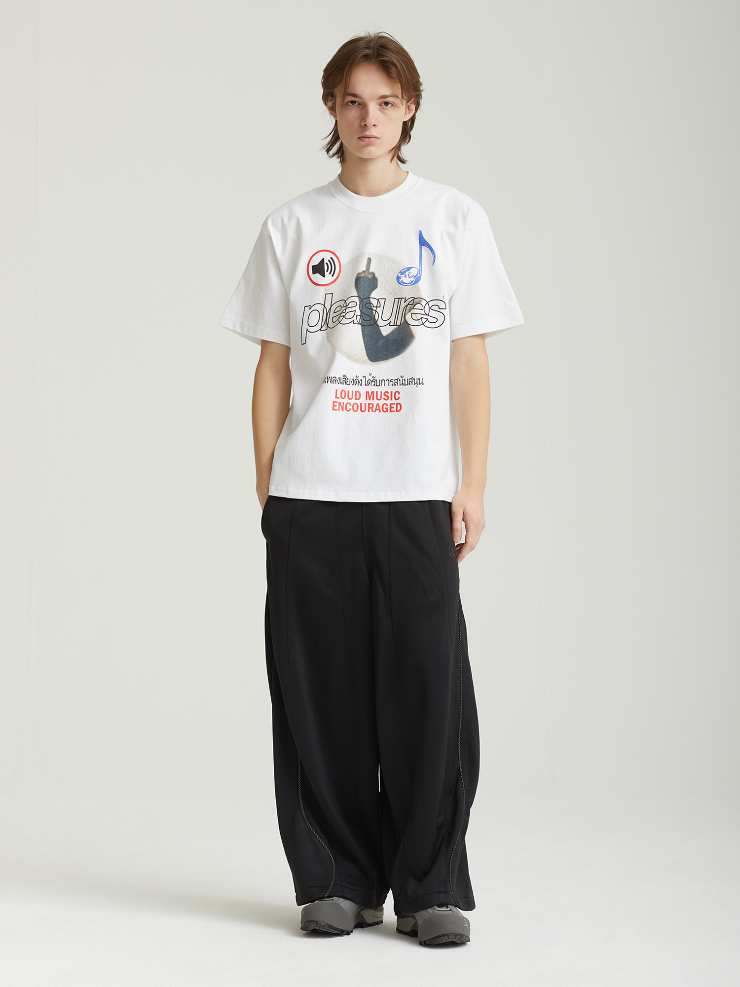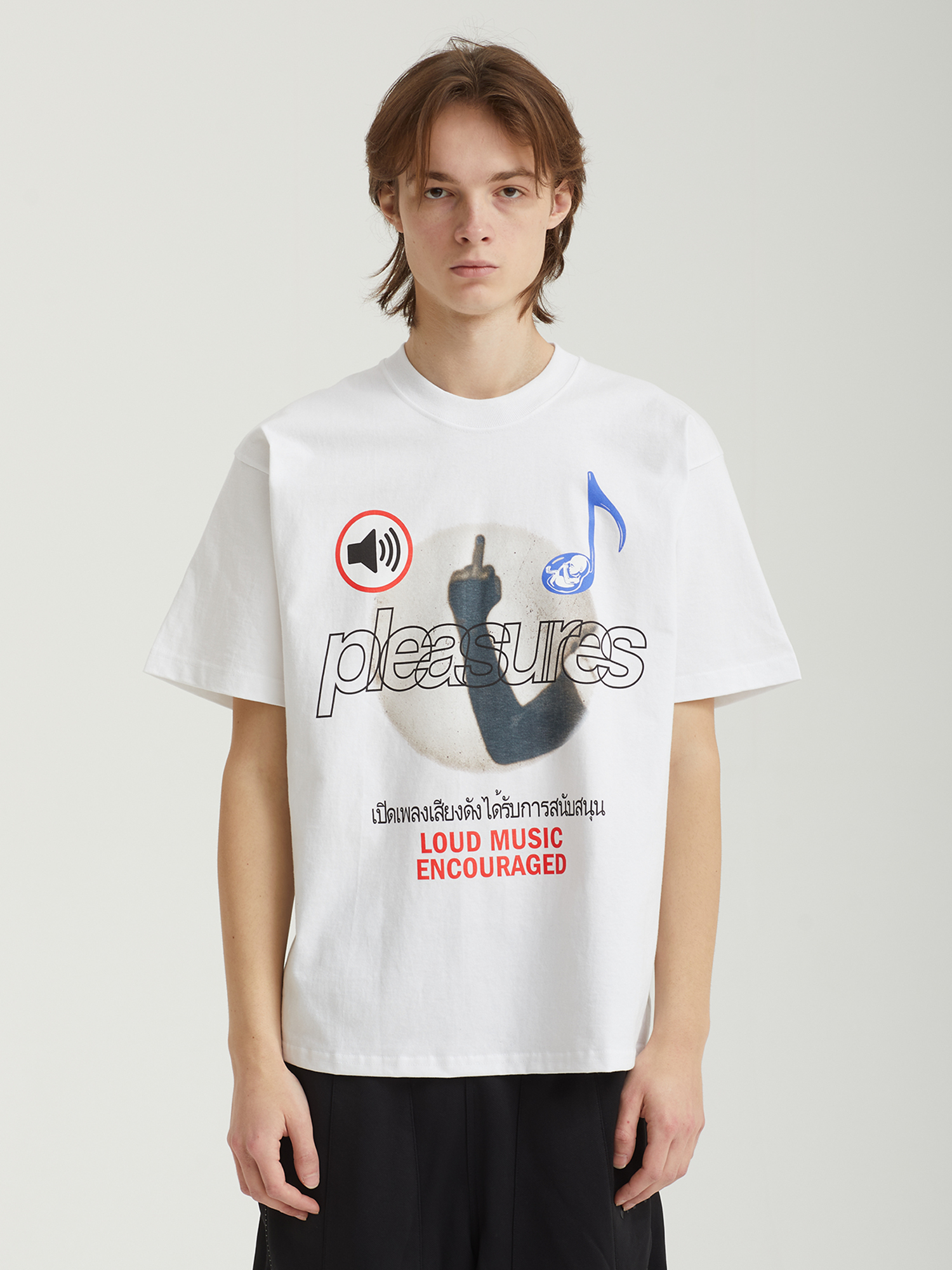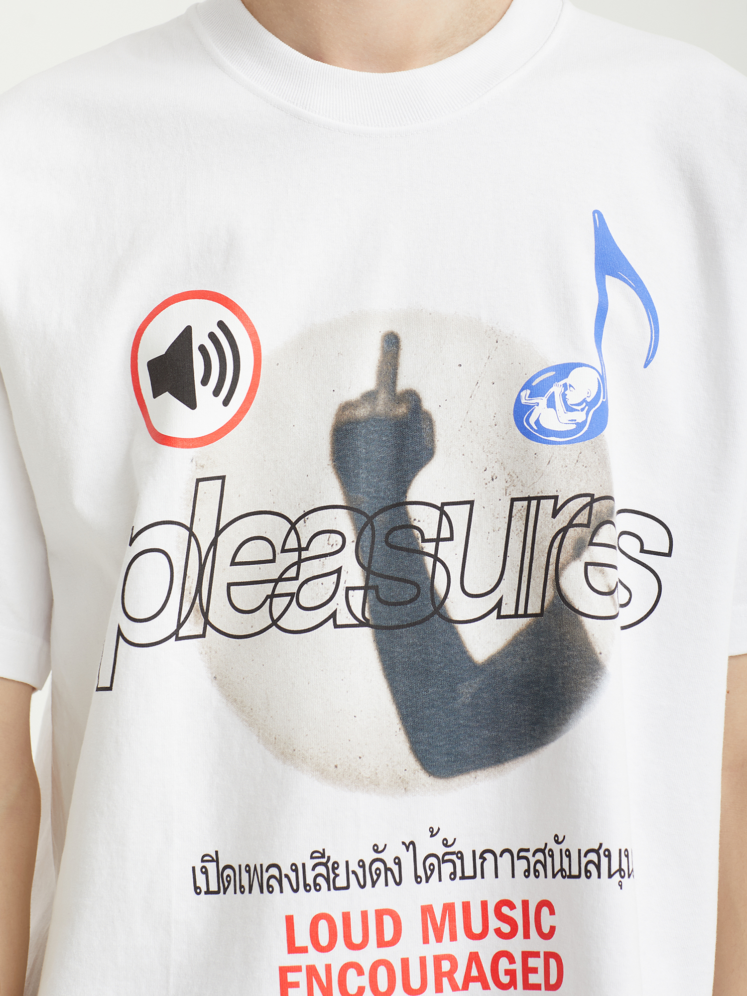 Футболка Pleasures, созданная совместно с лондонским проектом Boiler Room. Модель выполнена из плотного хлопкового трикотажа и оформлена графическими принтами с обеих сторон.