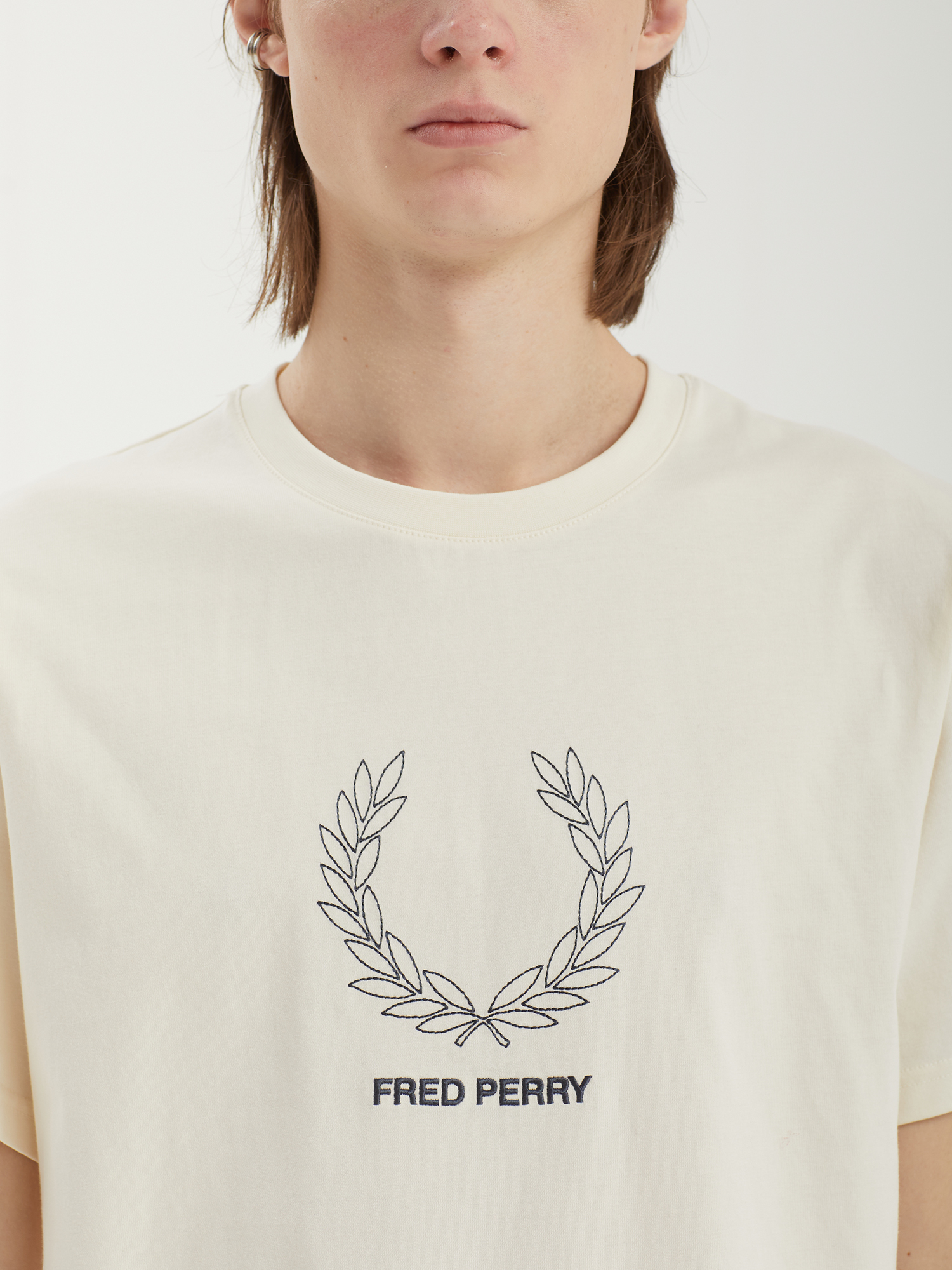 Футболка Fred Perry из плотного хлопкового джерси. Модель дополнена вышитым лавровым венком на фронтальной панели — ключевым символом бренда и его ценностей.
