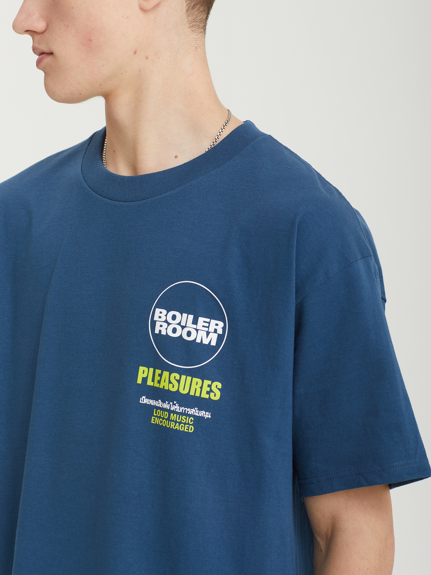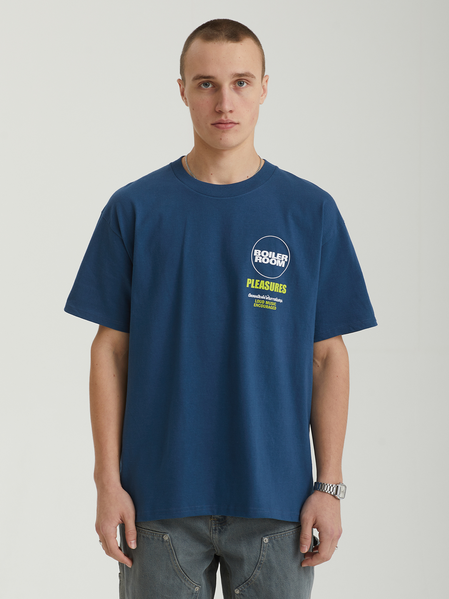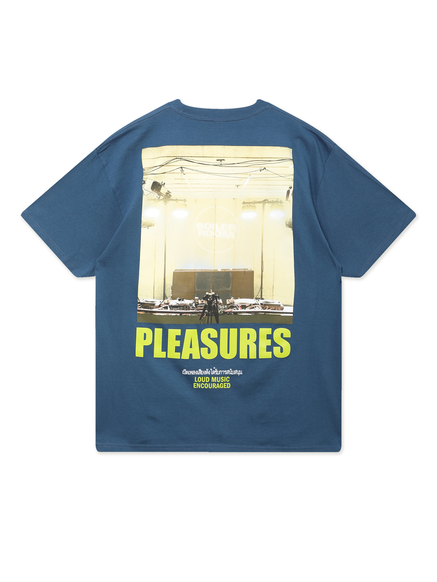 Футболка Pleasures, созданная совместно с лондонским проектом Boiler Room. Модель изготовлена из плотного хлопкового трикотажа и украшена фирменными принтами с обеих сторон.