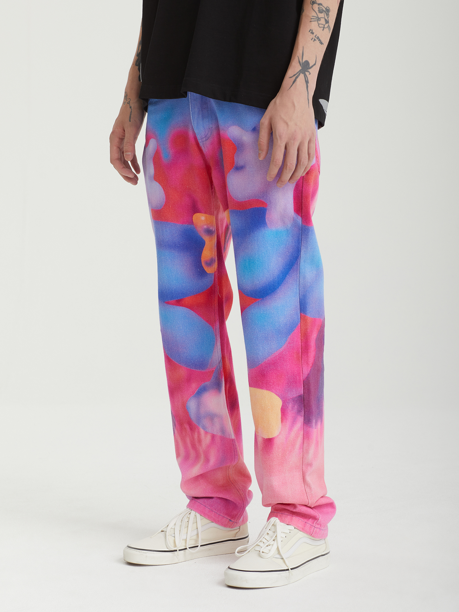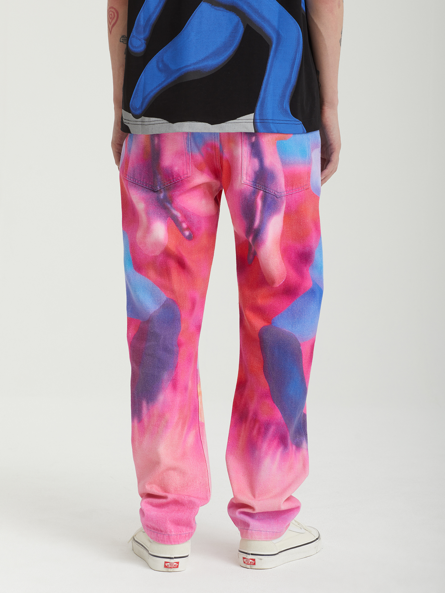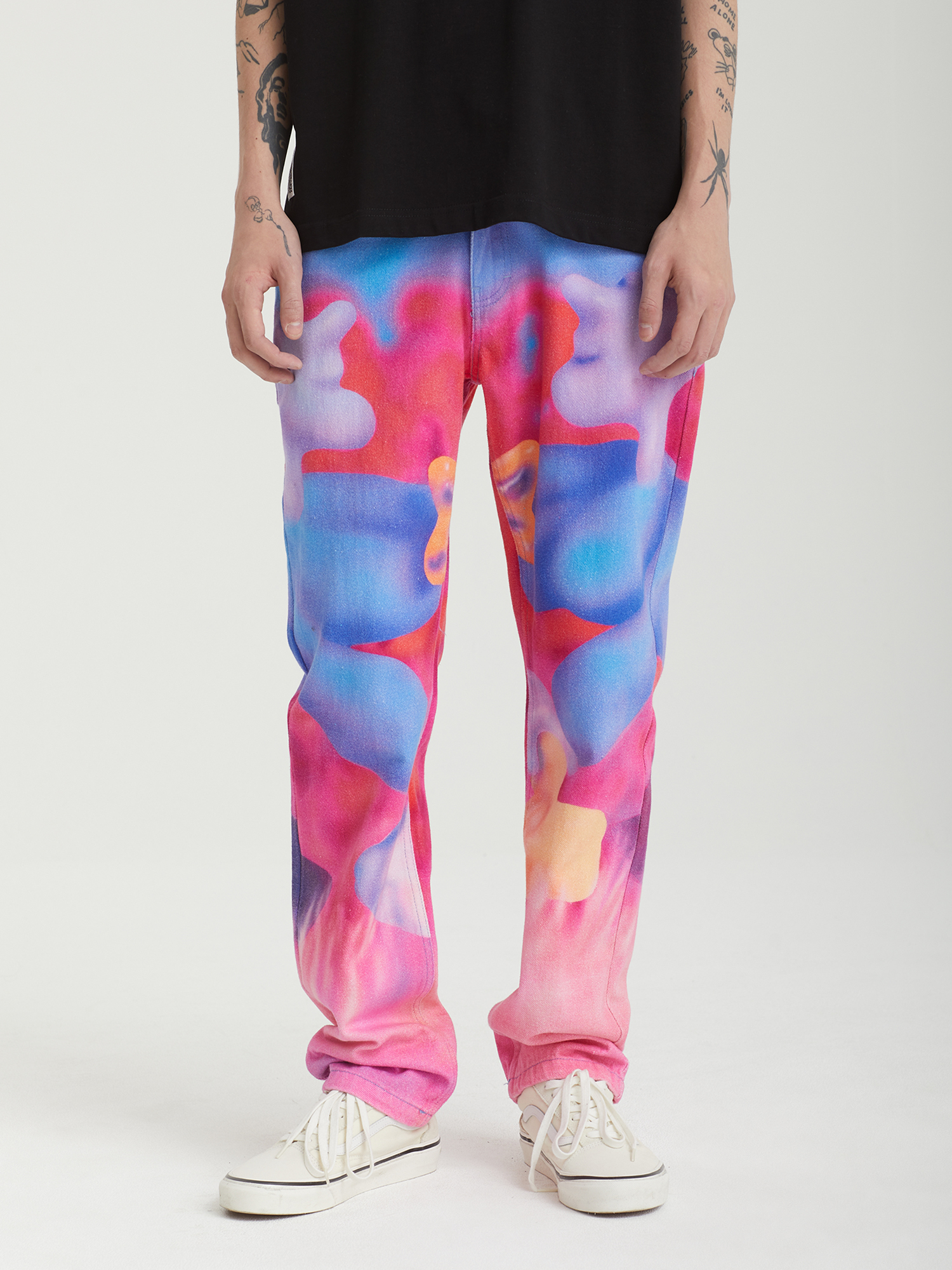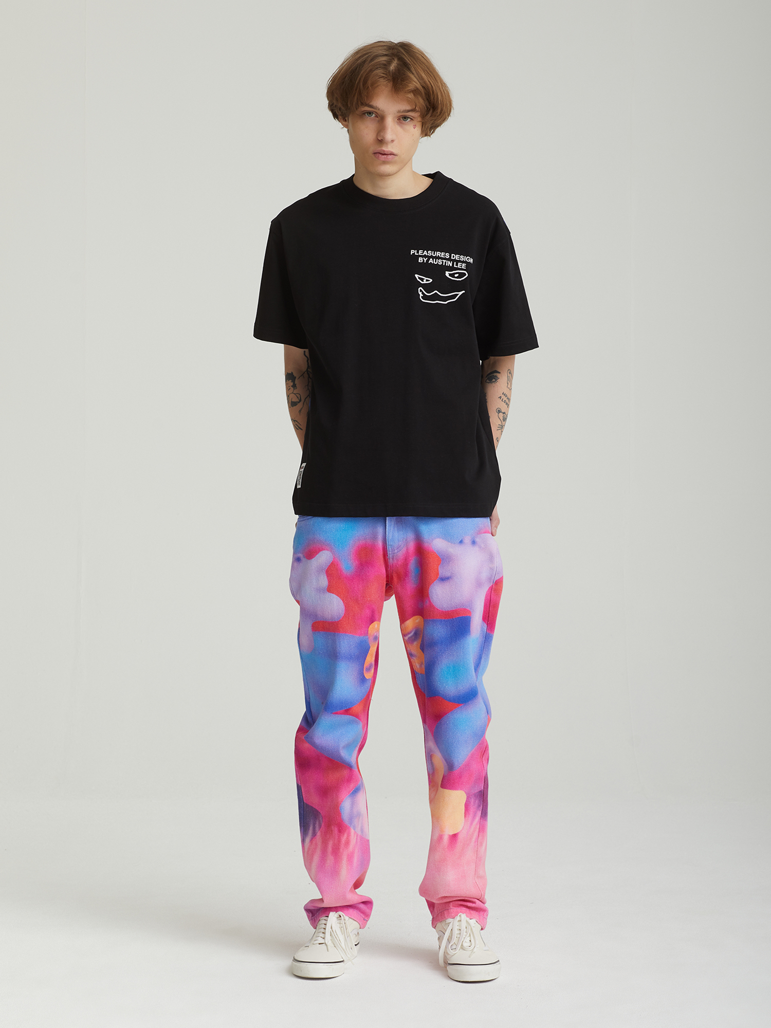 Джинсы Pleasures из плотного хлопкового денима, выстиранного для мягкости. Изделие дополнено принтом с графикой нью-йоркского художника Остина Ли (Austin Lee).