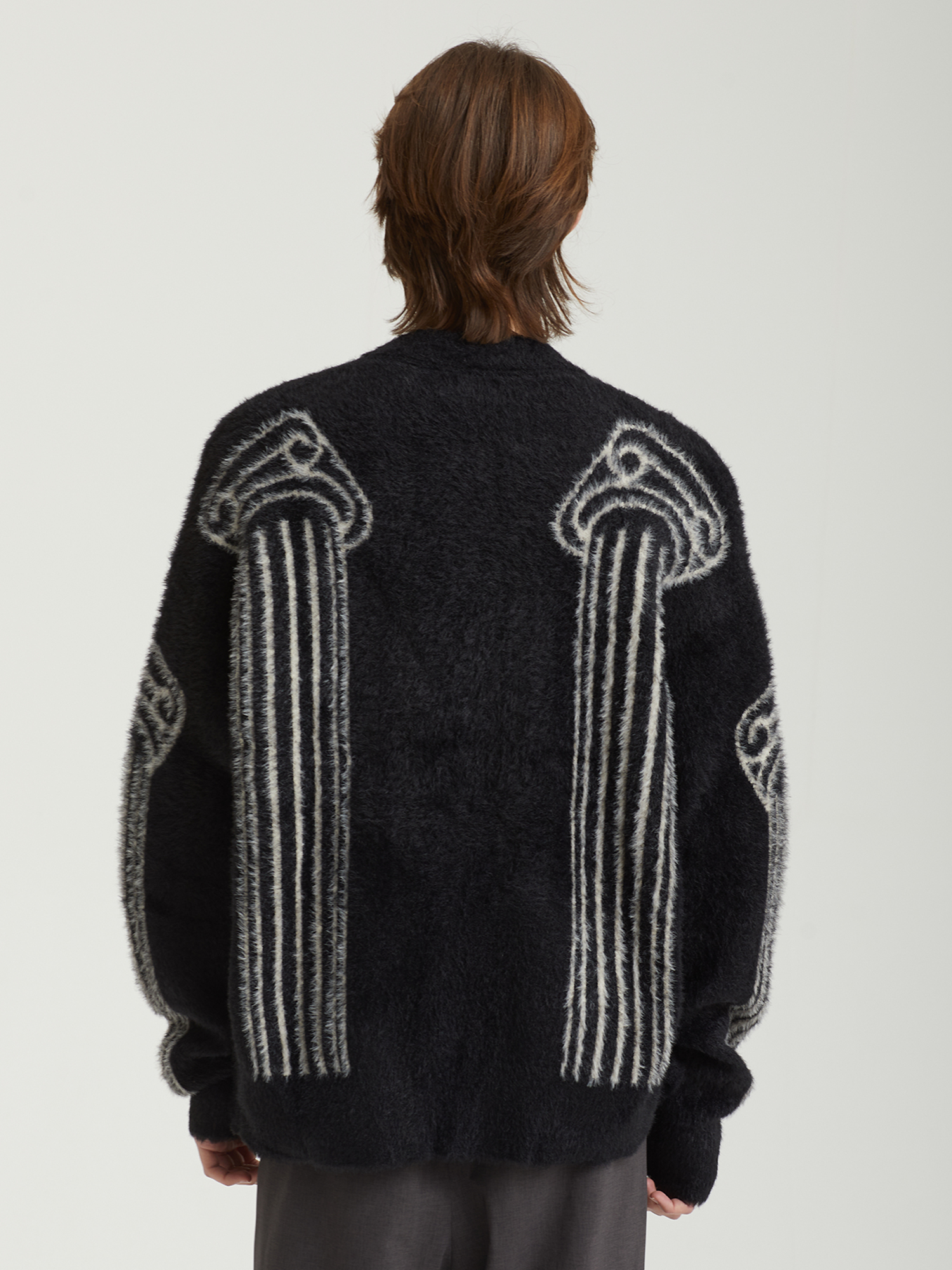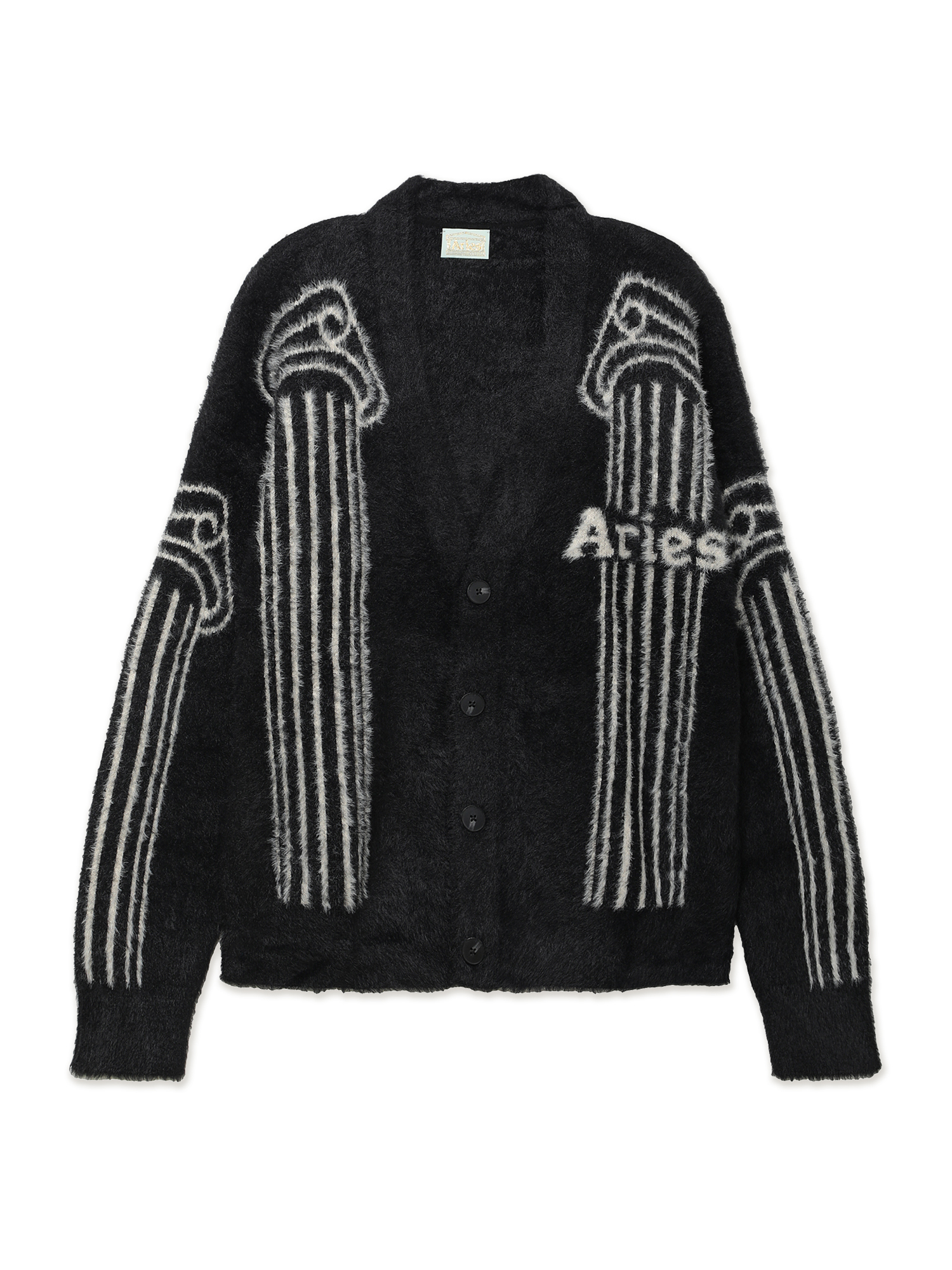 Кардиган Aries выполнен из шенилловой пряжи, придающей изделию бархатистую текстуру и исключительную мягкость. Модель имеет оверсайз-силуэт и оформлена жаккардовым узором в характерной эстетике бренда с обеих сторон.