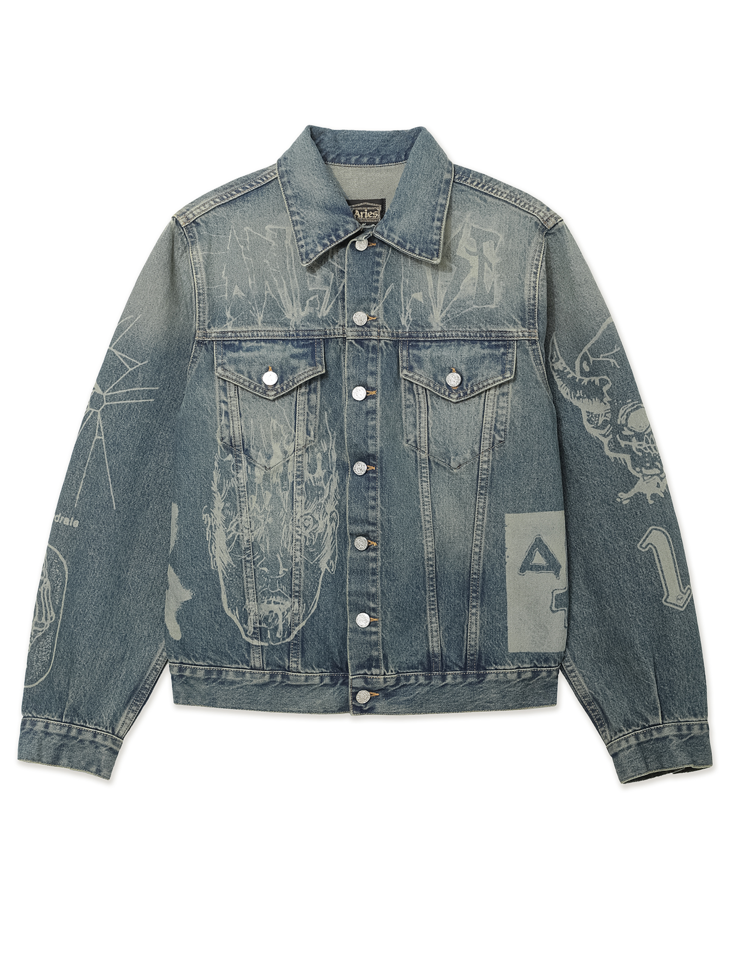 Джинсовая куртка Aries из плотного хлопкового денима. Принты нанесены с помощью лазера.