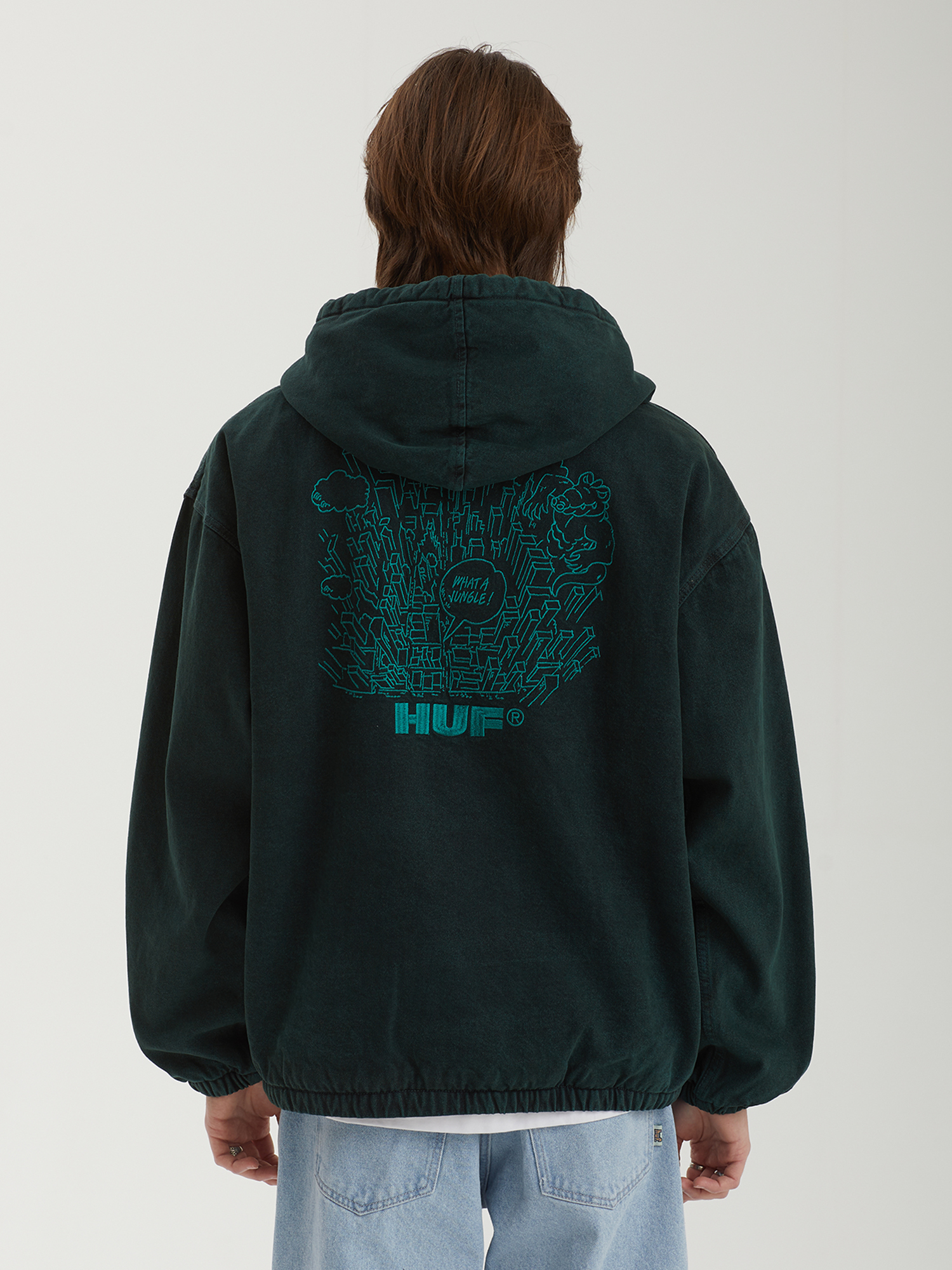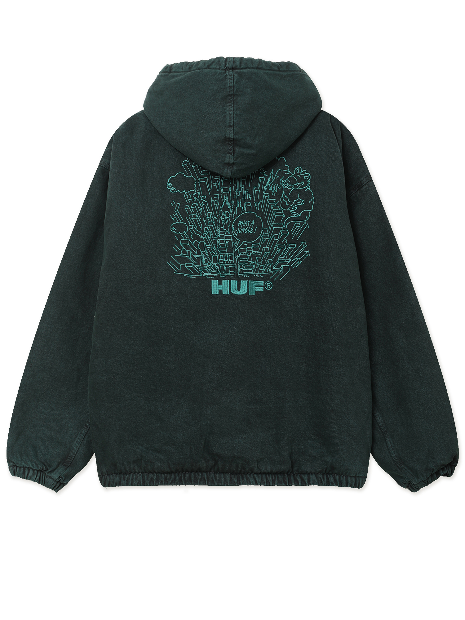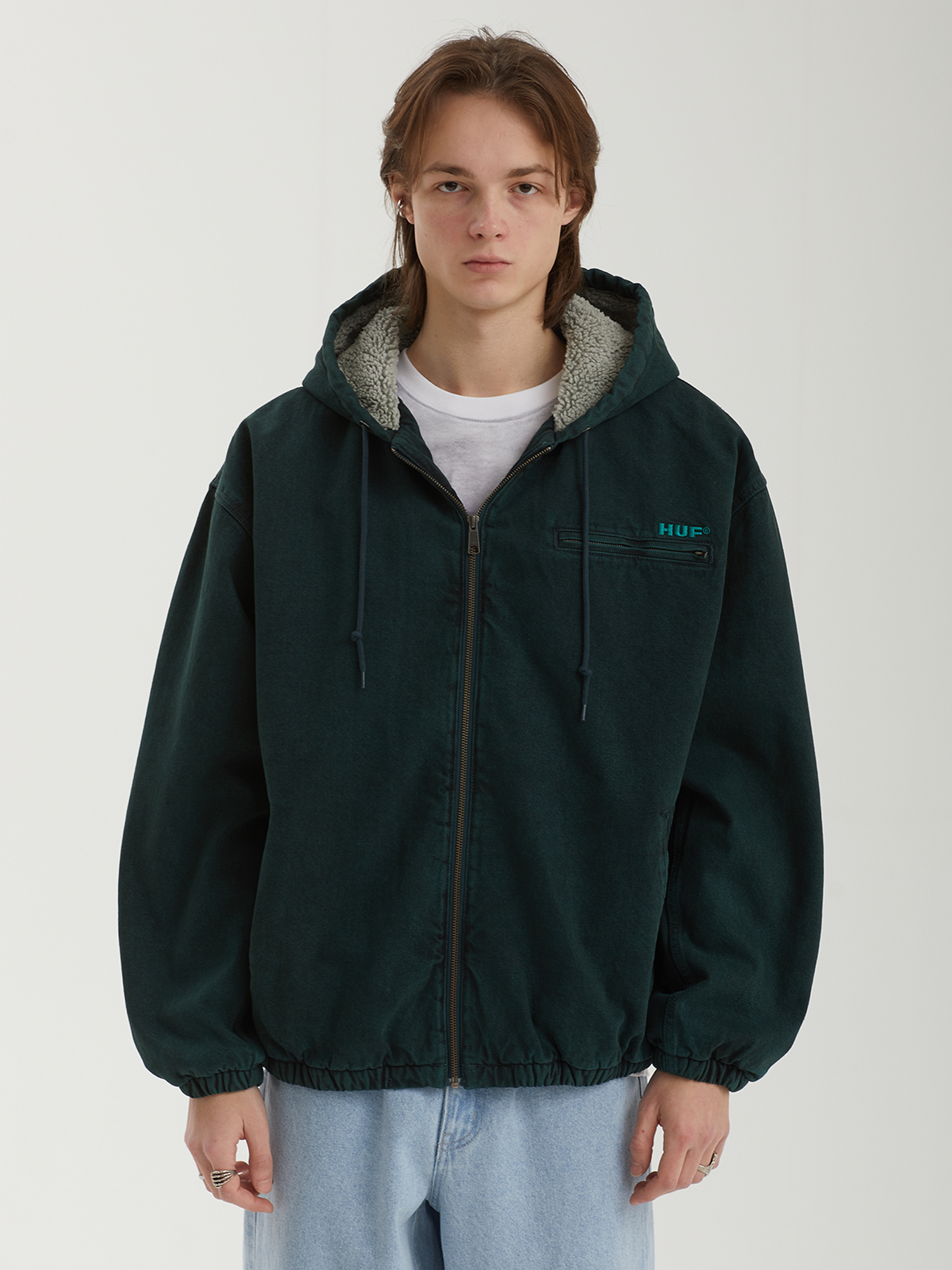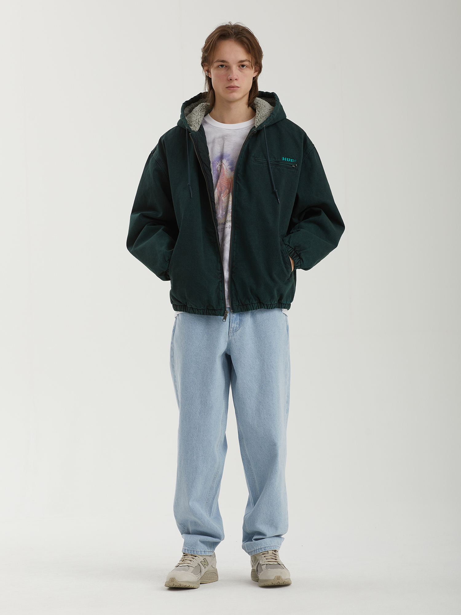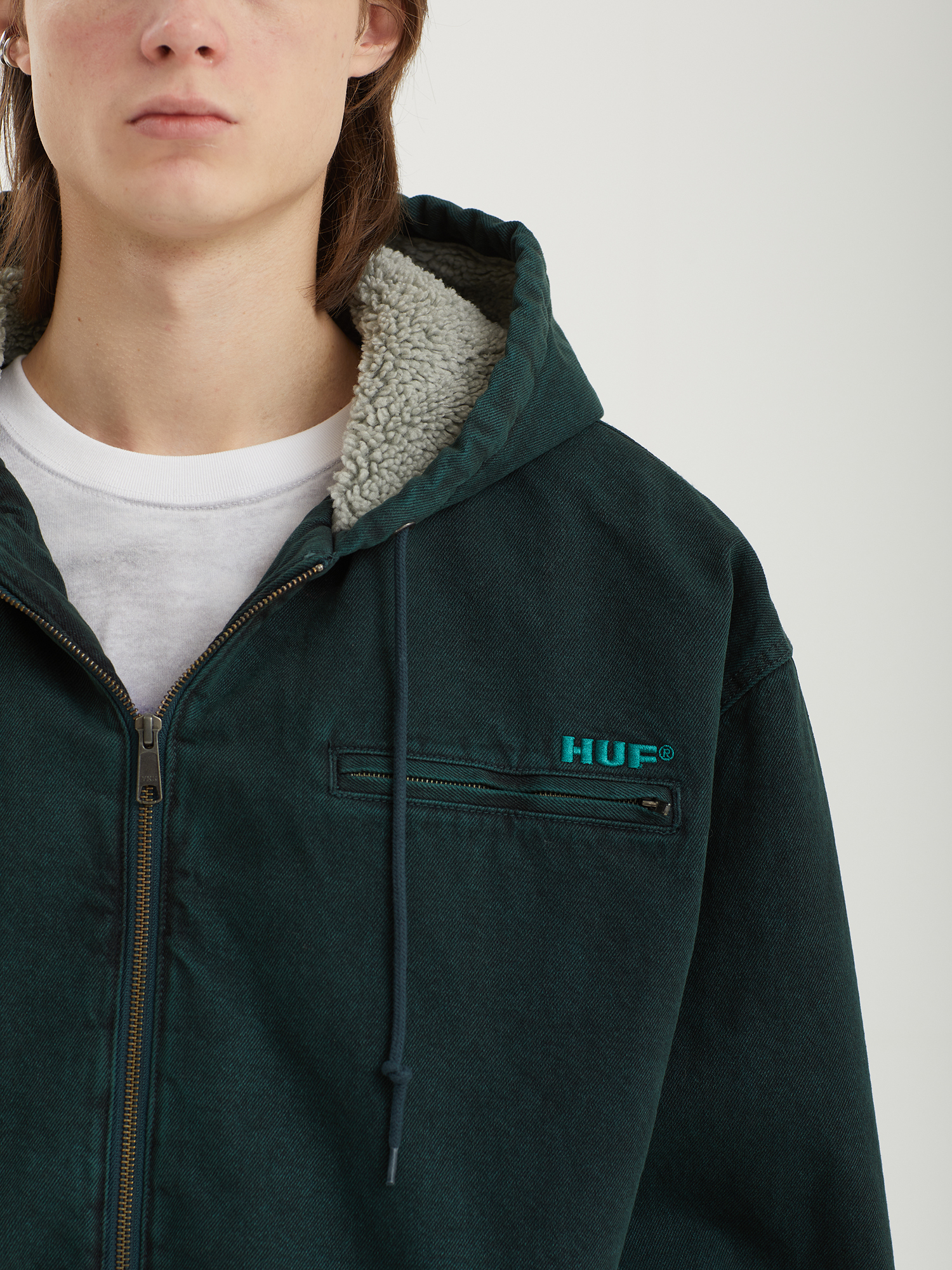 Джинсовая куртка с капюшоном Huf на мягкой подкладке. Изделие окрашено в готовом виде и выстирано для получения винтажного эффекта.