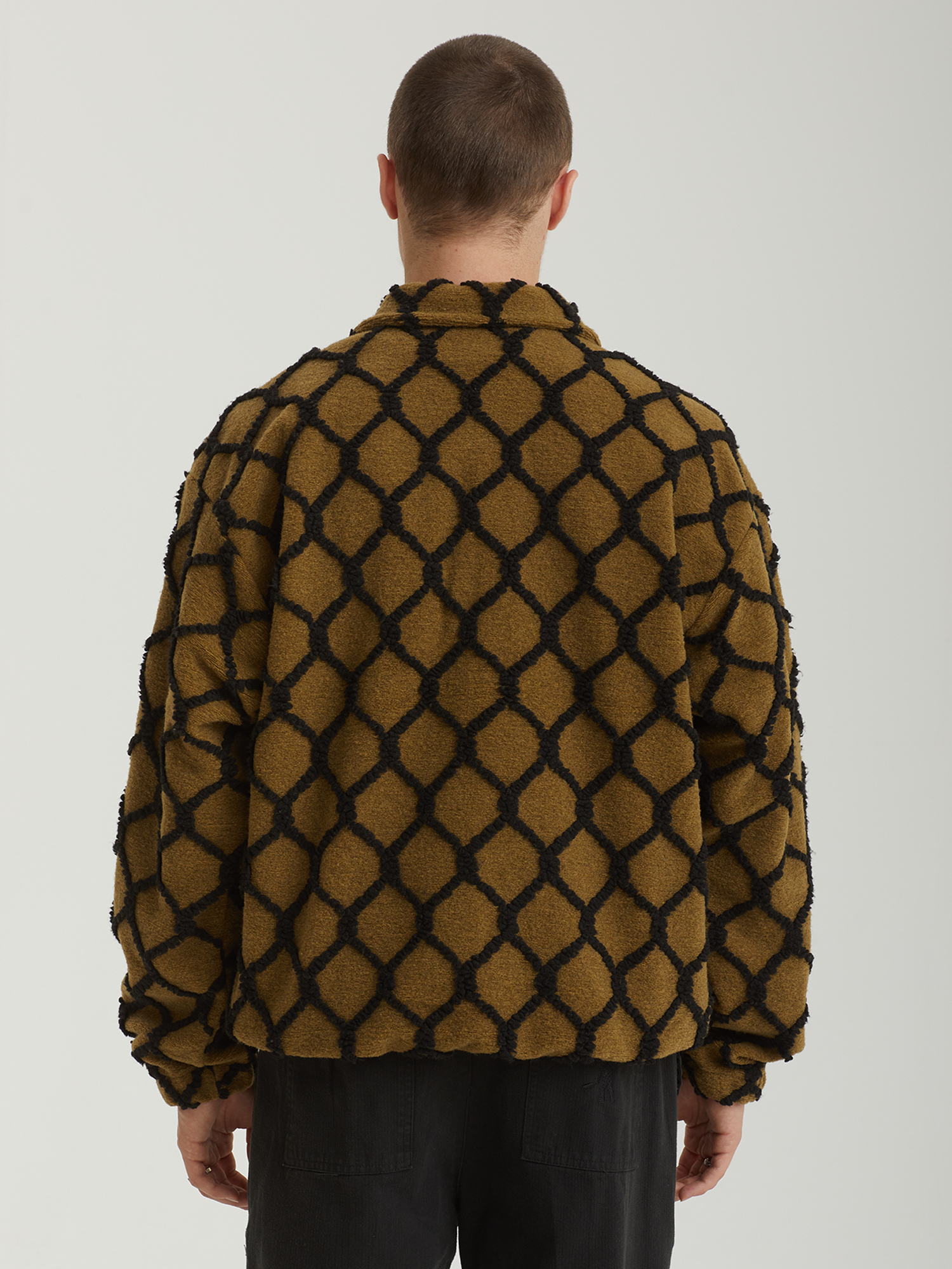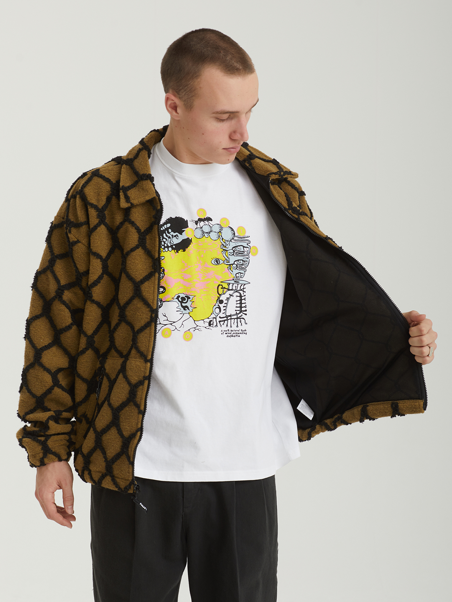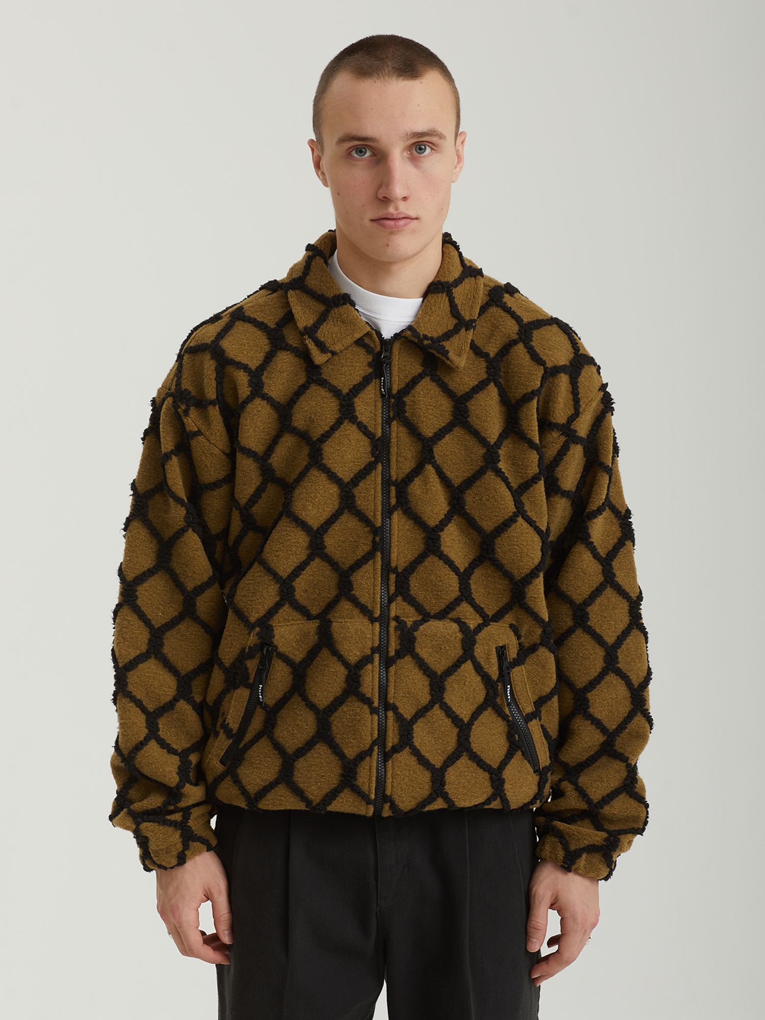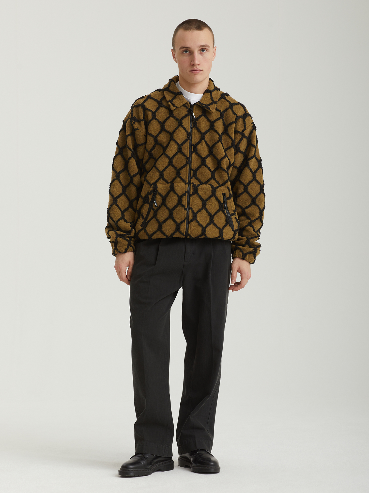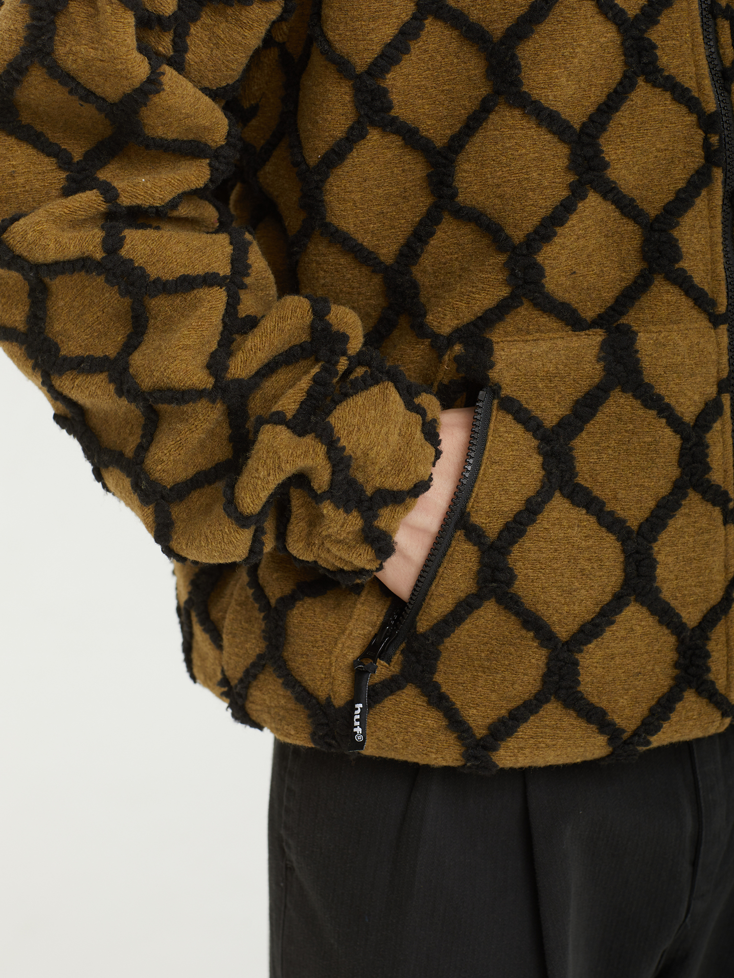 Флисовая куртка Huf из пушистого материала шерпа на стеганой сетчатой подкладке. Изделие дополнено сплошным контрастным узором.