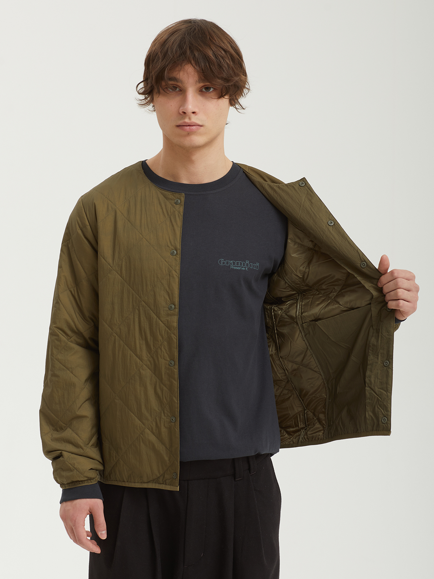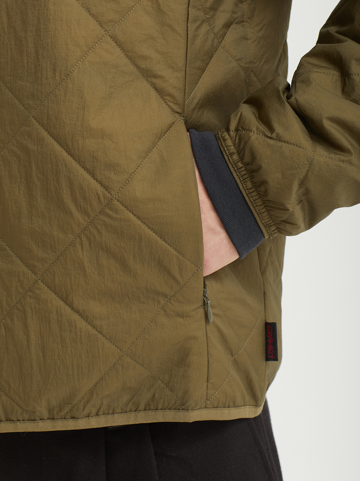 Стеганая куртка с тонким слоем утеплителя Gramicci из нейлона. В комплекте компактный чехол для переноски.