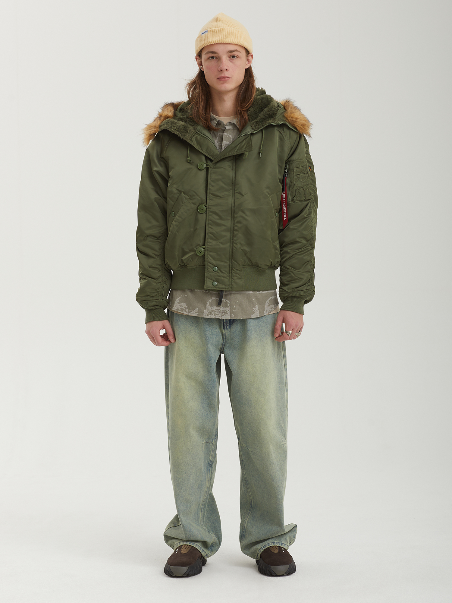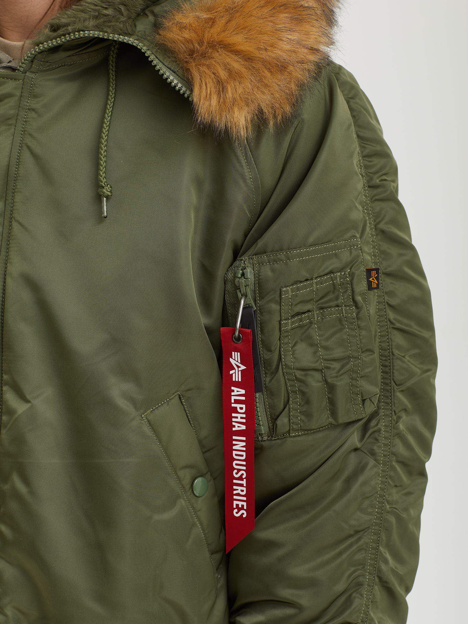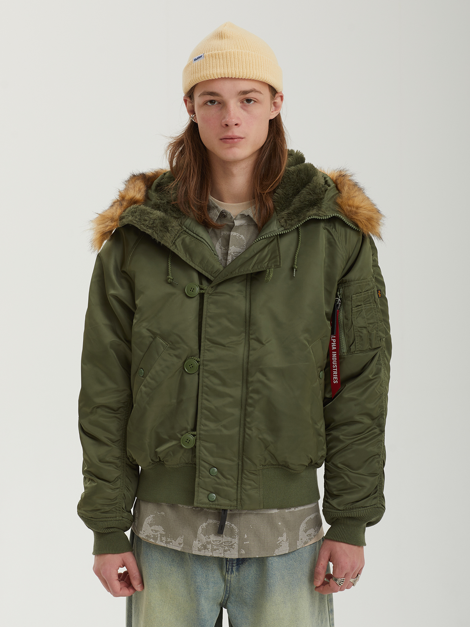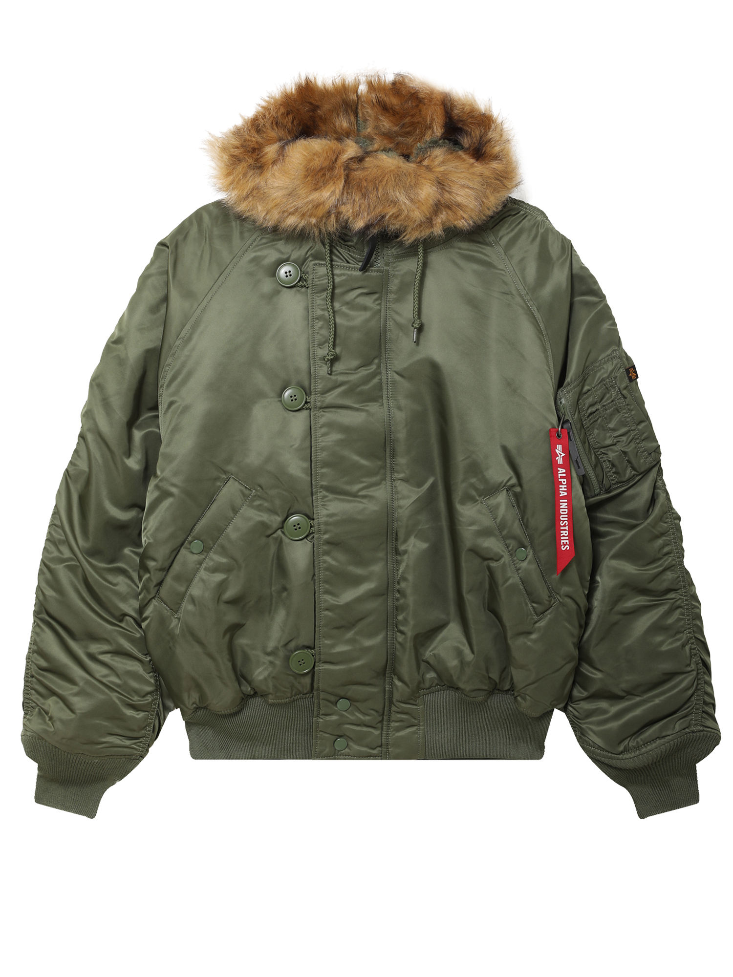 Парка N-2B с верхом из водоотталкивающего нейлона со слоем утеплителя средней плотности. Дизайн заимствован у летных моделей, созданных для экстремально низких температур. Изделие дополнено высоким воротником на молнии, капюшоном с мягкой подкладкой из искусственного мутона и карманами со сквозными отделениями, позволяющими не доставать руки на холоде. Капюшон разделен на две половины молнией и фиксируется с помощью кнопок. Накладной карман на рукаве с несколькими отделениями и брендированным пуллером молнии.