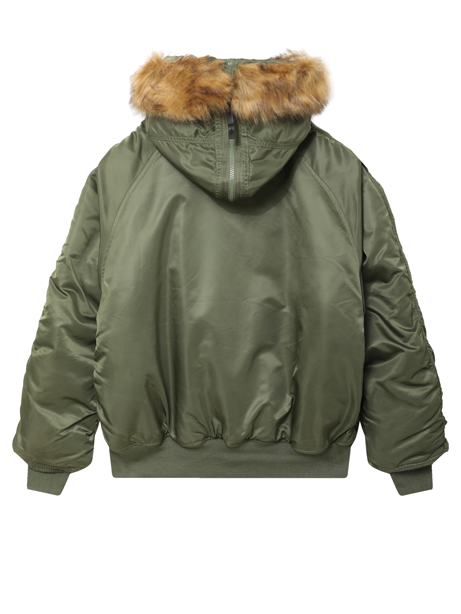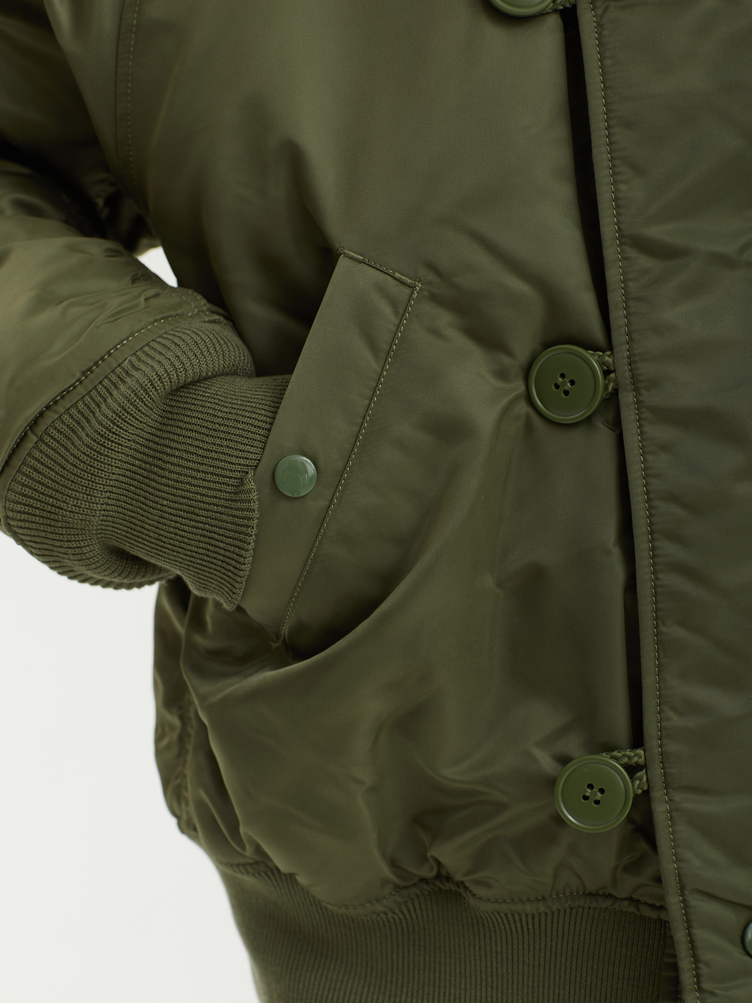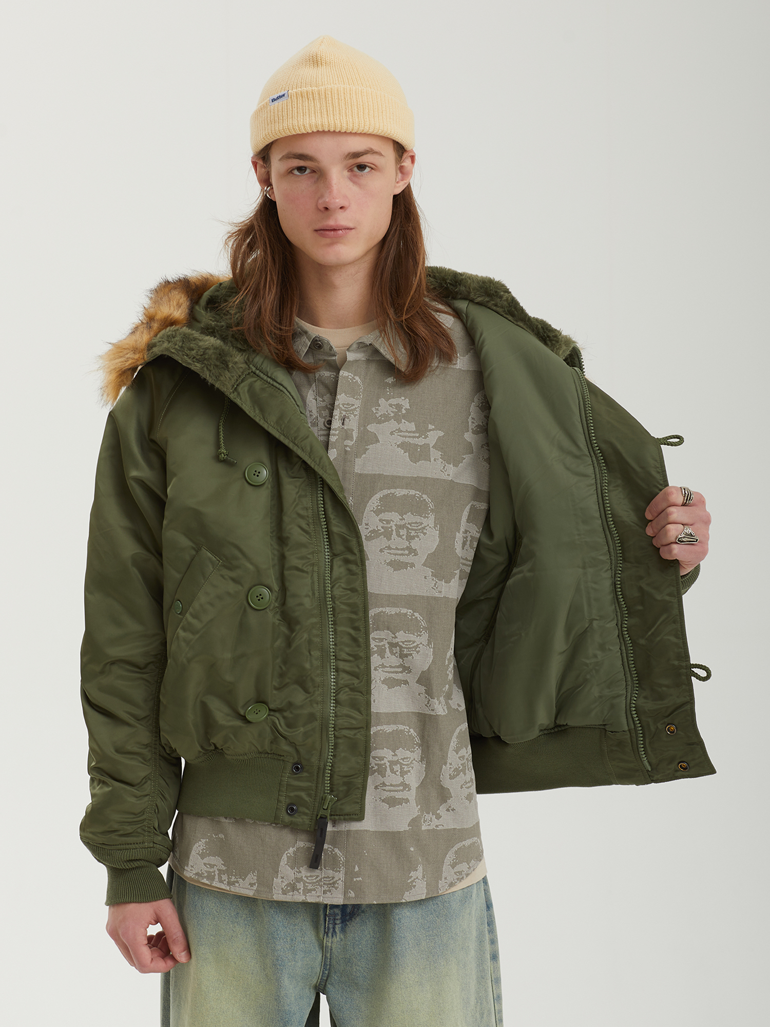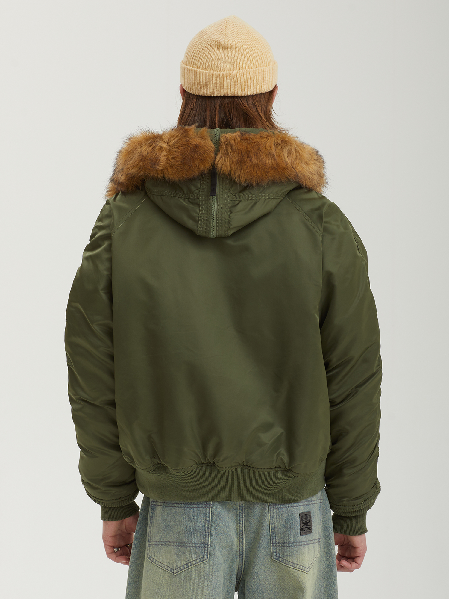 Парка N-2B с верхом из водоотталкивающего нейлона со слоем утеплителя средней плотности. Дизайн заимствован у летных моделей, созданных для экстремально низких температур. Изделие дополнено высоким воротником на молнии, капюшоном с мягкой подкладкой из искусственного мутона и карманами со сквозными отделениями, позволяющими не доставать руки на холоде. Капюшон разделен на две половины молнией и фиксируется с помощью кнопок. Накладной карман на рукаве с несколькими отделениями и брендированным пуллером молнии.