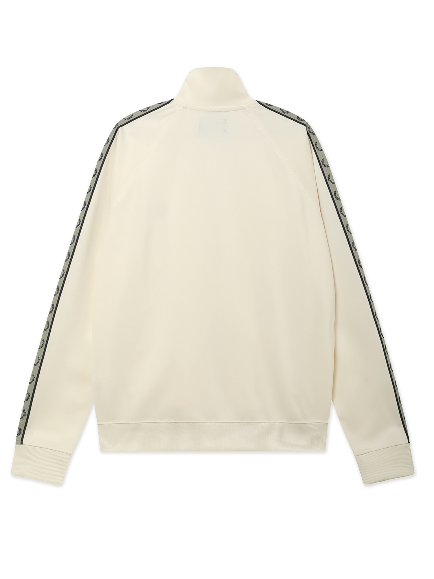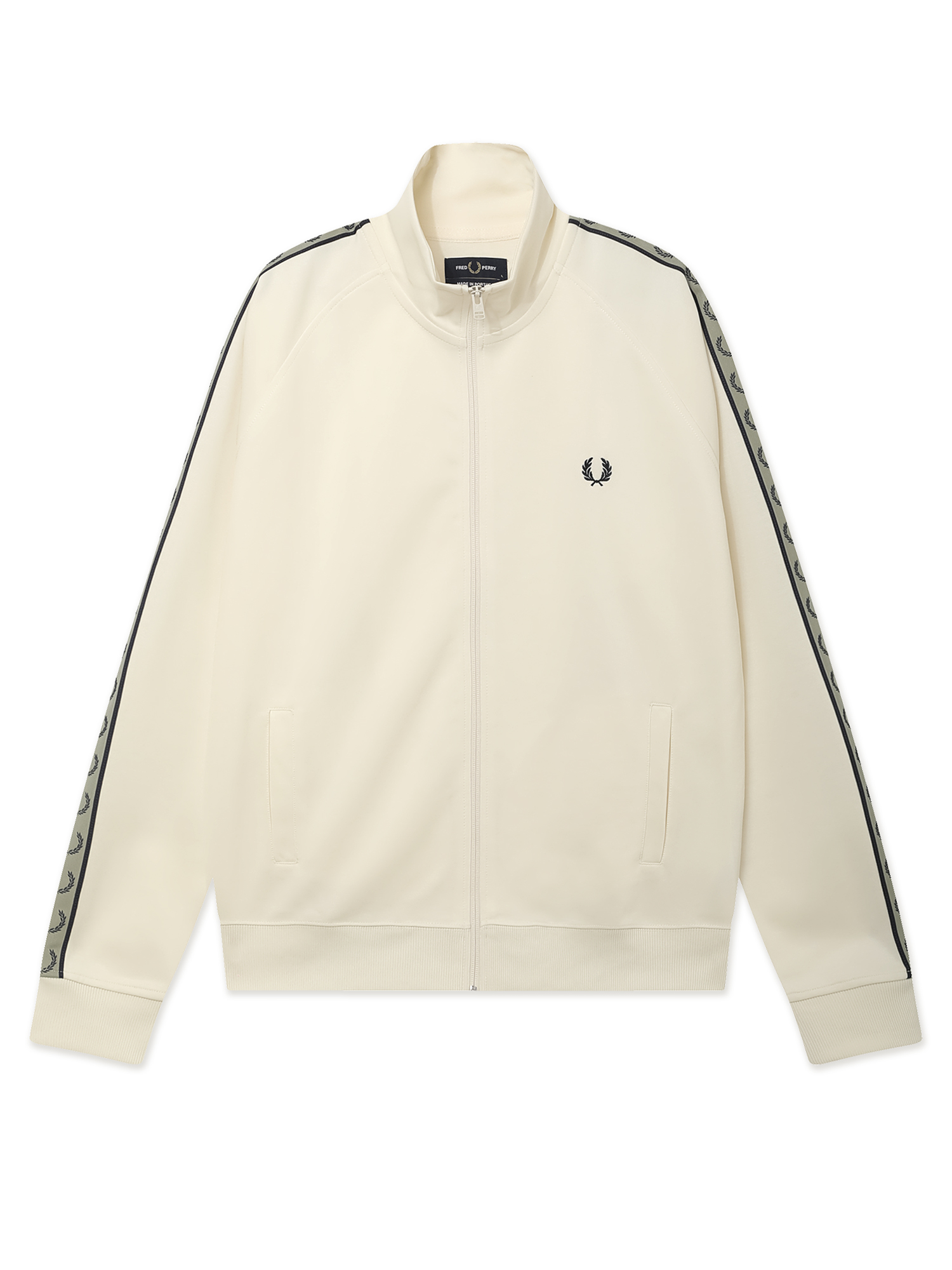 Олимпийка Fred Perry из гладкой трикотажной ткани с брендингом на рукавах и вышитым лавровым венком. Модель заимствует основные элементы из субкультурного наследия 1970-х.