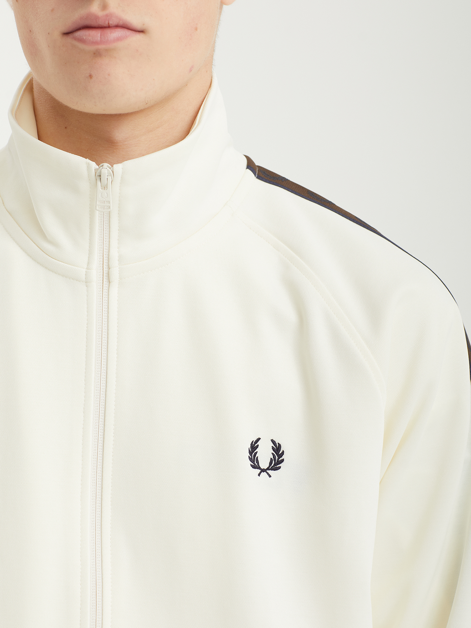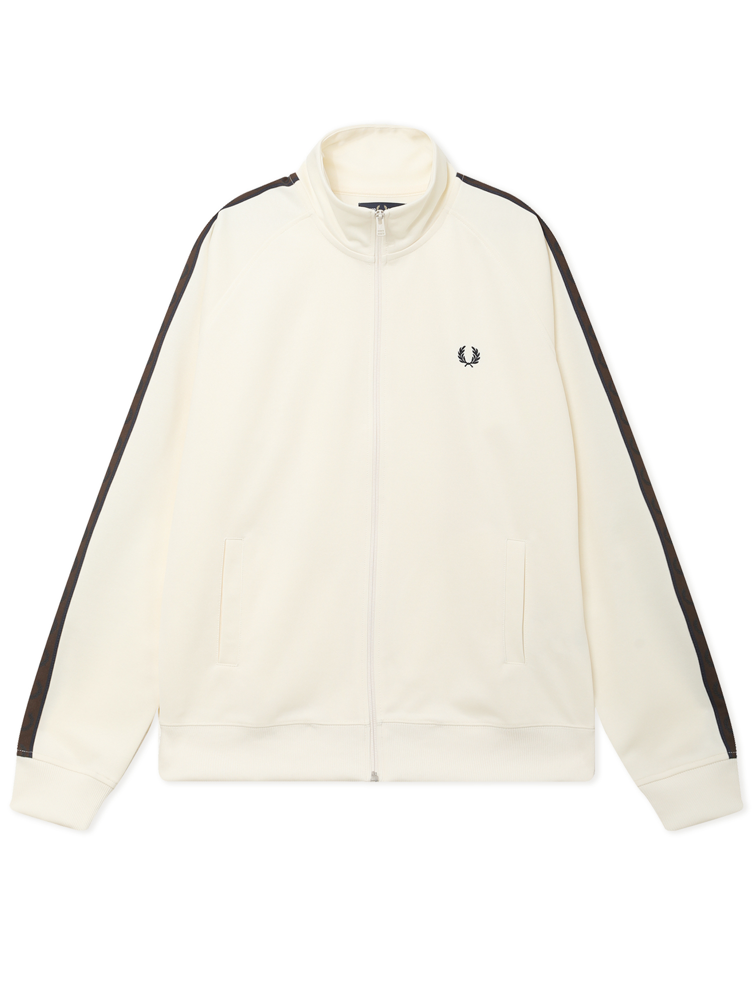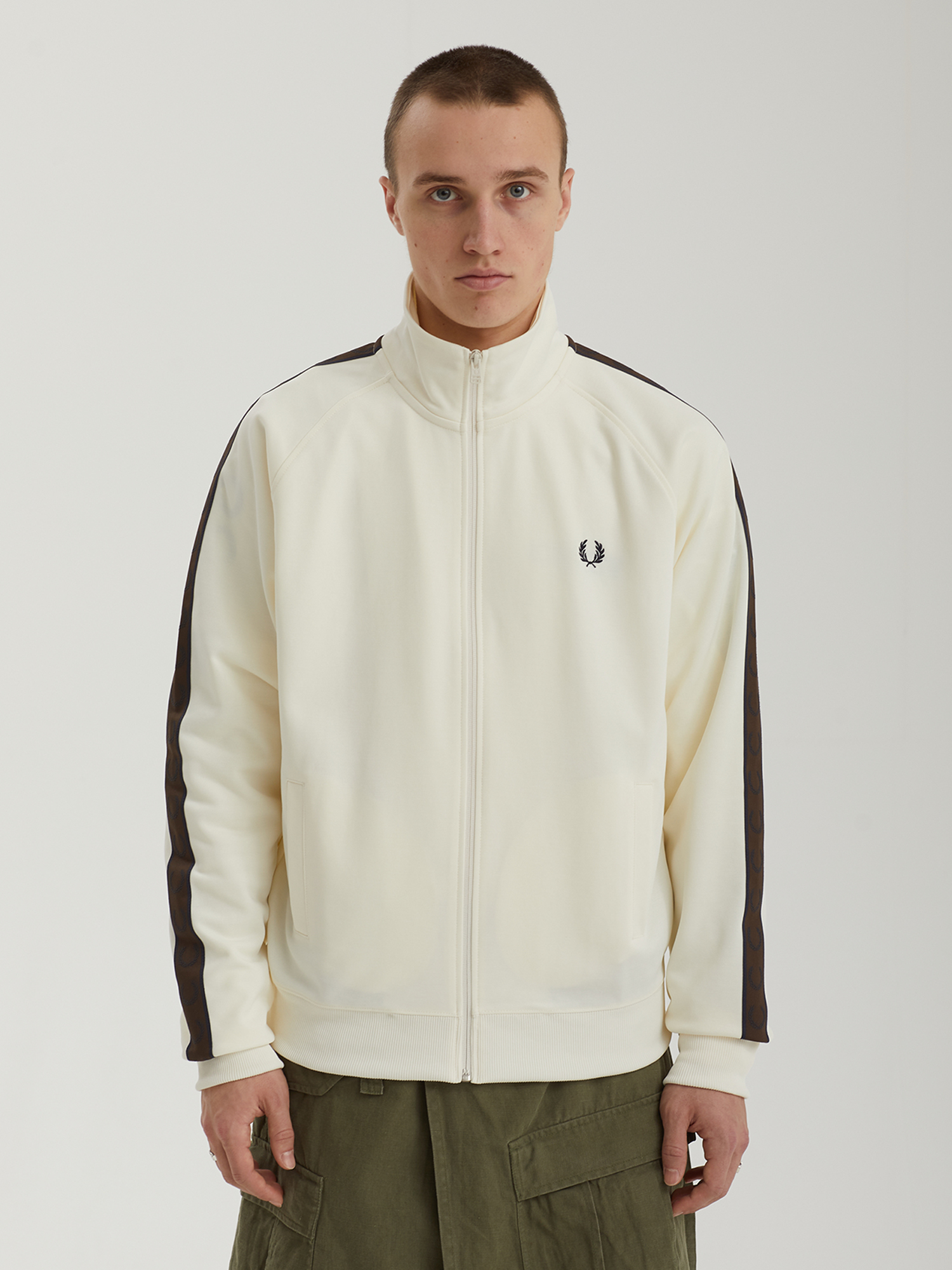 Олимпийка Fred Perry из гладкой трикотажной ткани с брендингом на рукавах и вышитым лавровым венком. Модель заимствует основные элементы из субкультурного наследия 1970-х.