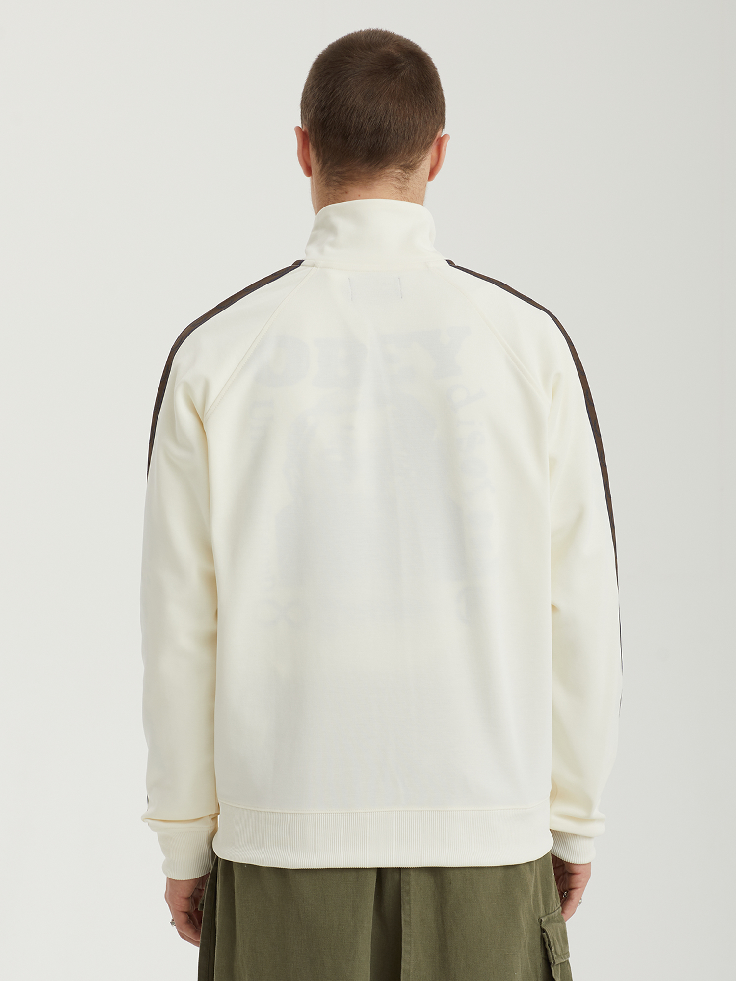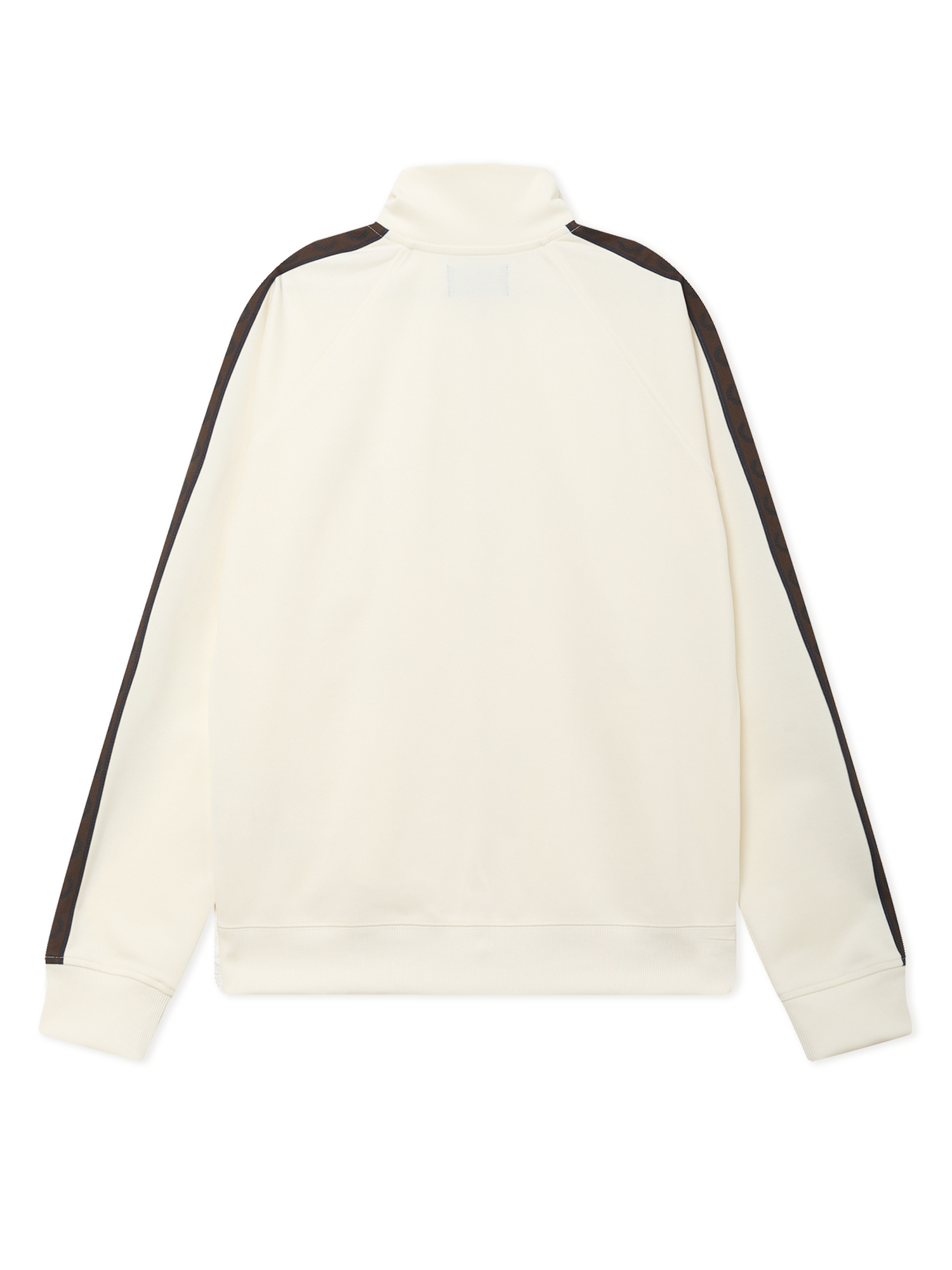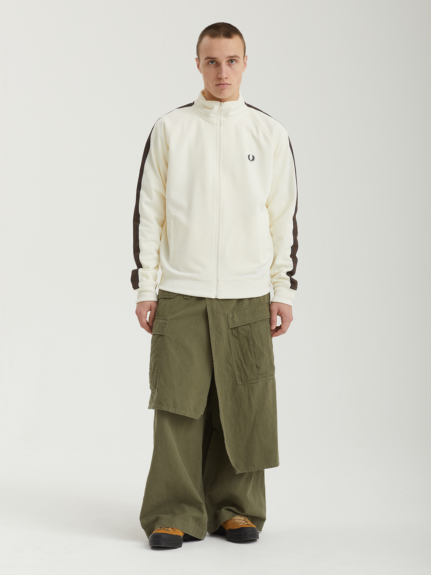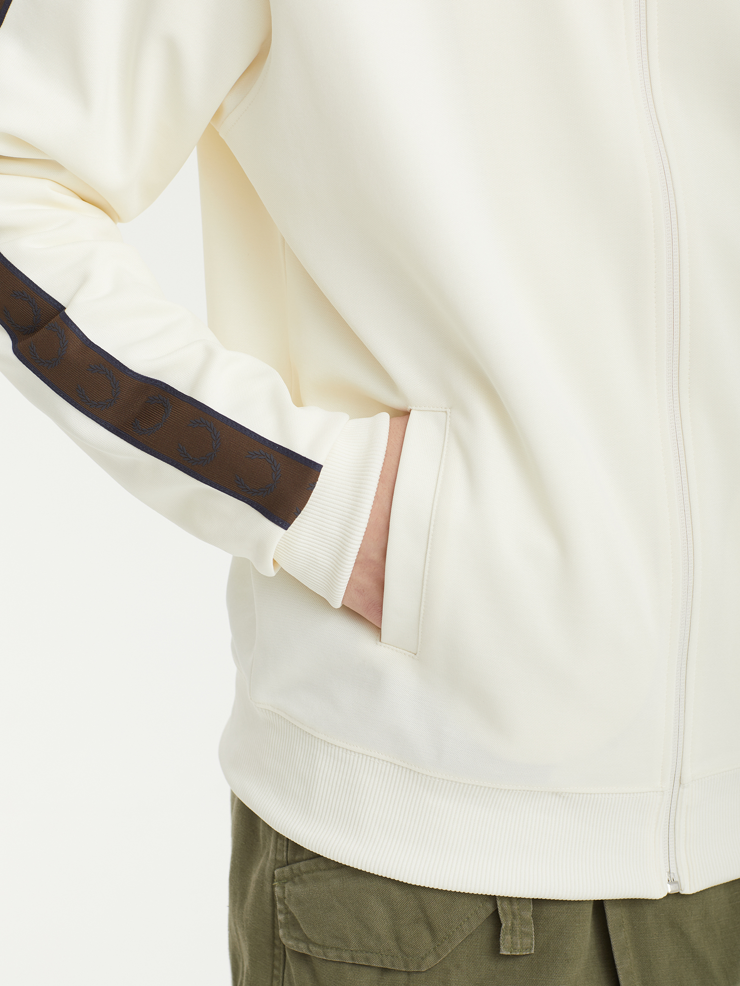 Олимпийка Fred Perry из гладкой трикотажной ткани с брендингом на рукавах и вышитым лавровым венком. Модель заимствует основные элементы из субкультурного наследия 1970-х.
