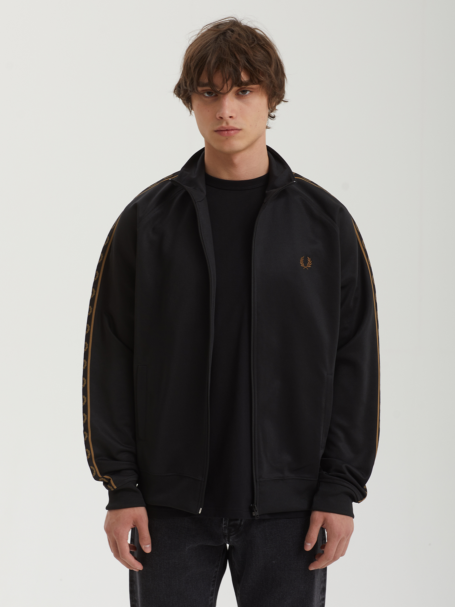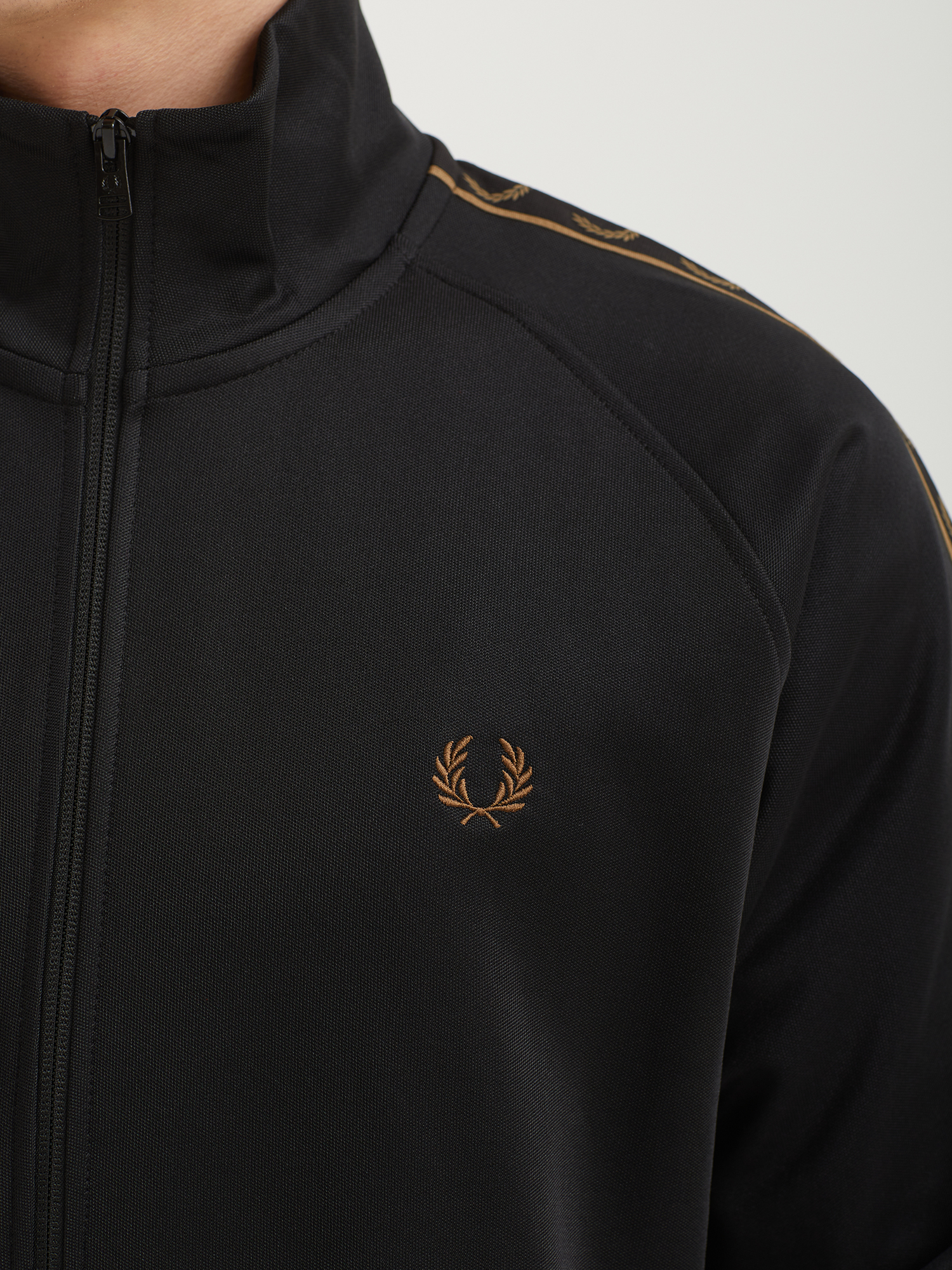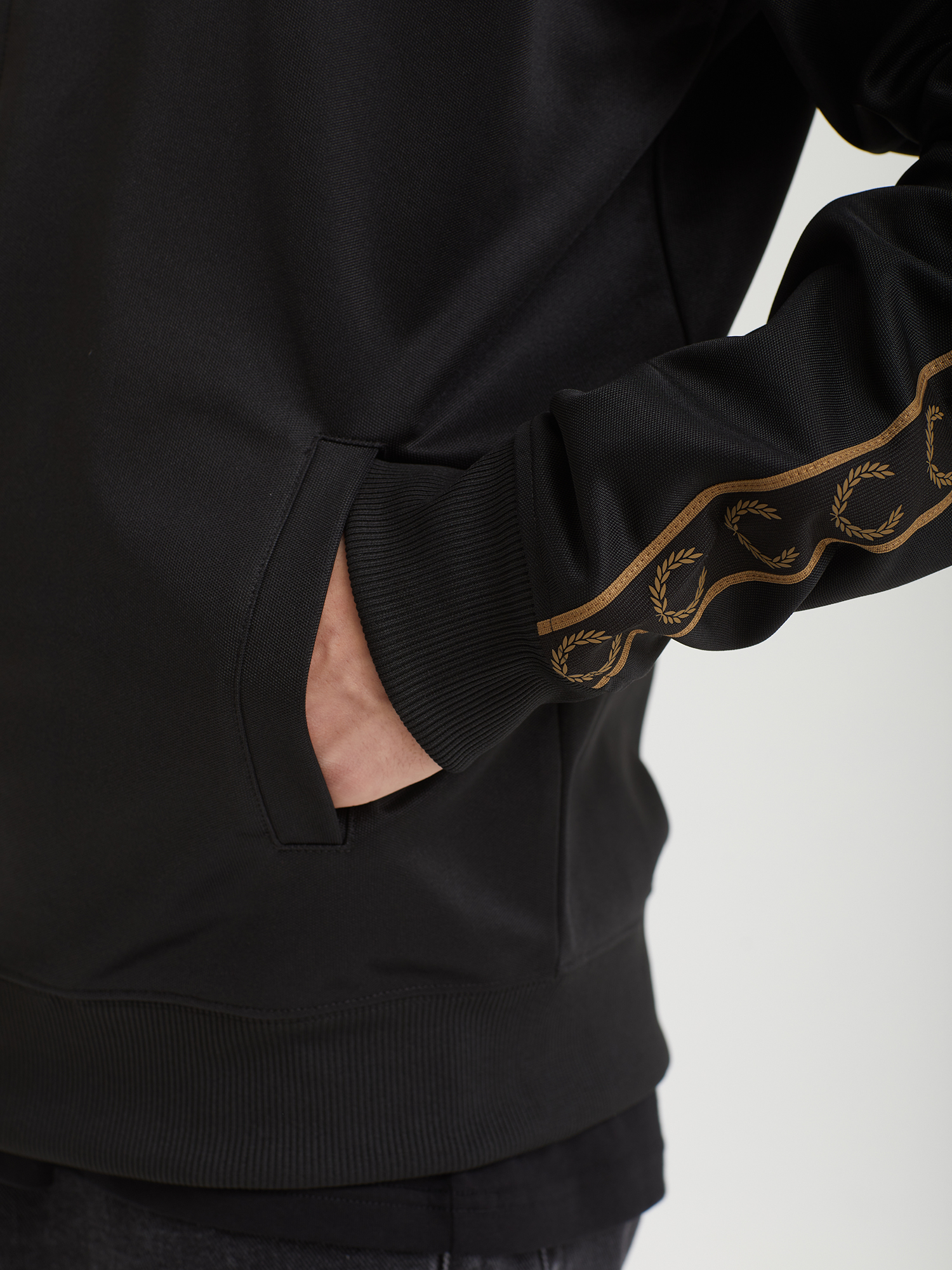 Олимпийка Fred Perry из гладкой трикотажной ткани с брендингом на рукавах и вышитым лавровым венком. Модель заимствует основные элементы из субкультурного наследия 1970-х.
