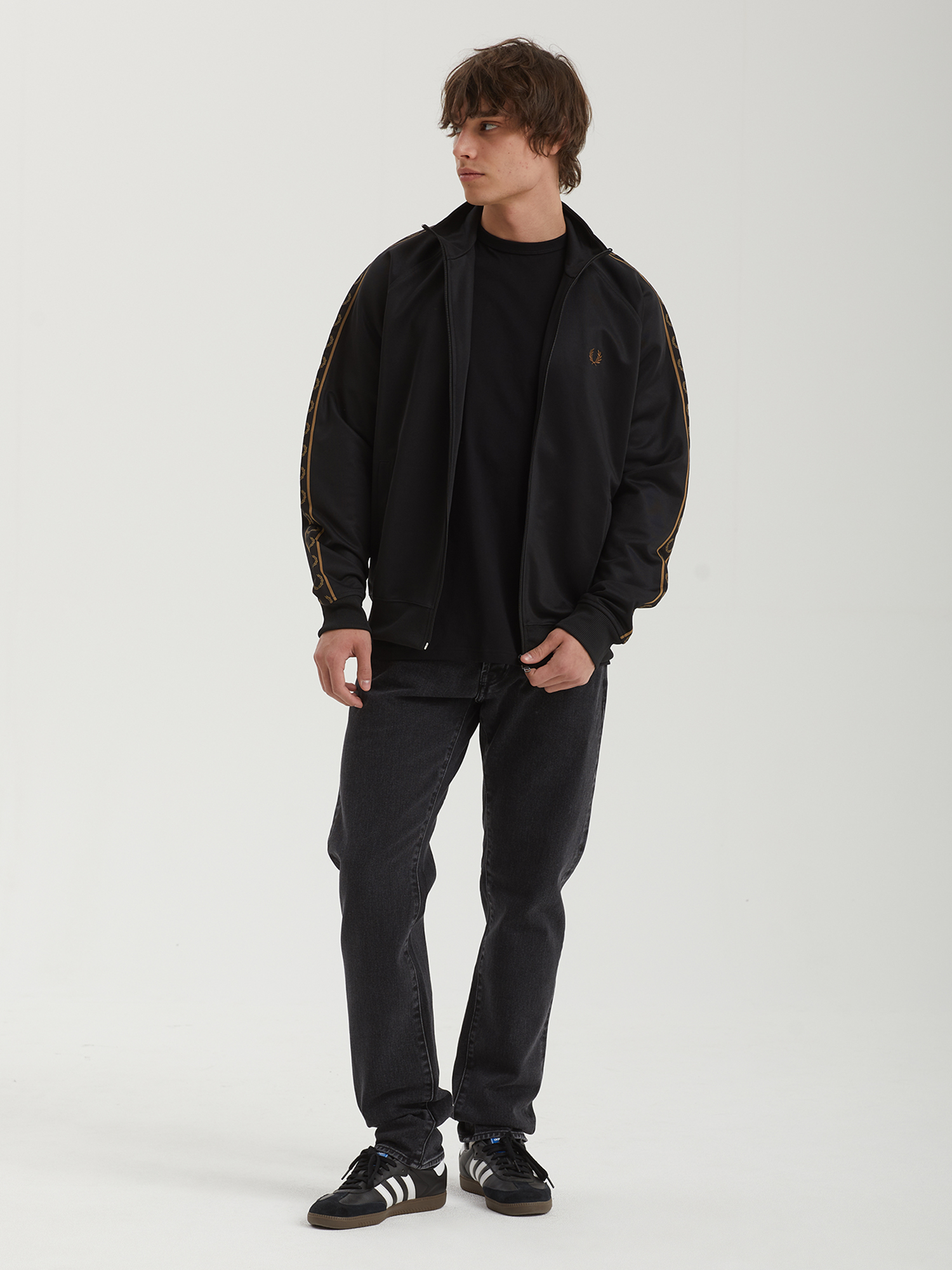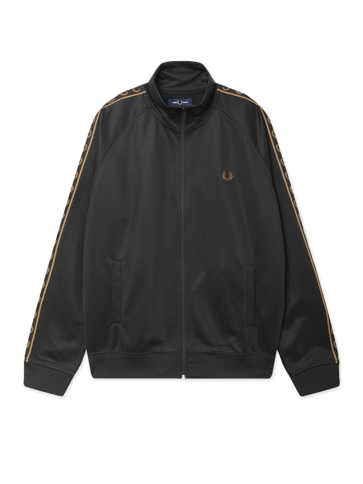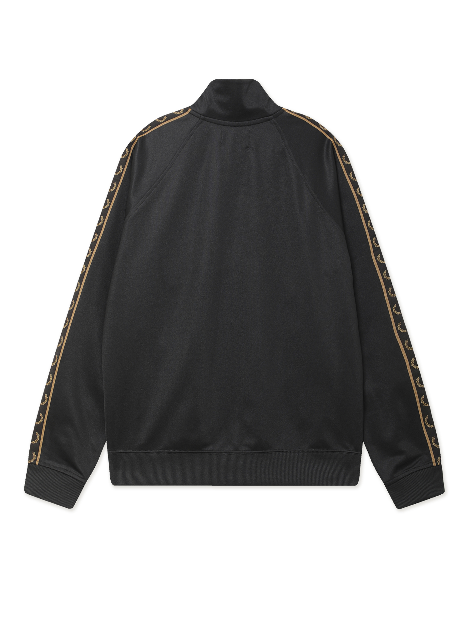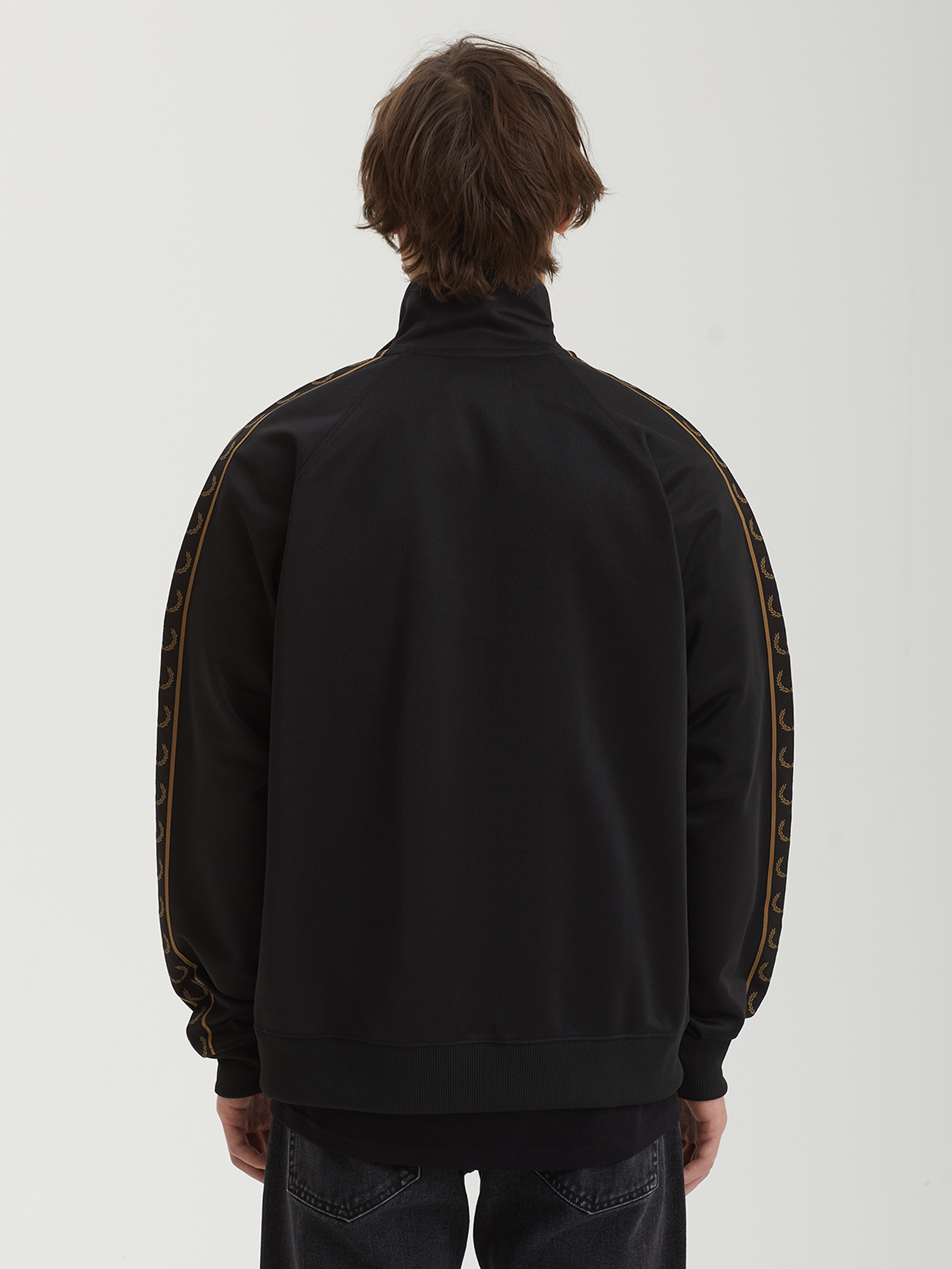 Олимпийка Fred Perry из гладкой трикотажной ткани с брендингом на рукавах и вышитым лавровым венком. Модель заимствует основные элементы из субкультурного наследия 1970-х.