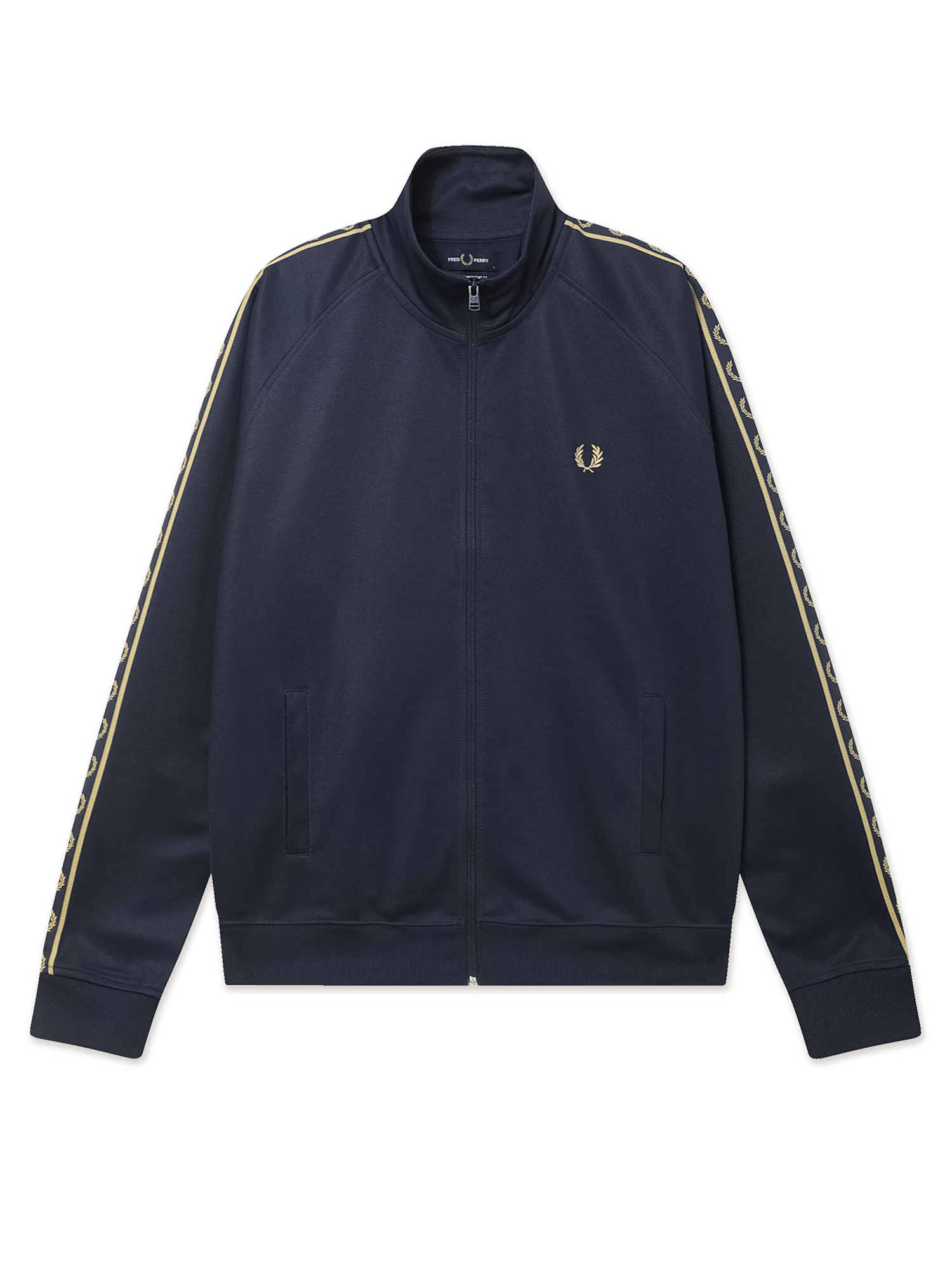 Олимпийка Fred Perry из гладкой трикотажной ткани с брендингом на рукавах и вышитым лавровым венком. Модель заимствует основные элементы из субкультурного наследия 1970-х.