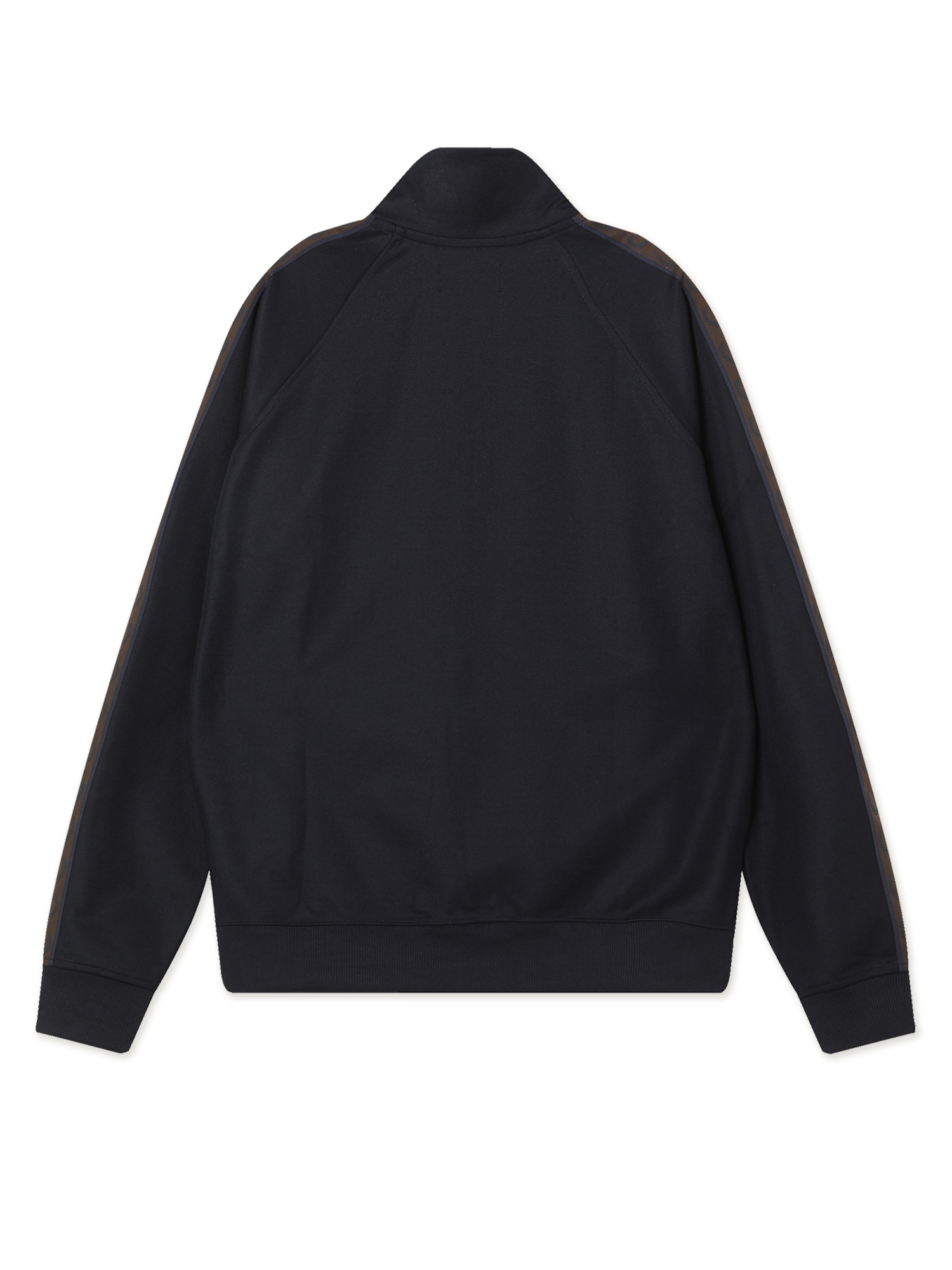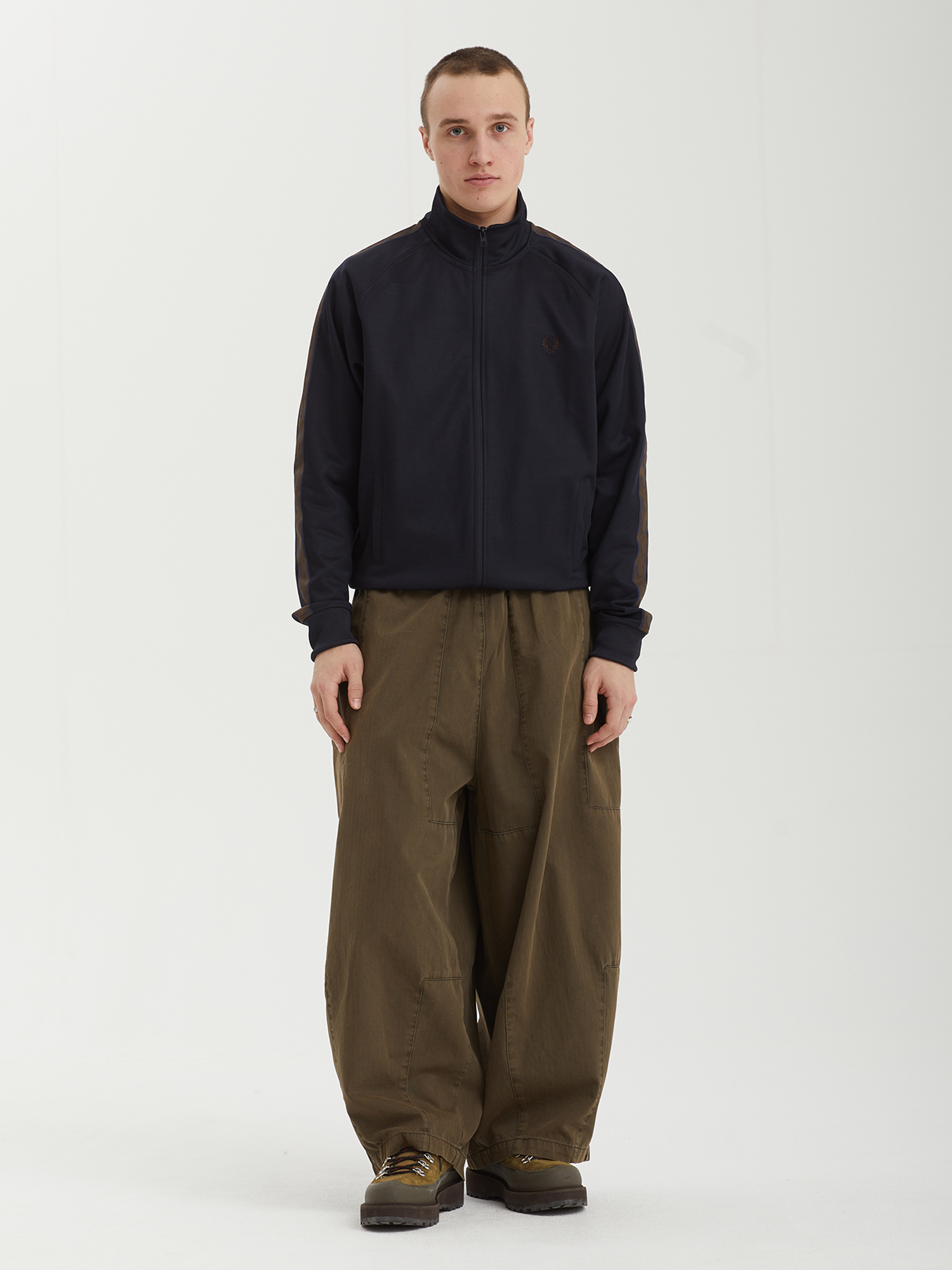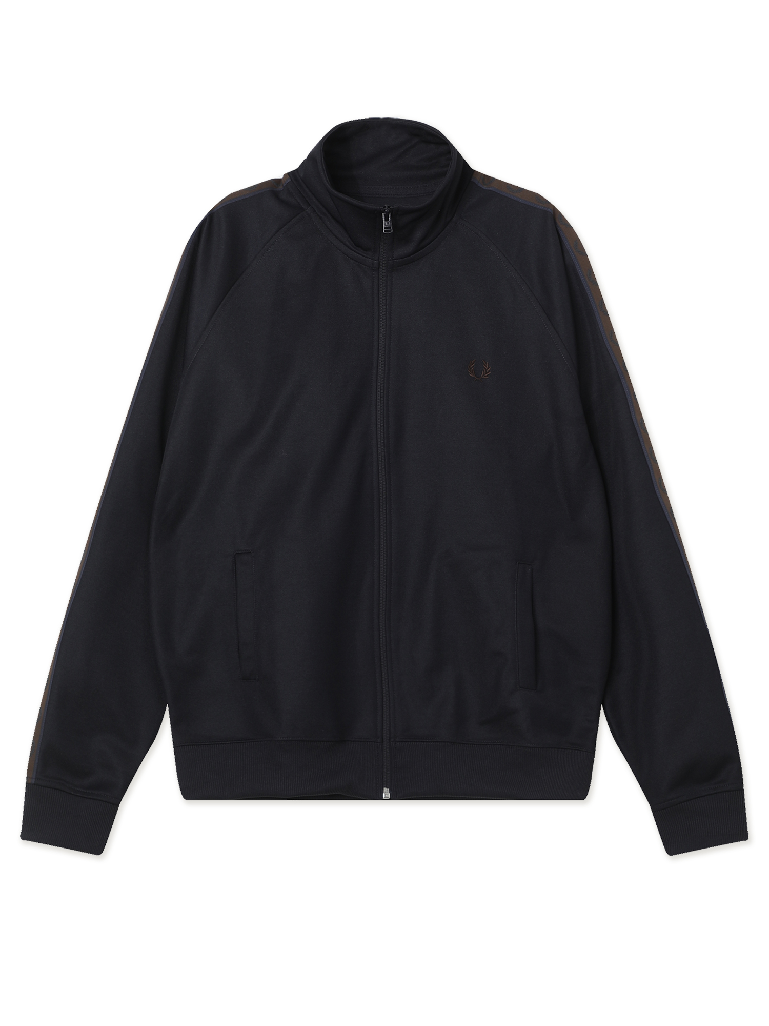 Олимпийка Fred Perry из гладкой трикотажной ткани с брендингом на рукавах и вышитым лавровым венком. Модель заимствует основные элементы из субкультурного наследия 1970-х.