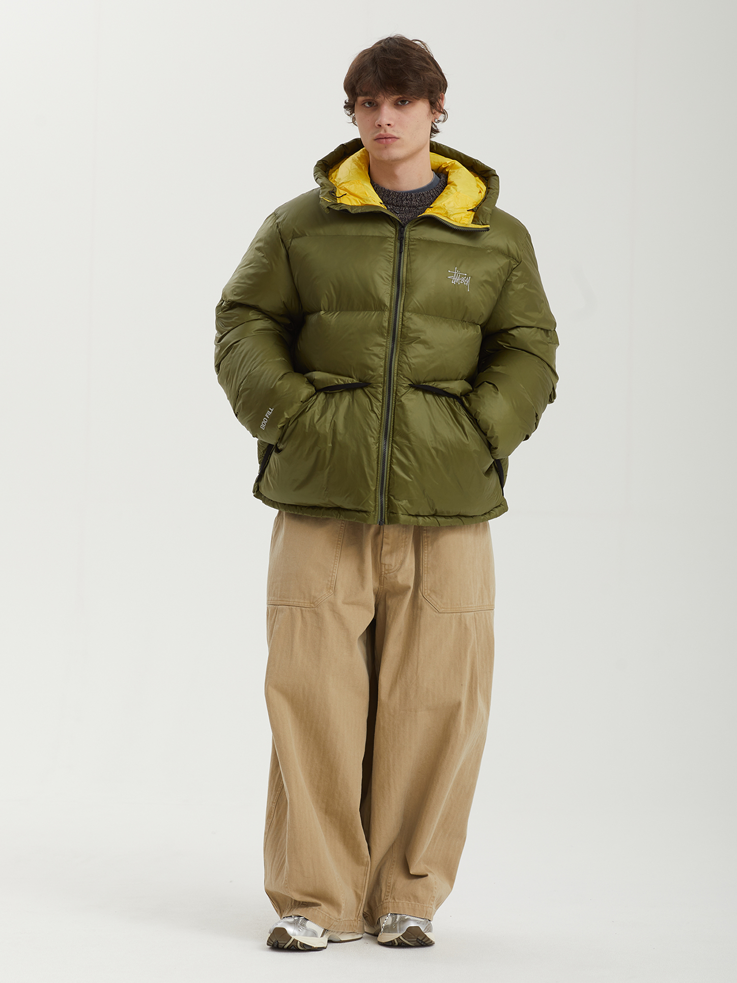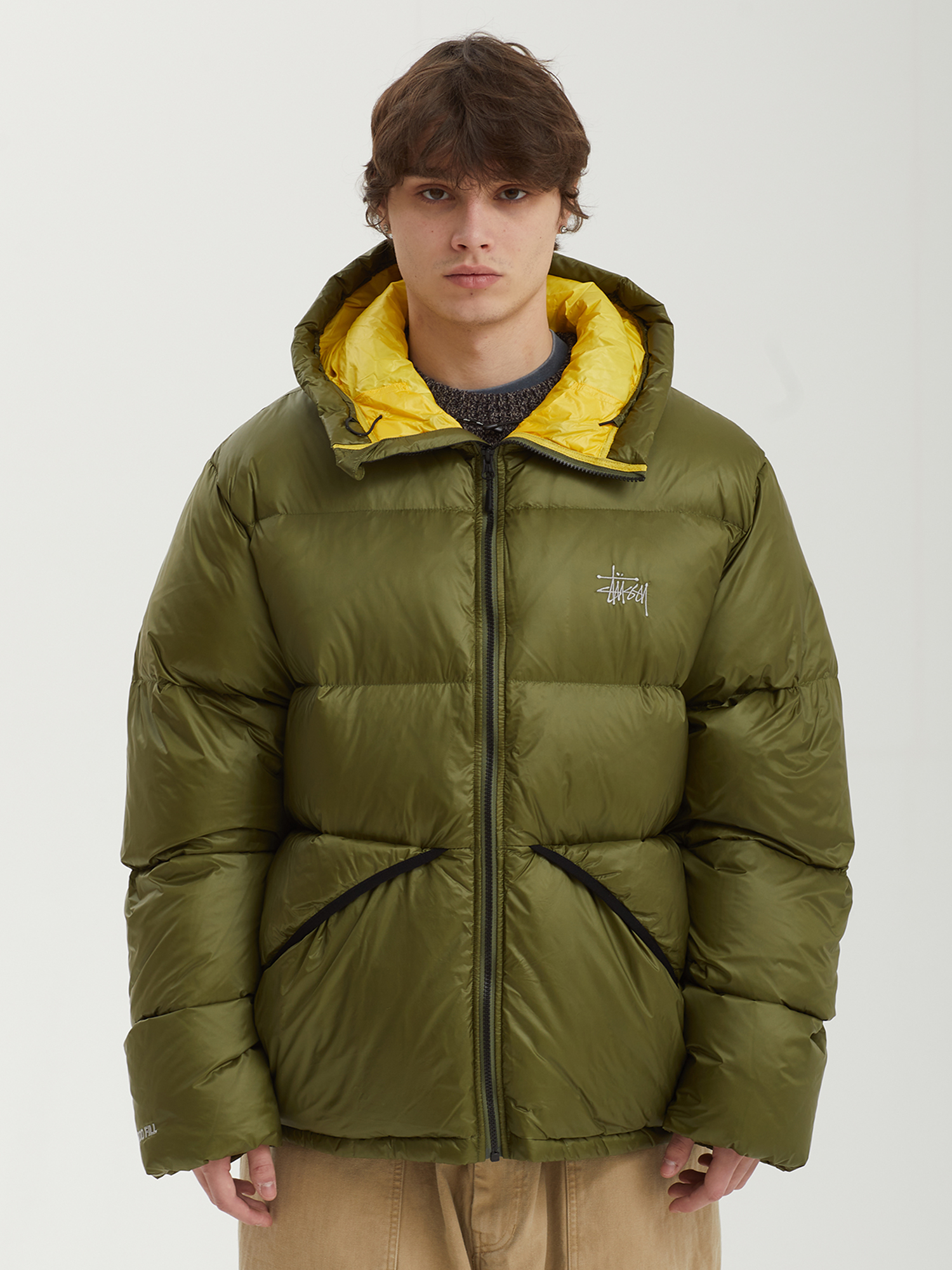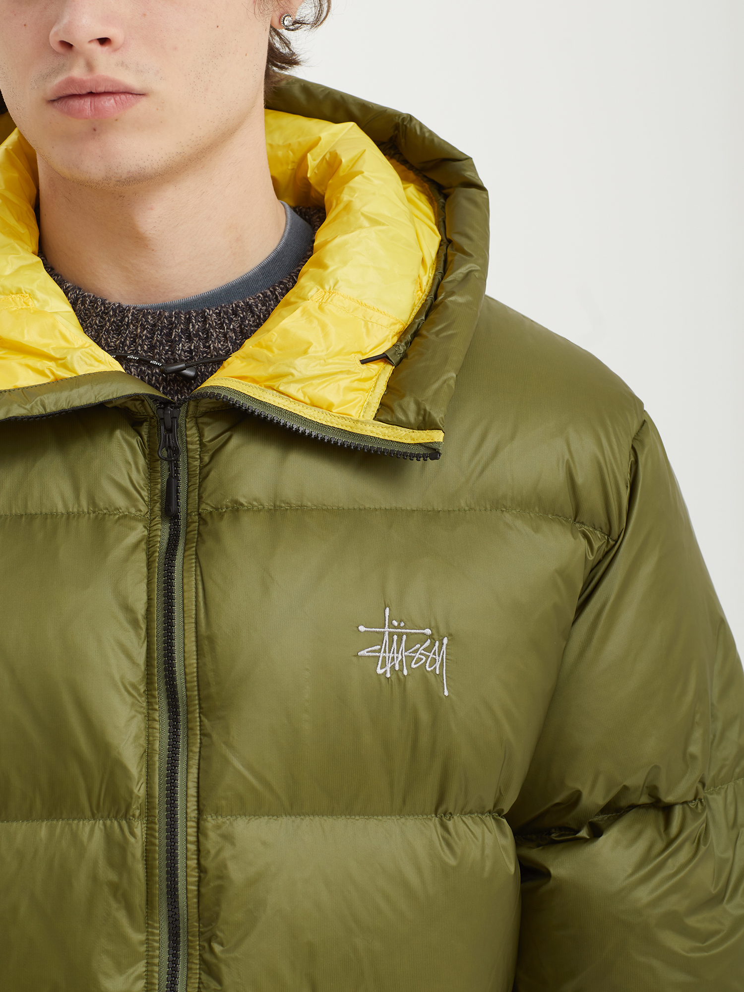 Пуховик с капюшоном Stussy с верхом из глянцевого нейлонового материала. Изделие с натуральным наполнителем высокой уровнем плотности, что позволяет качественно удерживать тепло.