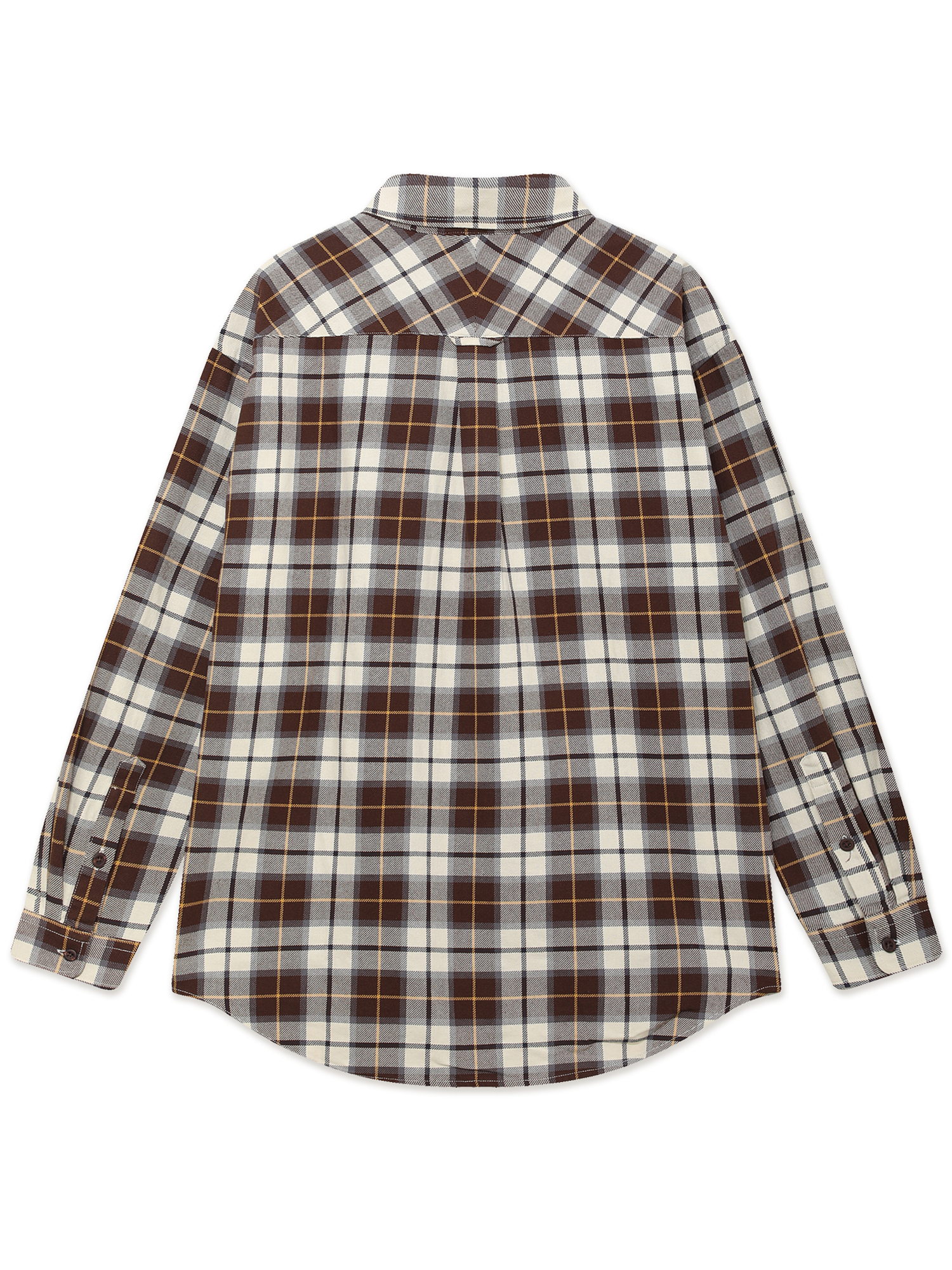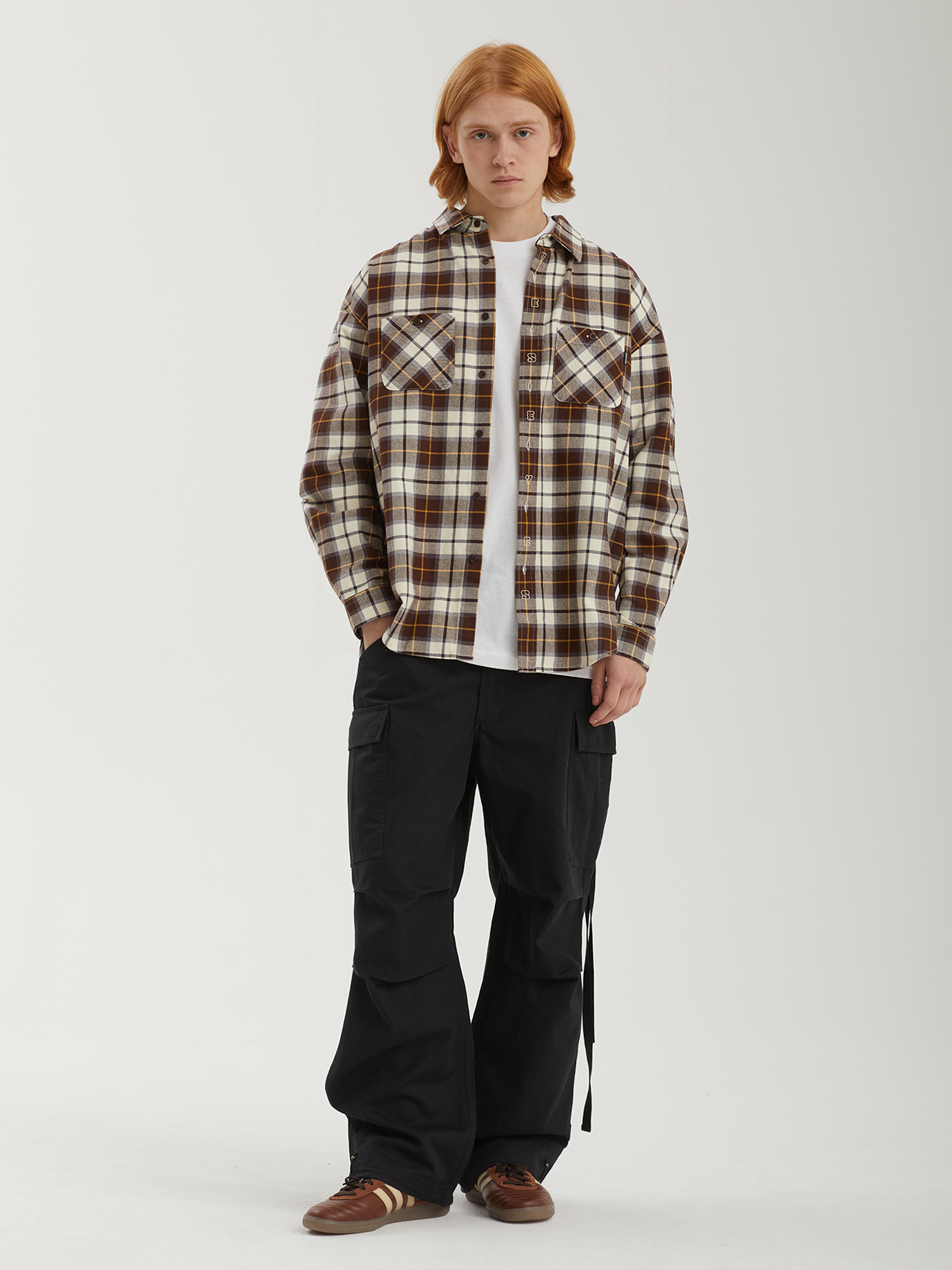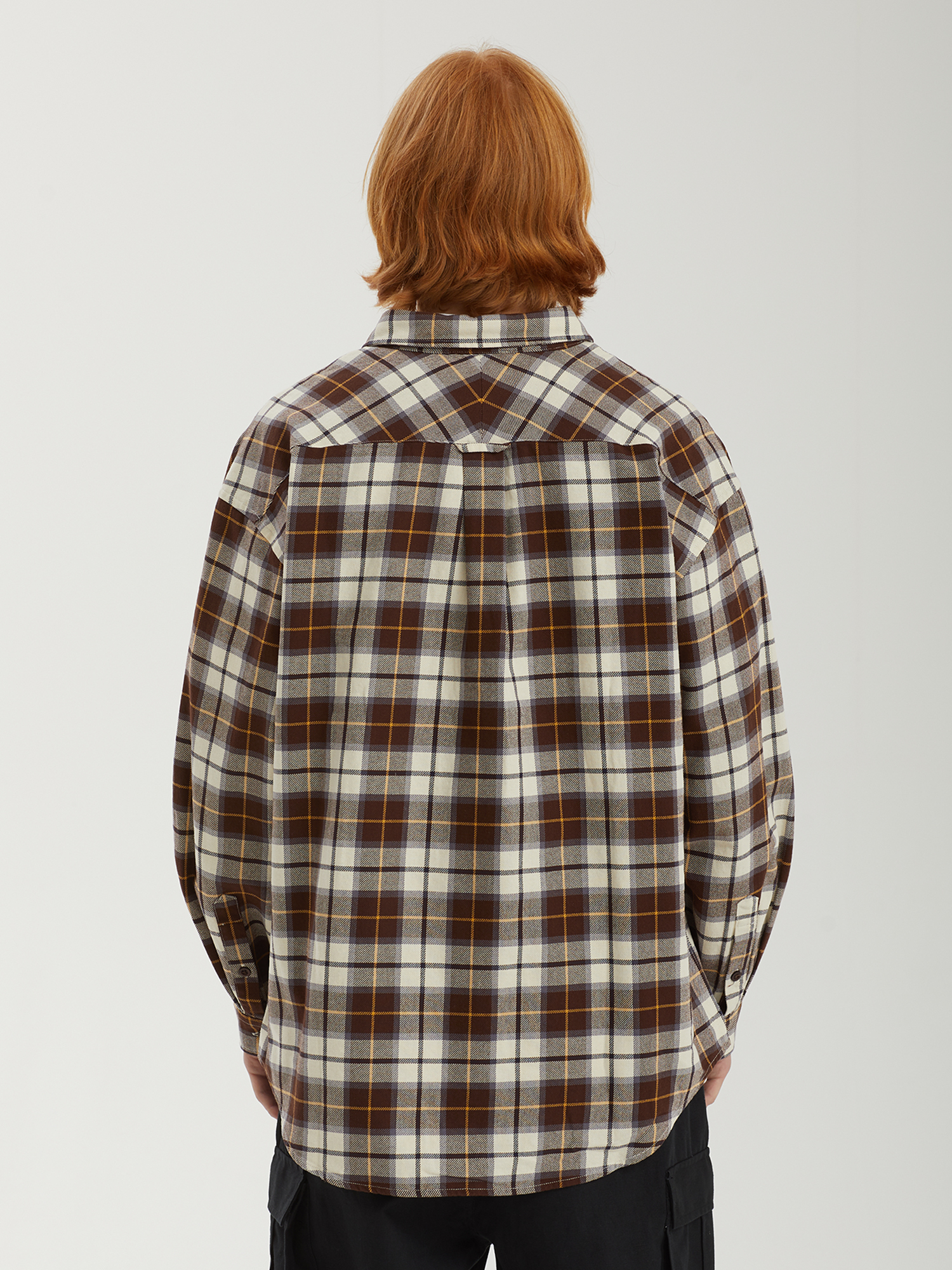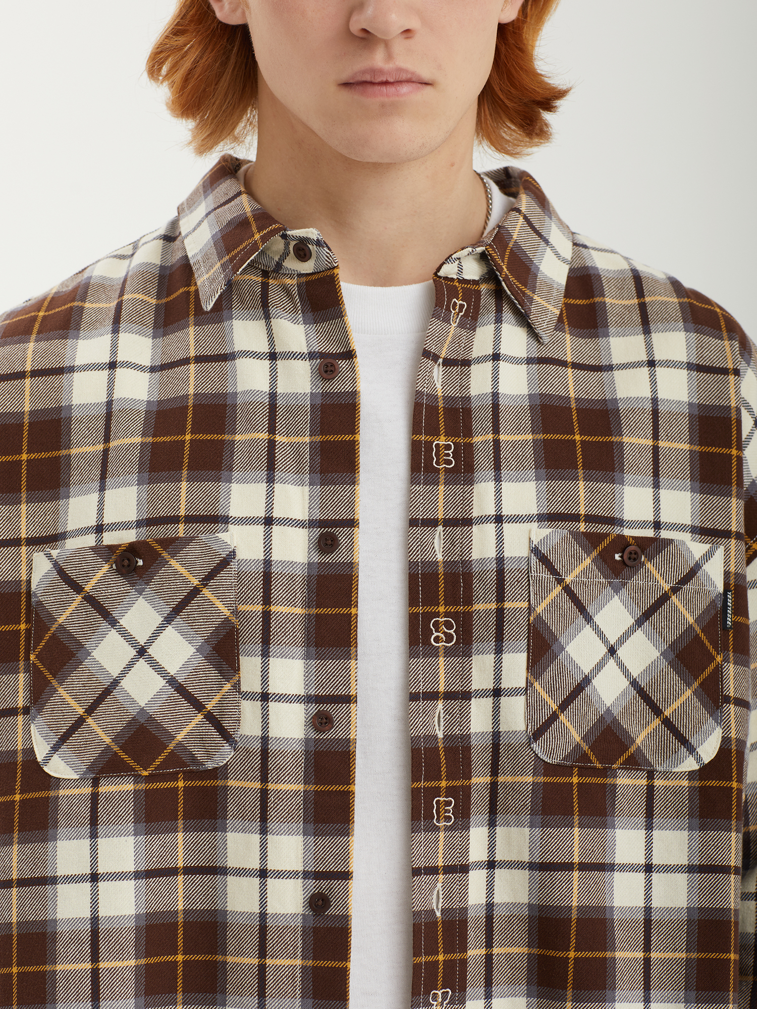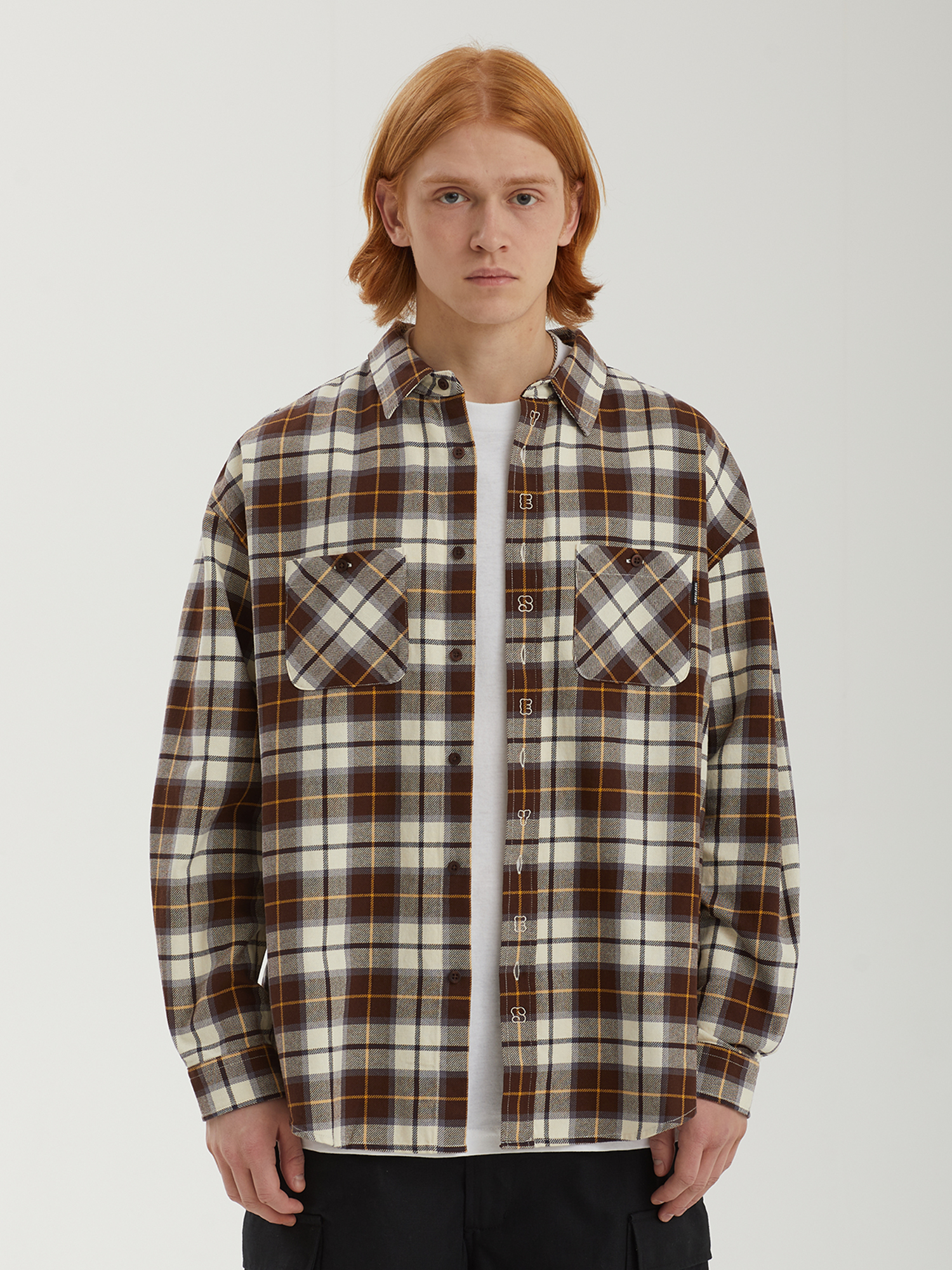 Рубашка из мягкой хлопковой фланели с клетчатым тартановым узором. Расслабленный силуэт и складки на задней панели обеспечивают комфортную посадку и свободу движений. На планке — декоративная вышивка, аккуратно размещенная между пуговицами.
