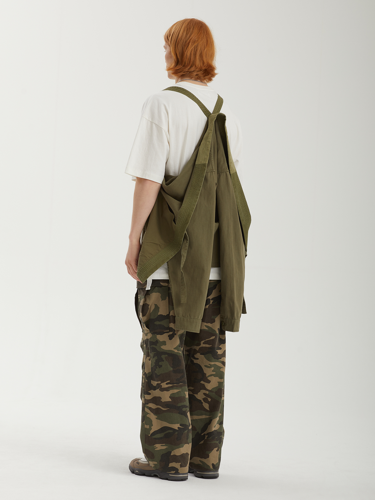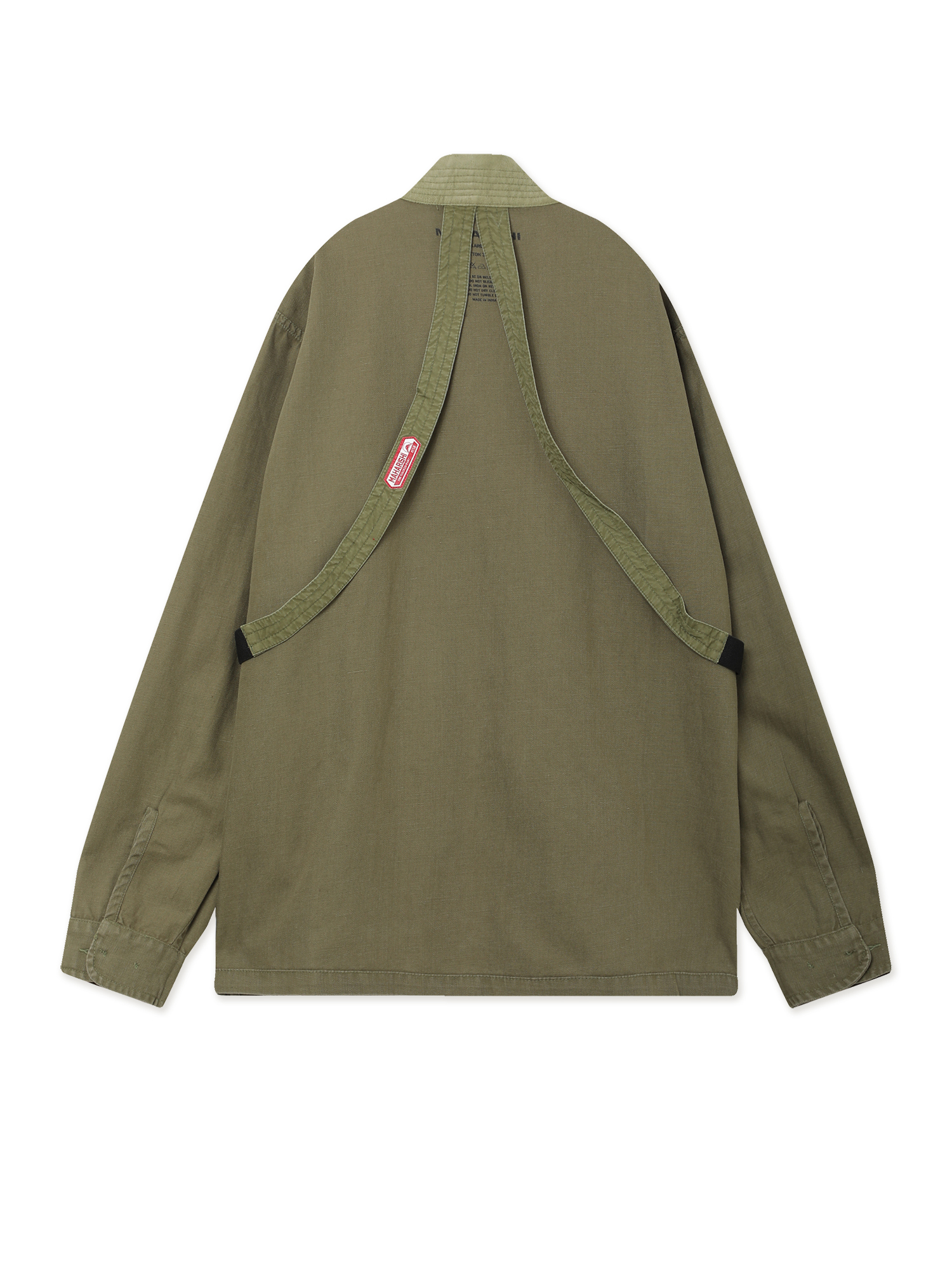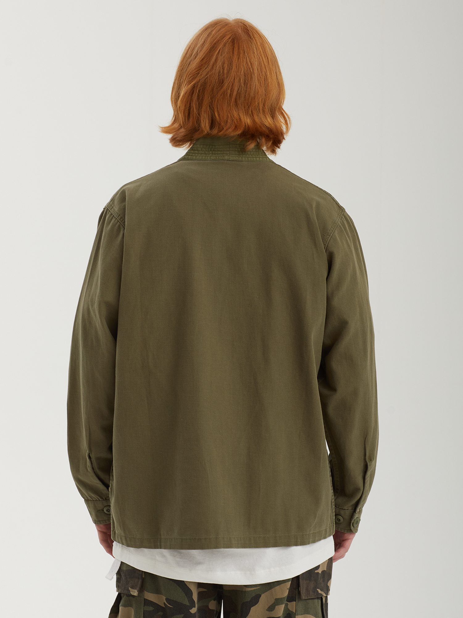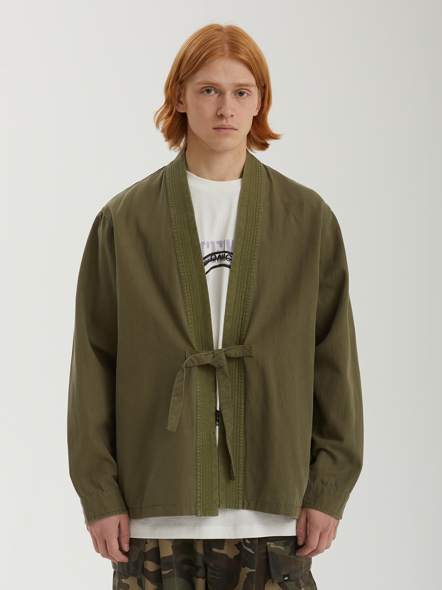 Рубашка-кимоно Maharishi из прочного смесового твила, выстиранного в готовом виде для получения винтажного эффекта. Модель выполнена в стиле традиционного японского хантона с воротником-кимоно и застежкой на завязки, дополнена утилитарными карманами.
