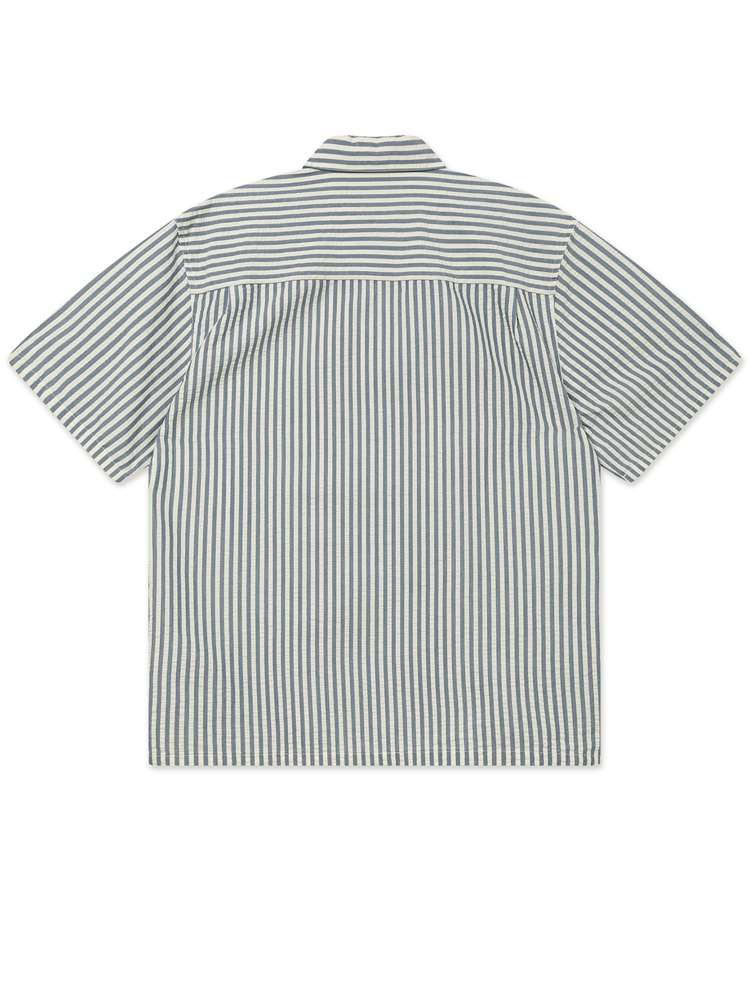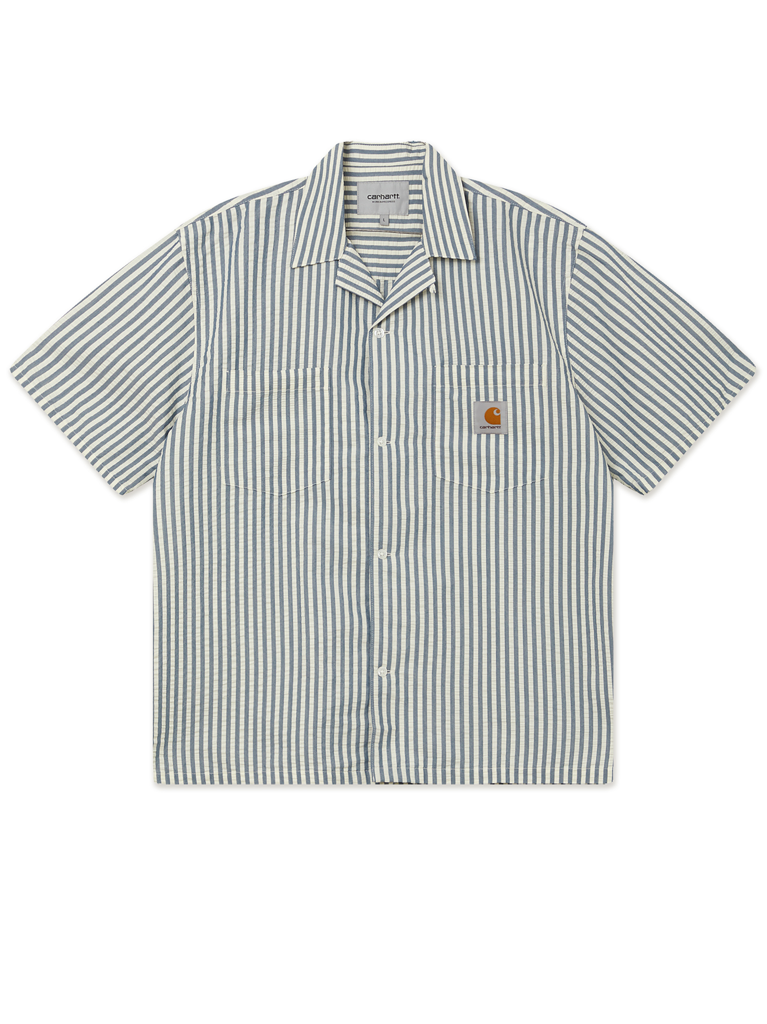 Рубашка Carhartt WIP Leavel Shirt выполнена из легкого смесового сирсакера — фактурного материала, который приятен к телу и отличается воздухопроницаемостью. Изделие прошло предварительную стирку для мягкости, благодаря чему ткань комфортна с первых дней носки. Свободный крой и отложной воротник с лацканами создают расслабленный силуэт, а практичный нагрудный карман подчеркивает утилитарный характер модели.