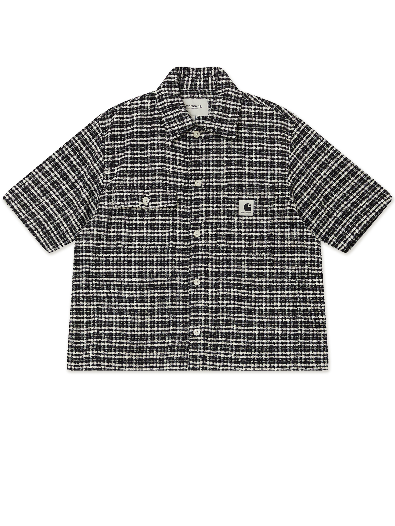 Рубашка Carhartt WIP Michigan Shirt выполнена из плотной хлопковой ткани с рельефной фактурой и клетчатым узором по всей поверхности. Модель имеет свободный крой и дополнена двумя нагрудными карманами, один из которых оснащен клапаном с пуговицей. Завершает дизайн фирменная тканая нашивка Square Label.