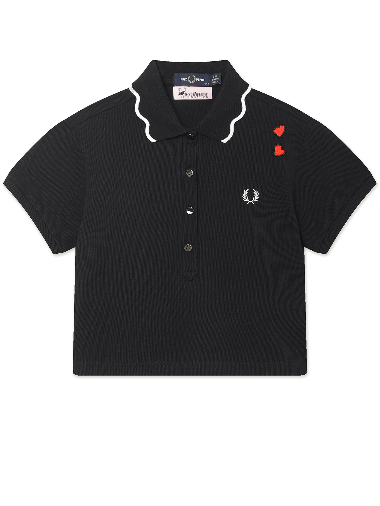 Поло с коротким рукавом Fred Perry из коллекции Amy Winehouse Foundation, вдохновленной стилем Эми Уайнхаус. Выполнено из мягкого хлопкового пике. Вышитый на груди лавровый венок дополнен нашивками-сердечками, характерными для этой линейки.