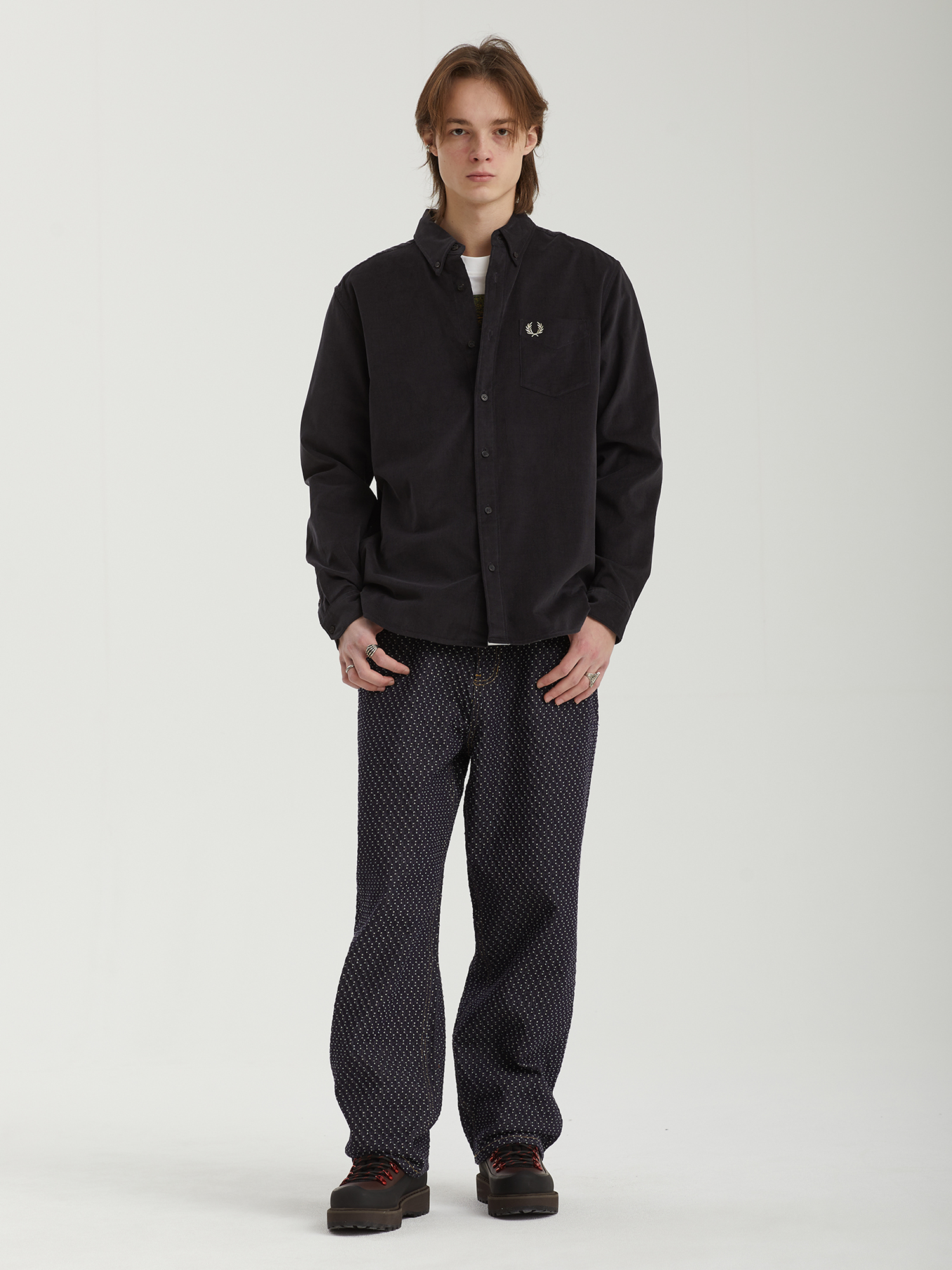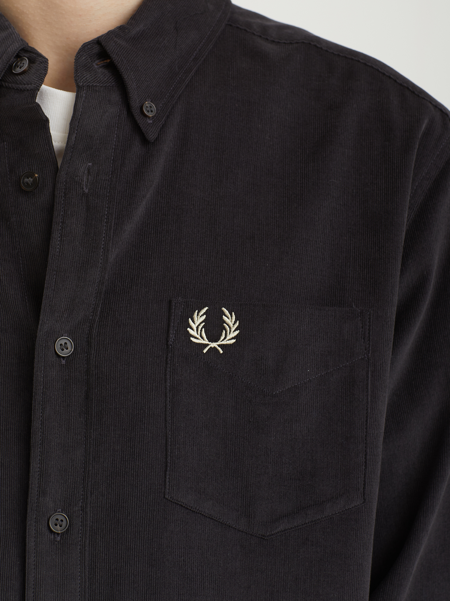 Рубашка Fred Perry выполнена из тактильно приятного хлопкового вельвета с тонкими рубчиками. Классический прямой крой создает универсальный силуэт, а воротник на пуговицах с дополнительной застежкой сзади добавляет аккуратности и структурности. Модель дополнена нагрудным карманом и вышитым лавровым венком, сохраняющим узнаваемый стиль бренда.