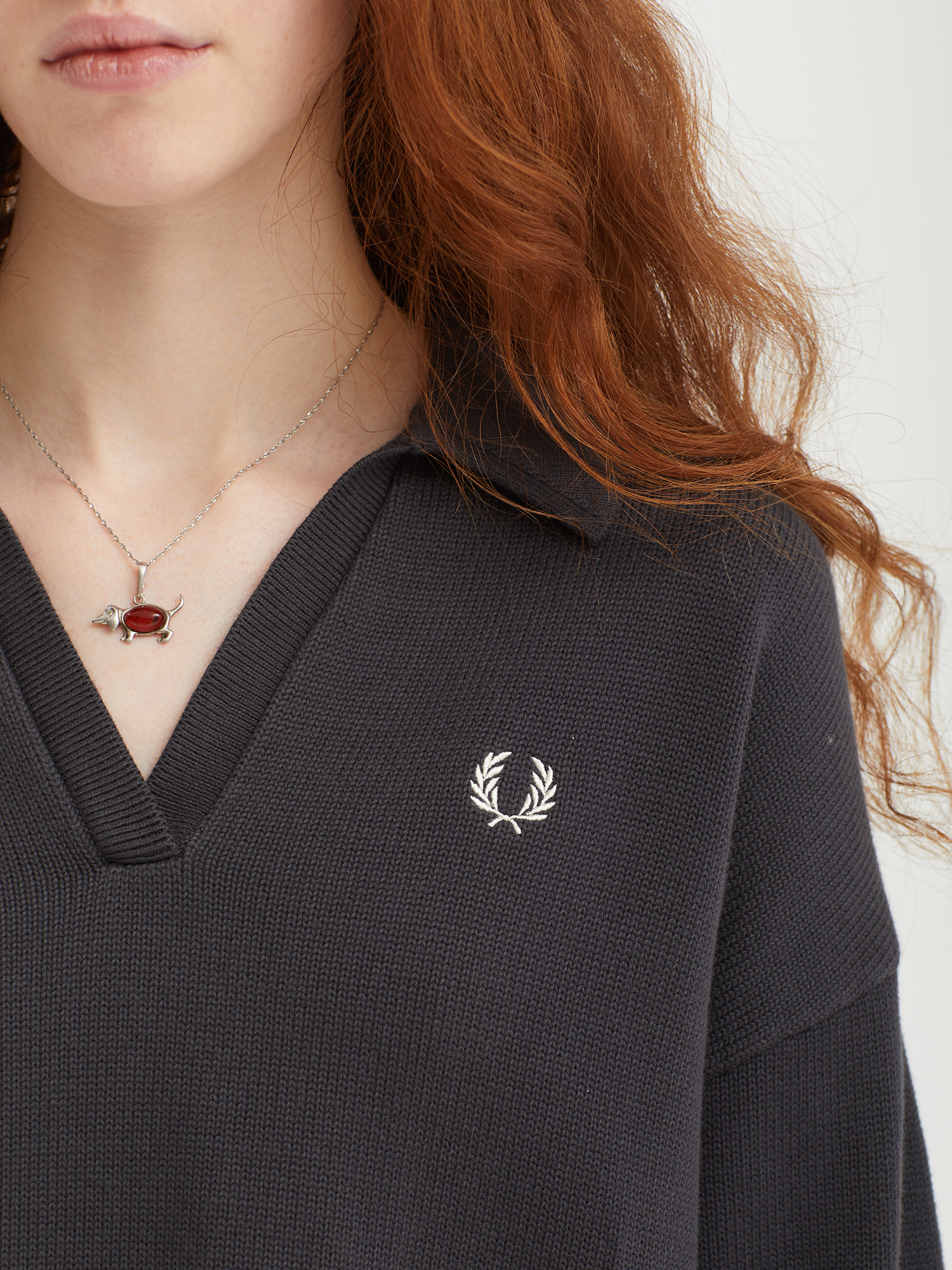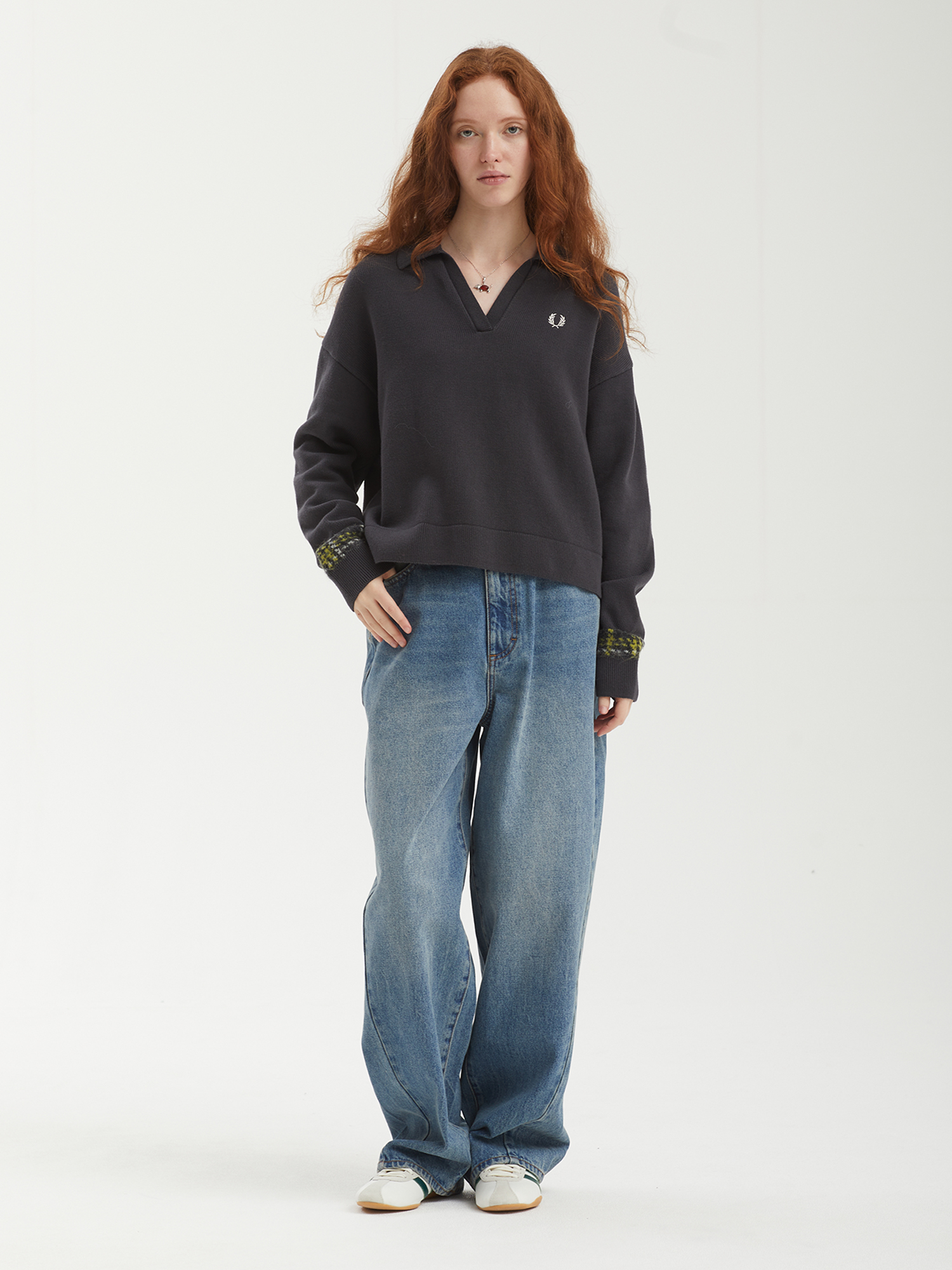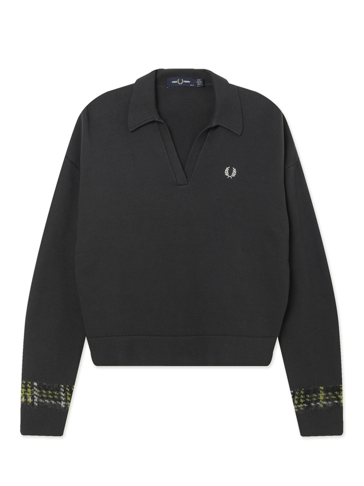 Свитер Fred Perry выполнен из хлопкового трикотажа и дополнен контрастными тартановыми вставками на манжетах. Свободный крой, открытый ворот и спущенная линия плеч придают силуэту непринужденность и легкий оверсайз-эффект. Вышитый лавровый венок служит узнаваемым акцентом и отражает наследие бренда.