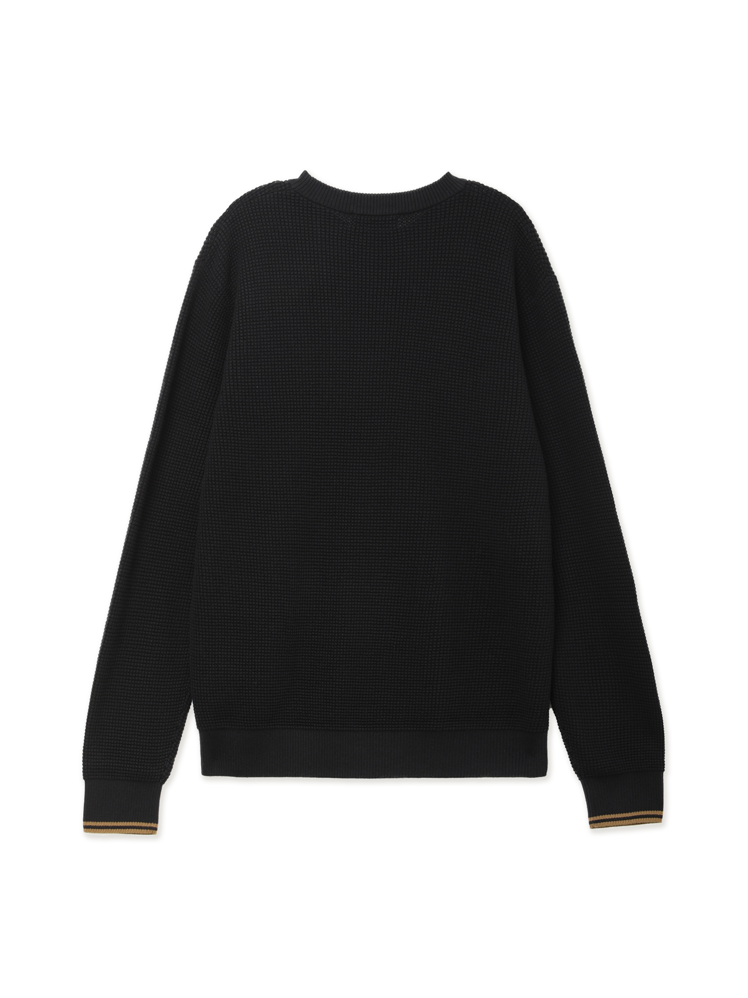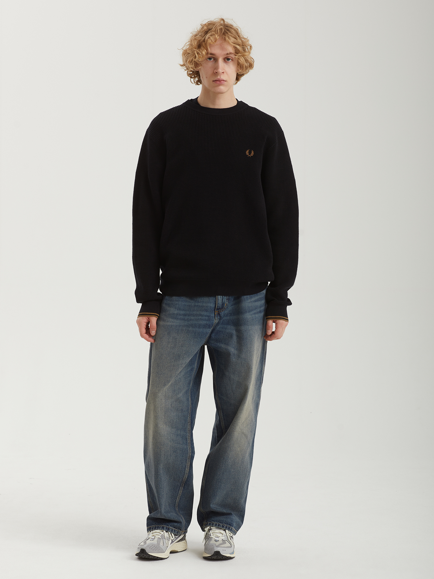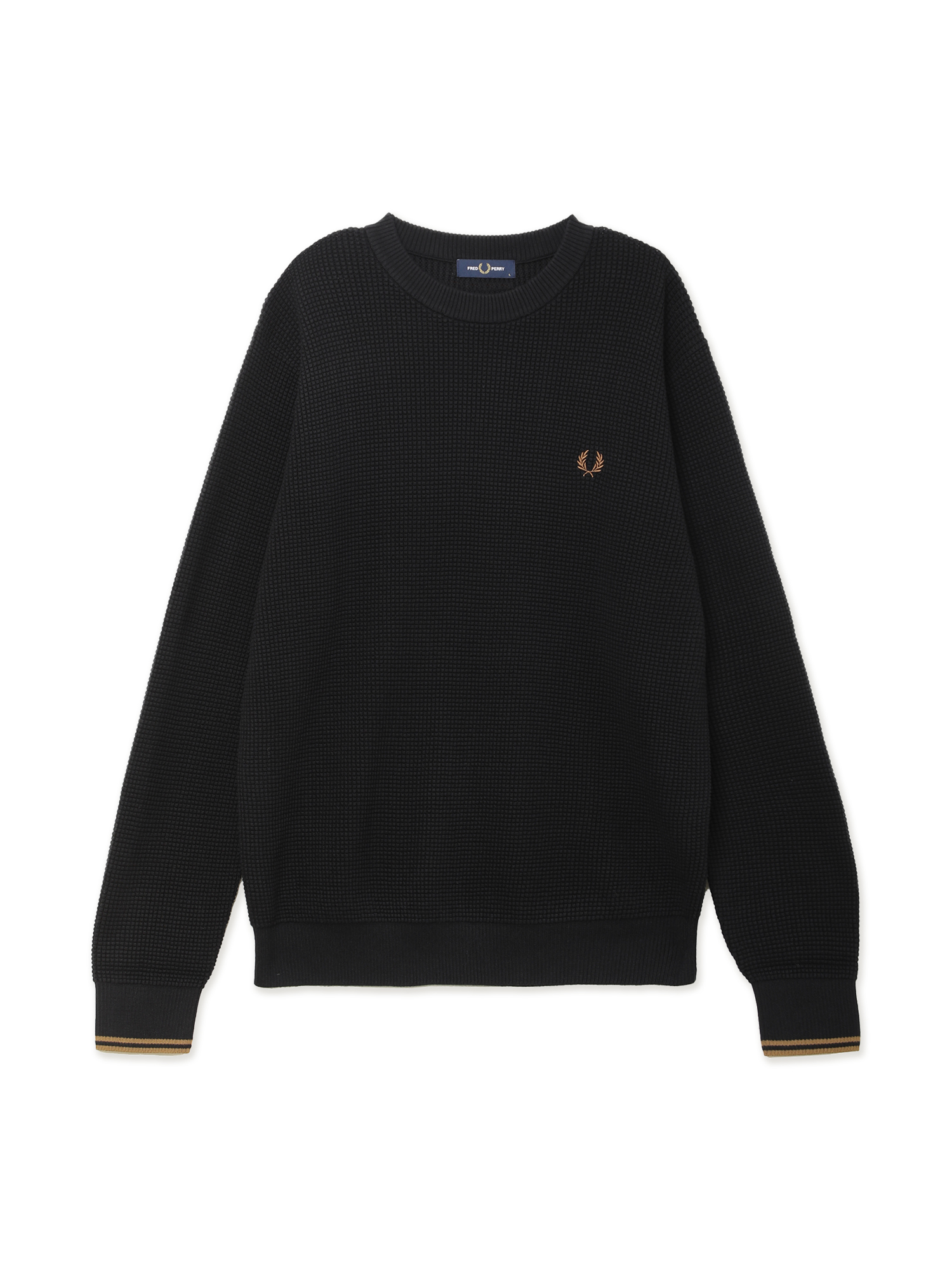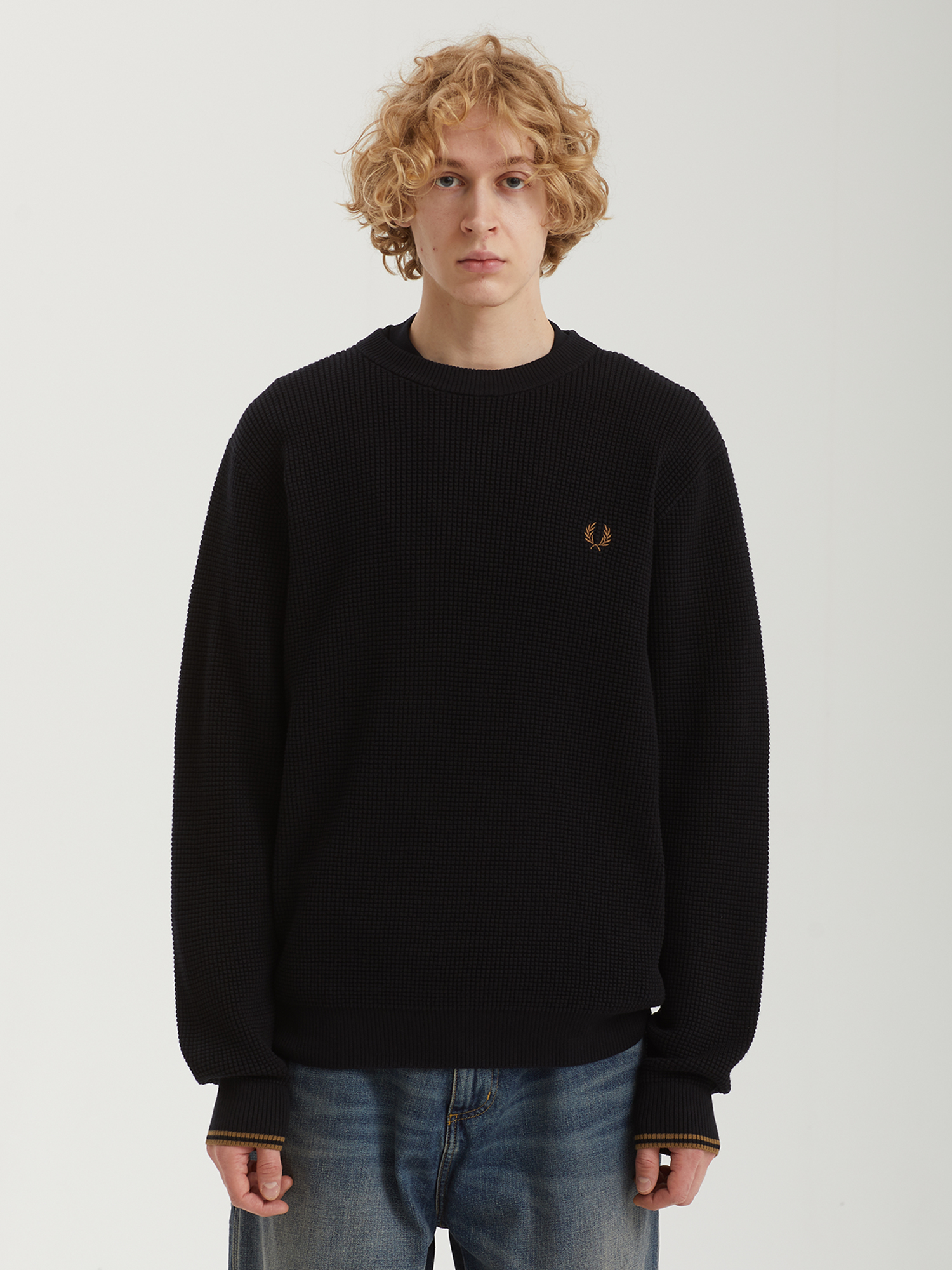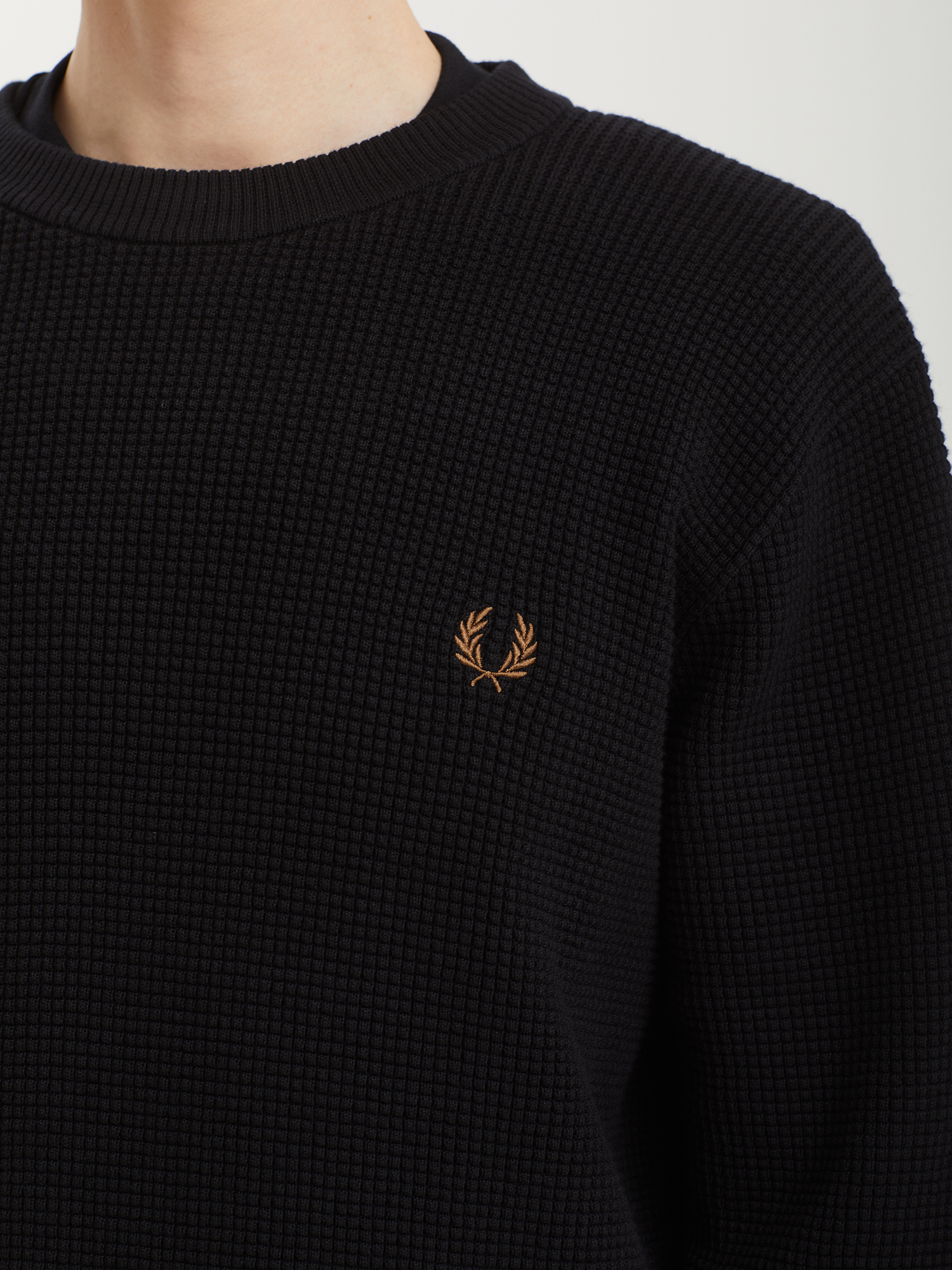 Джемпер Fred Perry из мягкой хлопковой пряжи с фактурной вафельной вязкой. Знаковые элементы дизайна: двойной типпинг на манжетах и вышивка на груди.