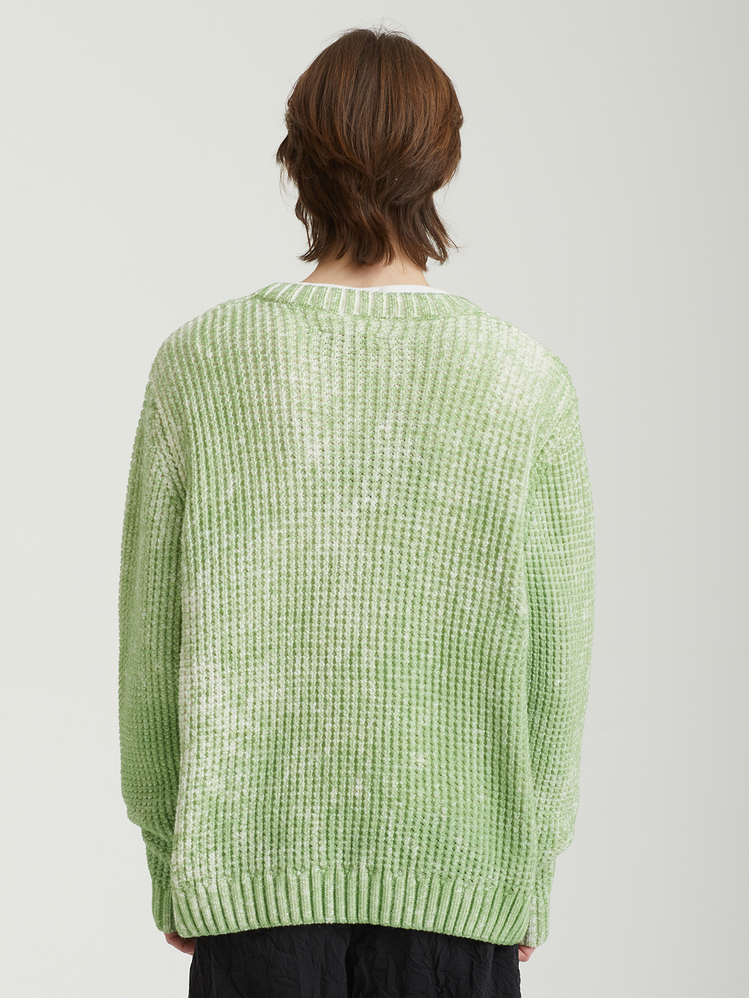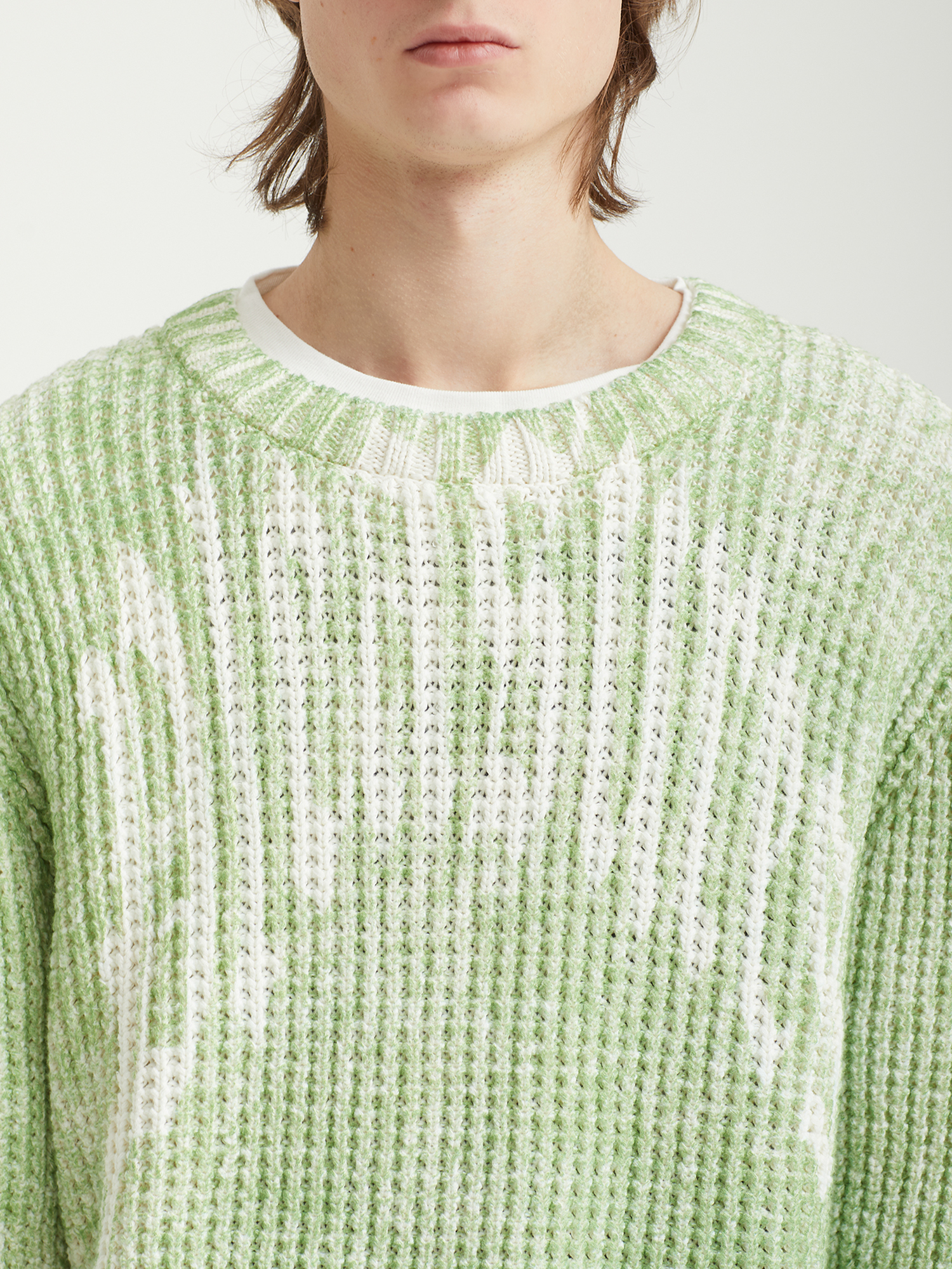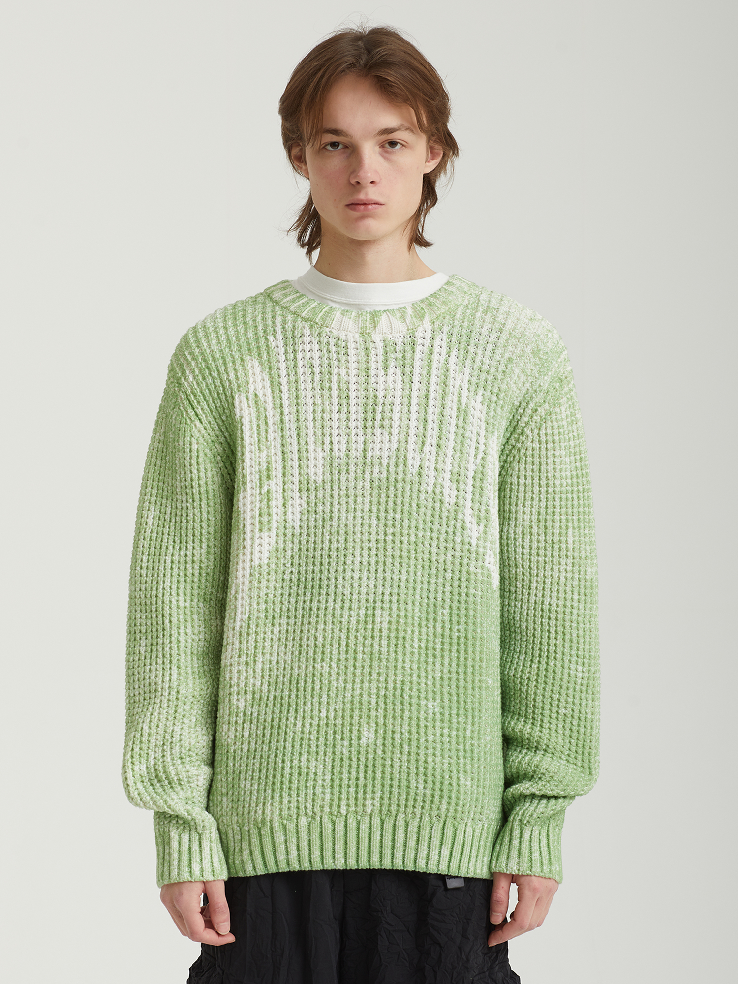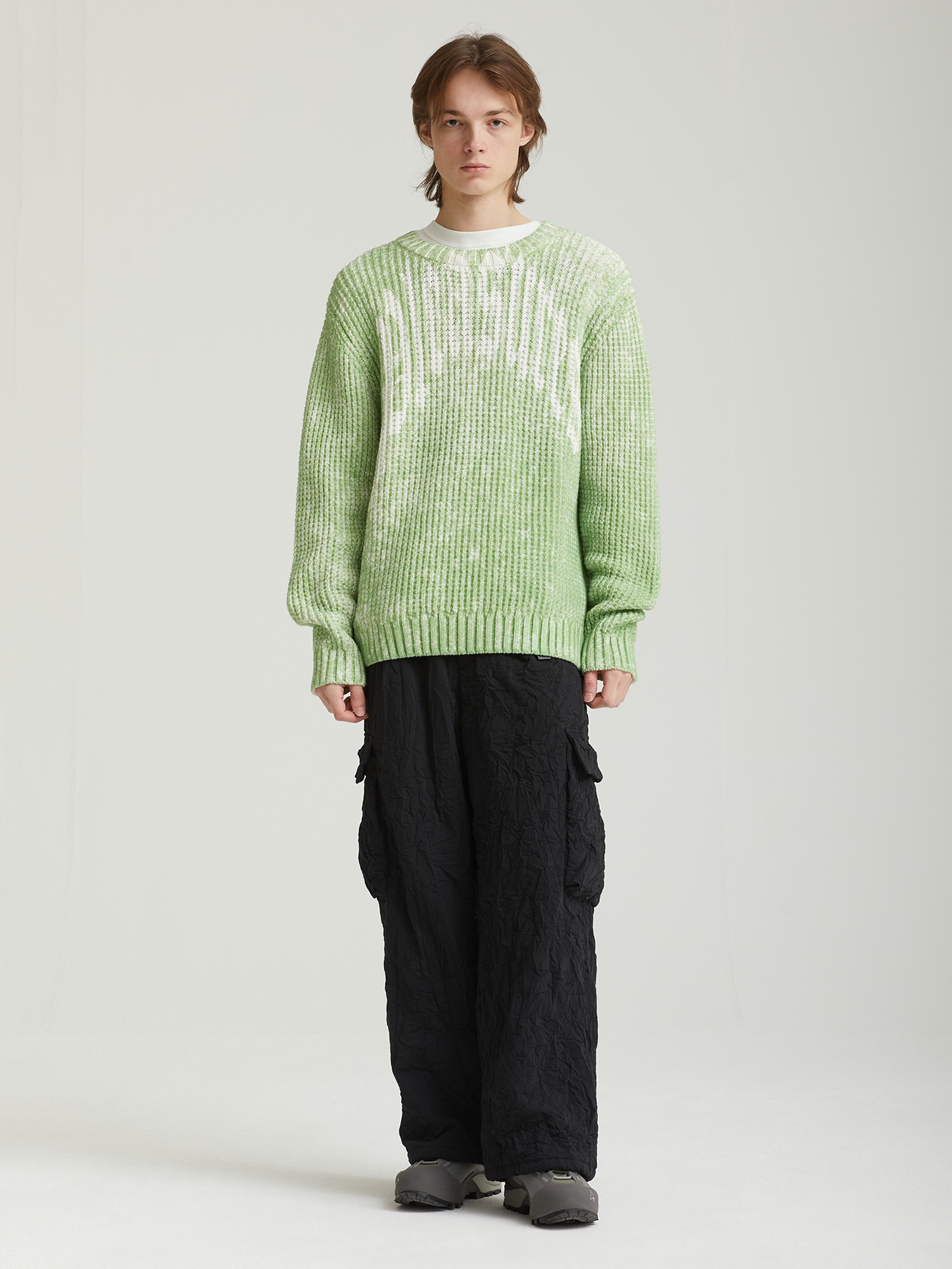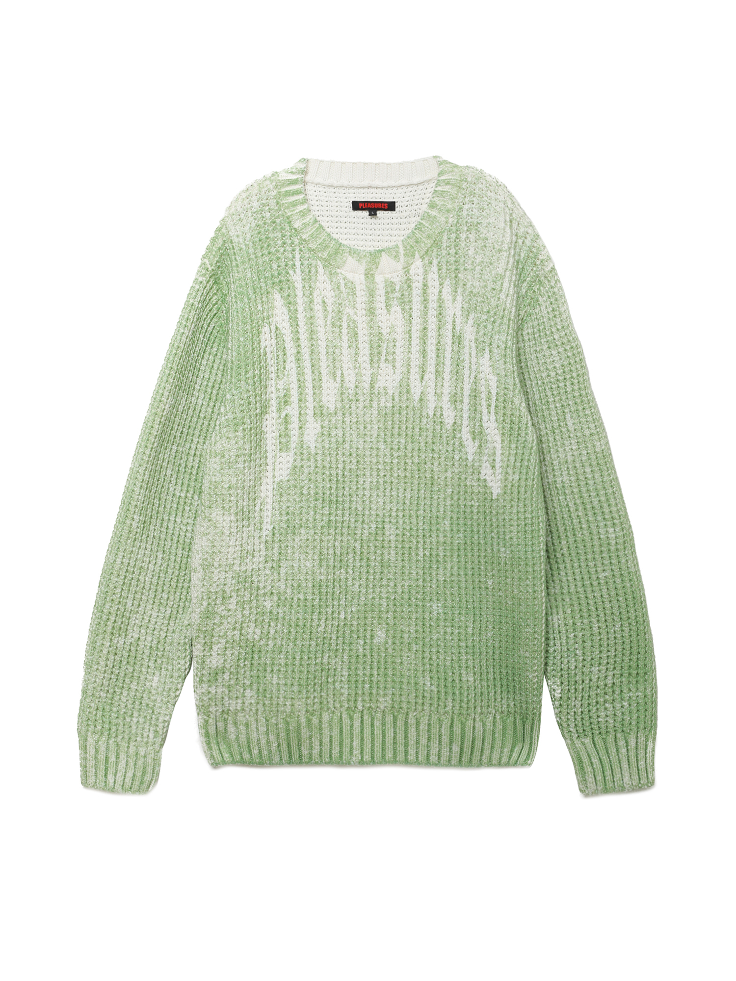 Свитер Pleasures выполнен крупной вязкой из мягкой хлопковой пряжи. Модель имеет расслабленный крой со спущенной линией плеча и получила фирменную обработку реактивными чернилами. На фронтальной панели трафаретным способом нанесен логотип калифорнийского бренда.
