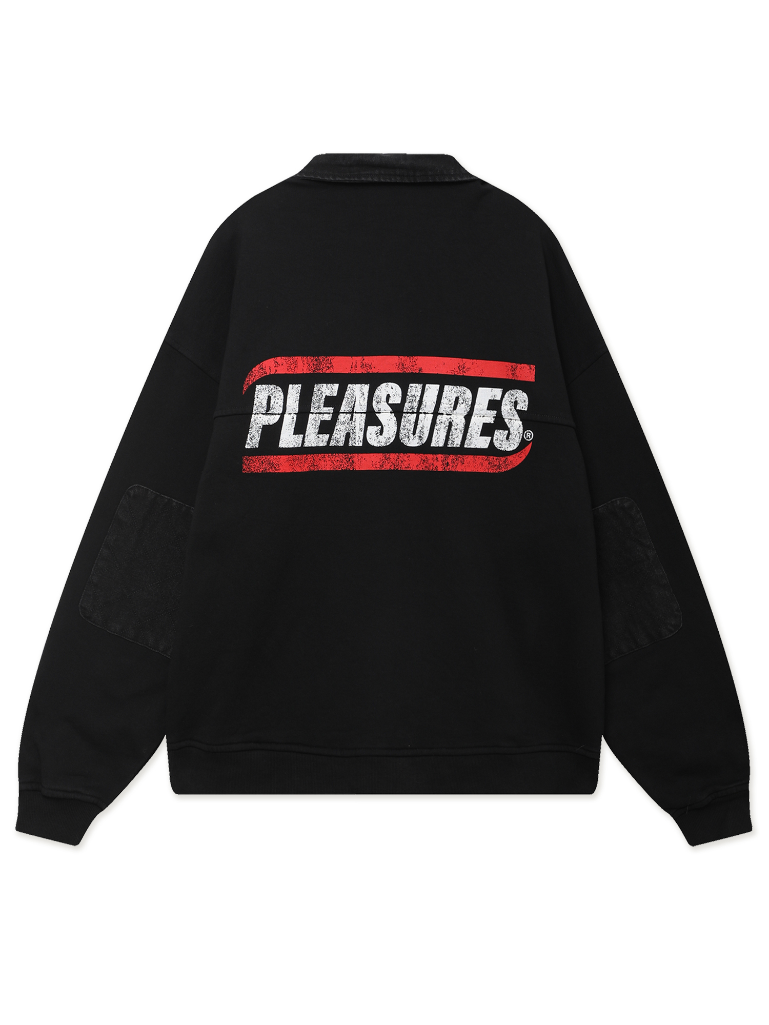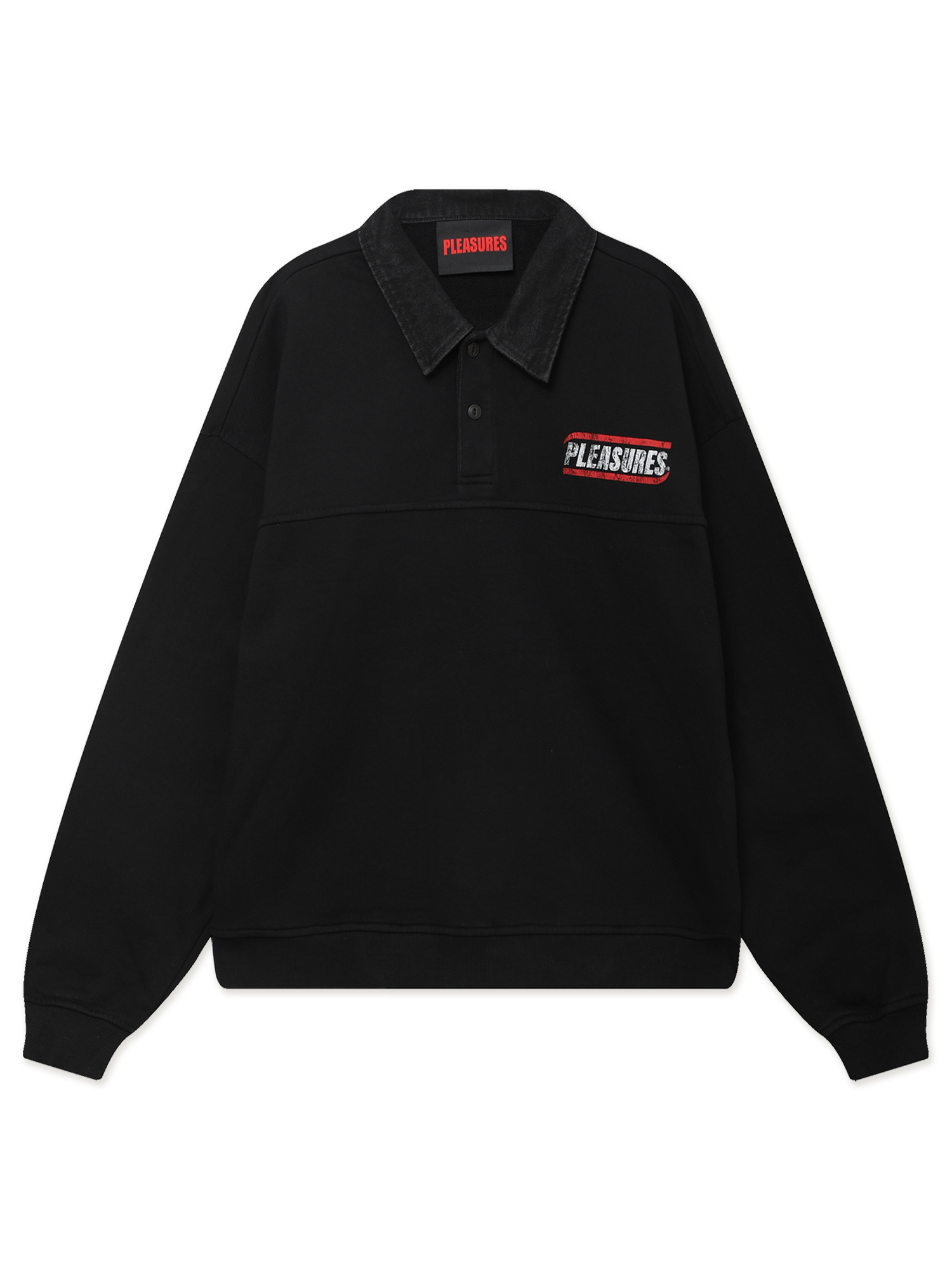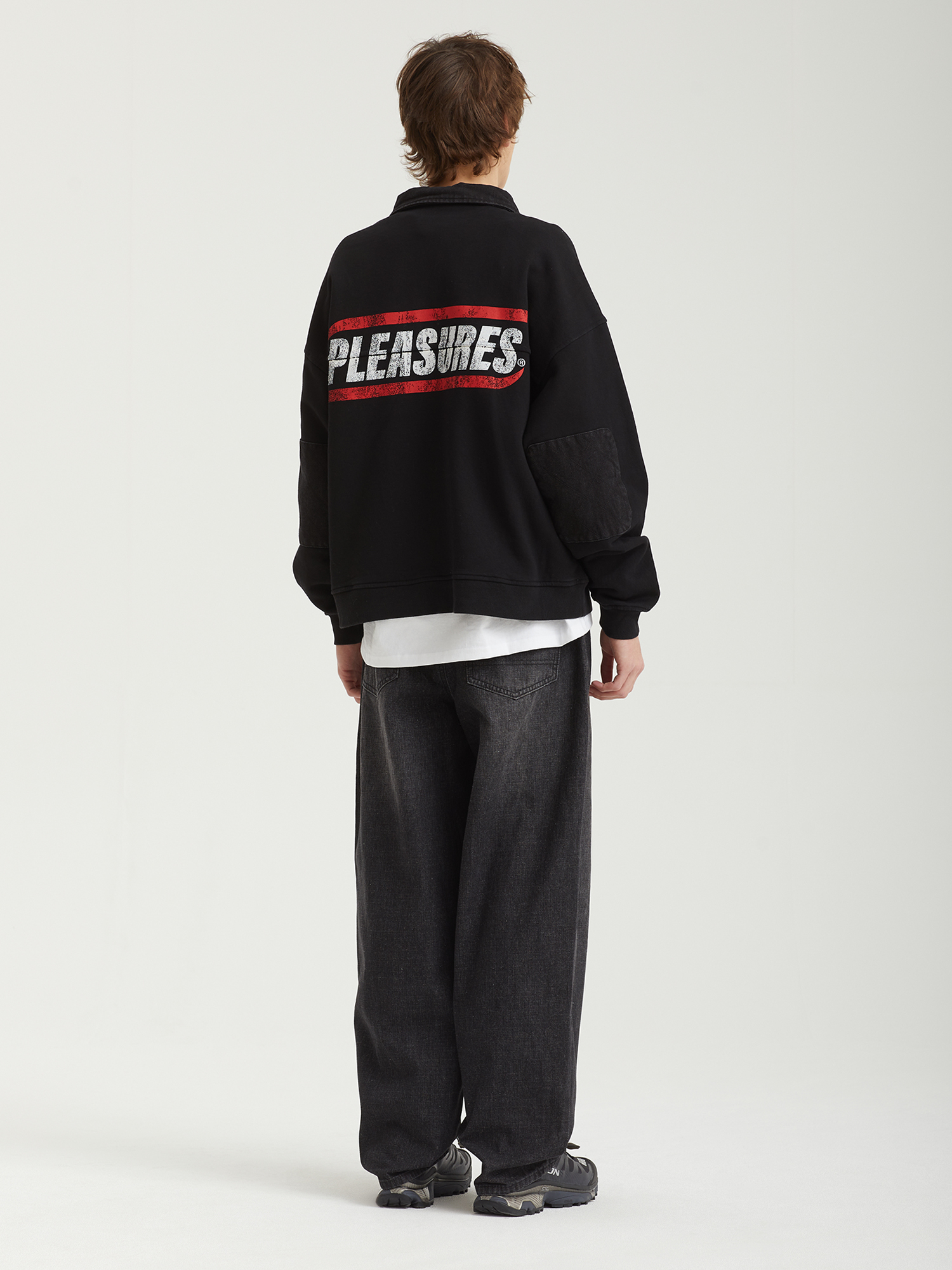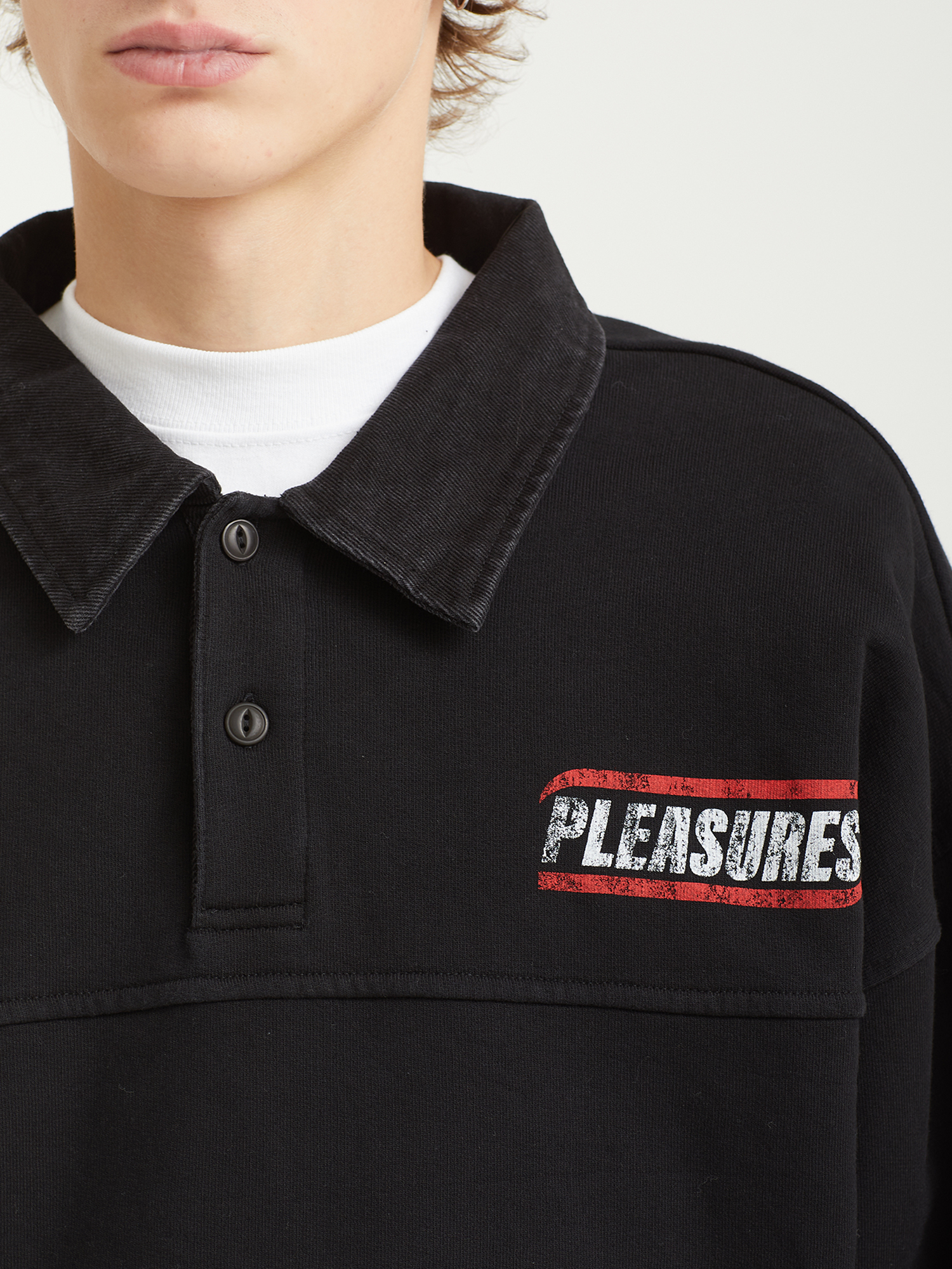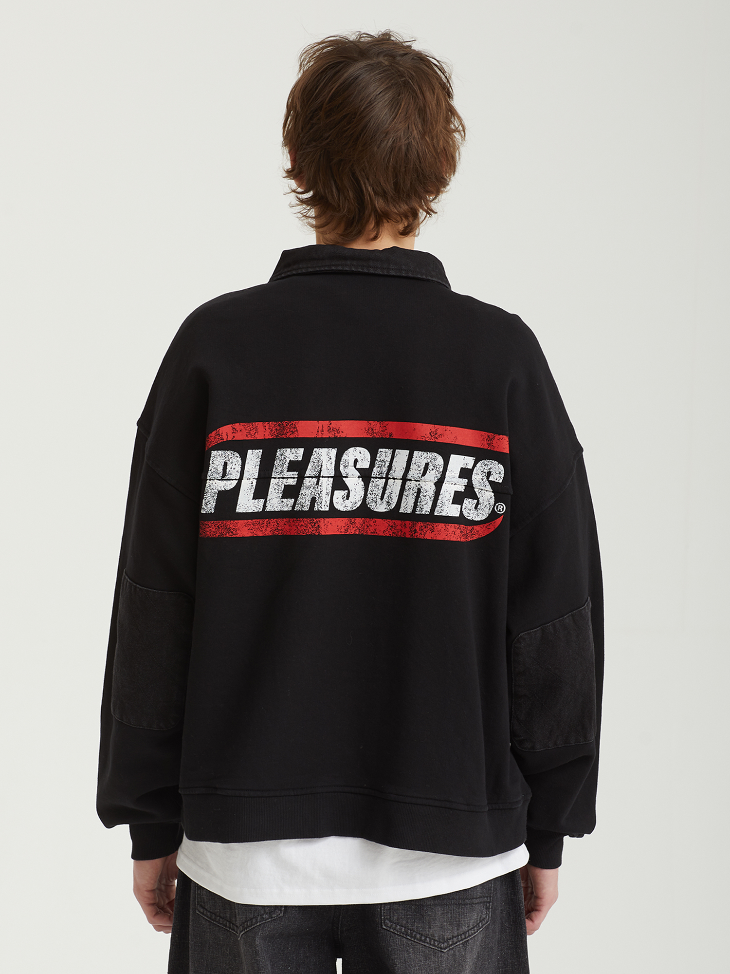 Поло-свитшот Pleasures изготовлен из плотного трикотажа French terry — хлопкового футера, который хорошо держит форму и приятен на ощупь. Слегка расслабленный силуэт, эластичные манжеты и нижняя резинка в рубчик обеспечивают комфортную посадку, а отложной воротник из вельвета создает аккуратный и стильный вид. Пластизолевые принты и финальная энзимная стирка придают изделию легкий винтажный эффект.