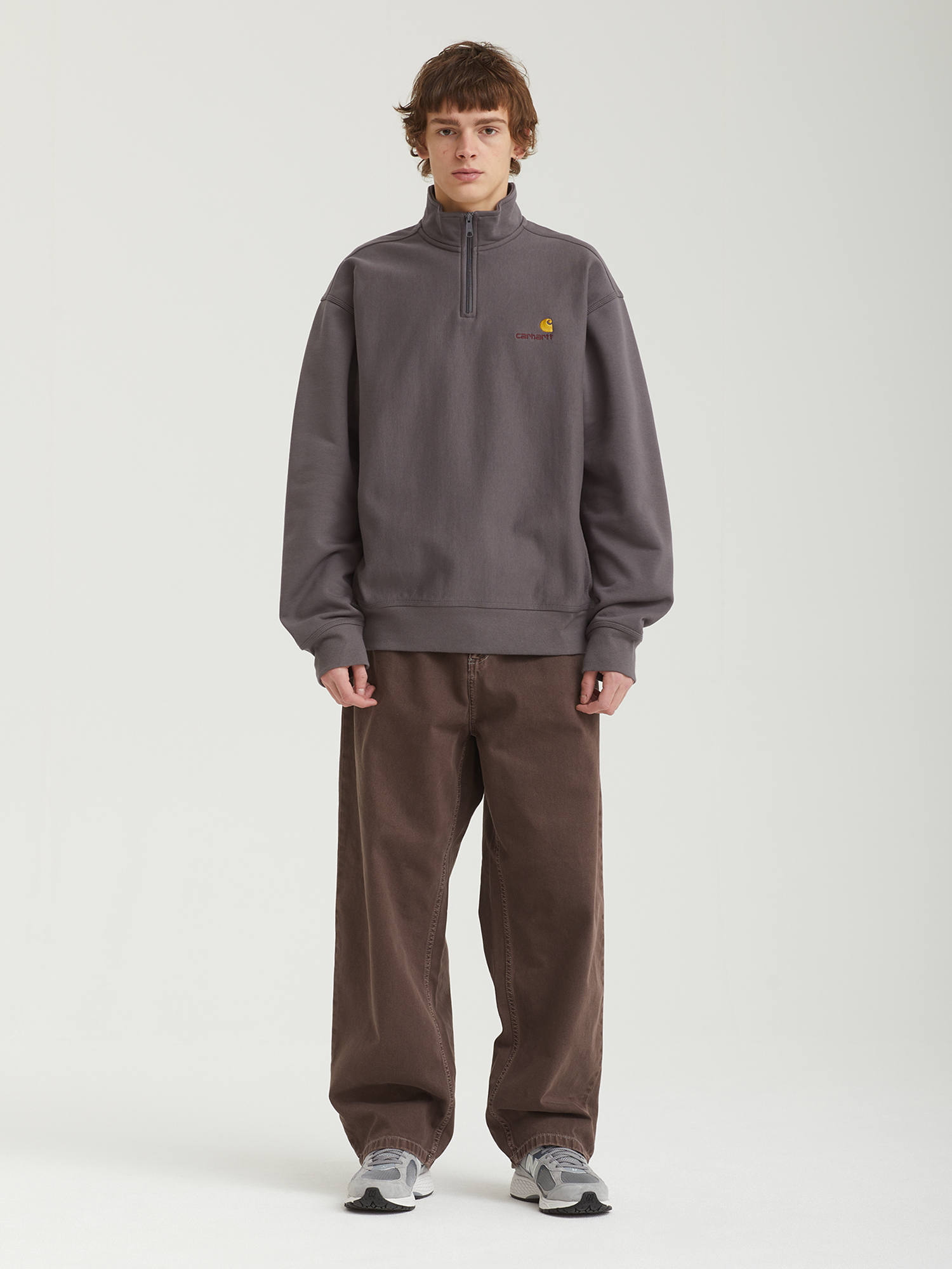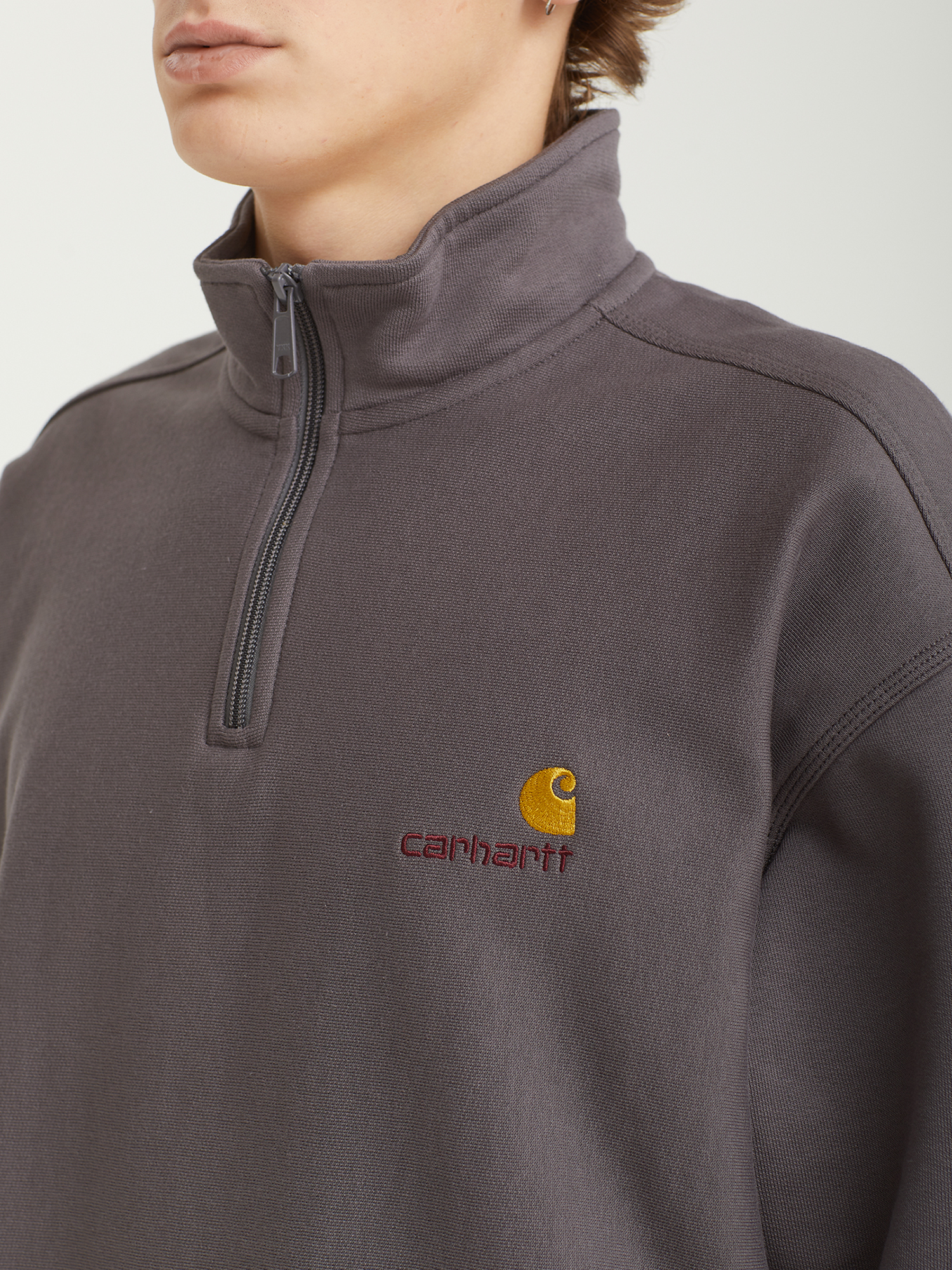 Свитшот Carhartt WIP с воротником на молнии. Выполнен из смесового хлопка плотностью 420 г/м2. Мягкая и ворсистая изнанка, напоминающая по фактуре флис. Вышивка на груди.