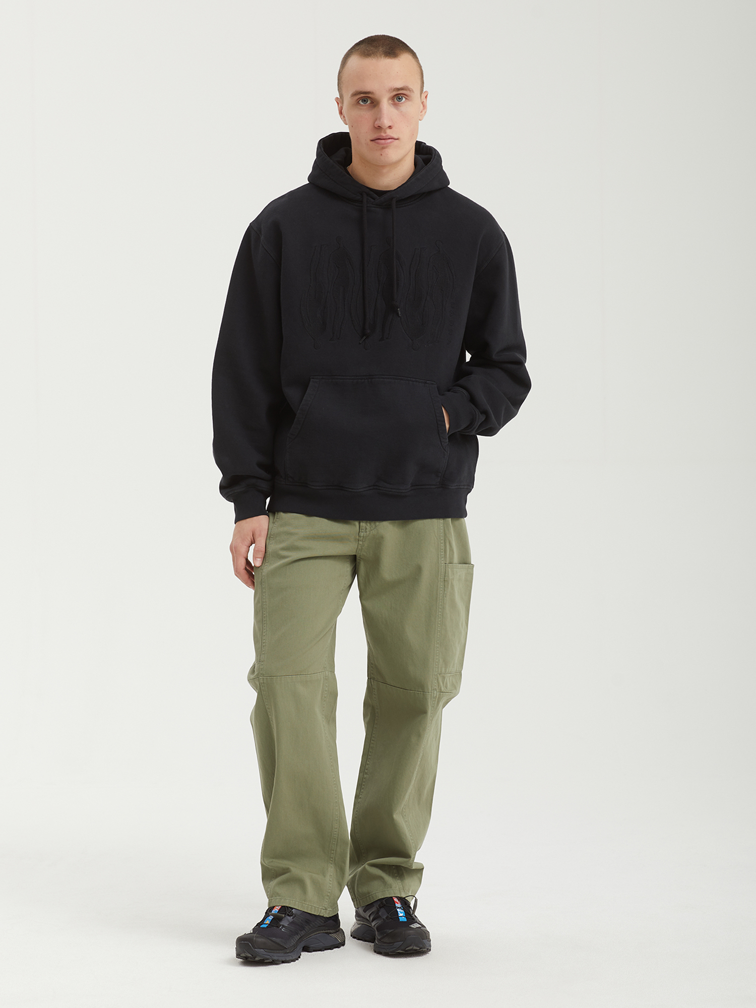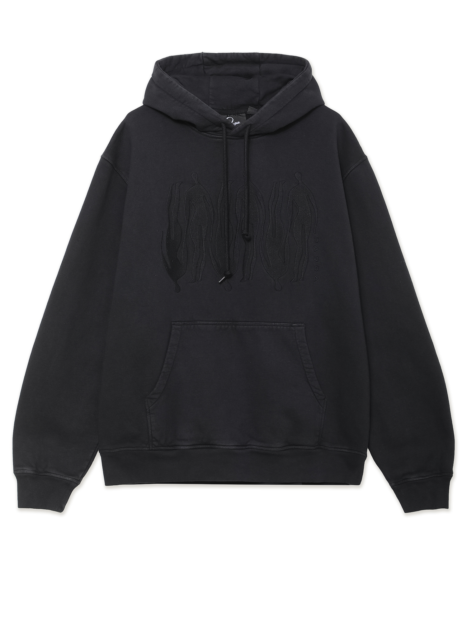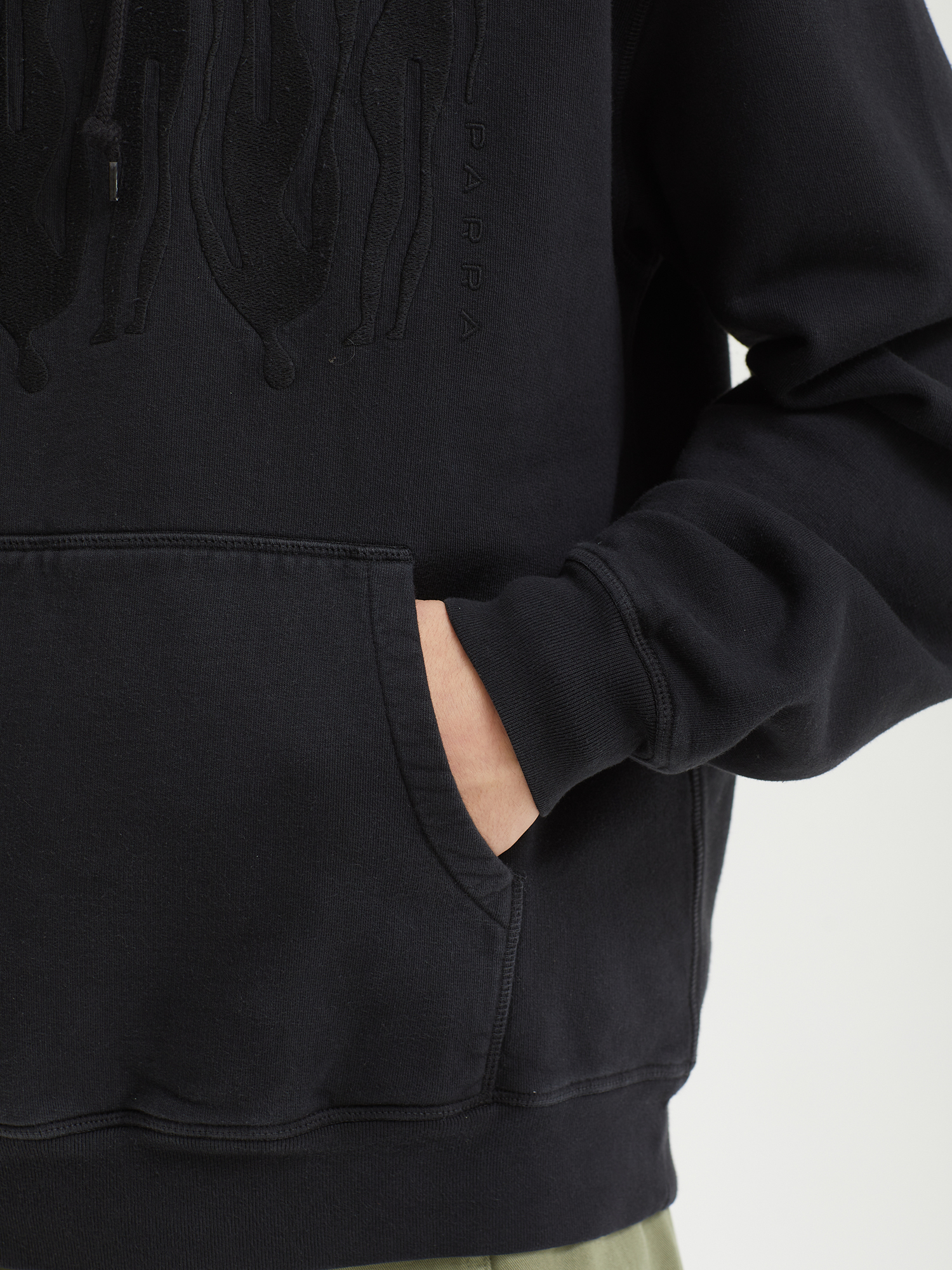 Худи By Parra из плотной хлопковой ткани с ворсистой изнанкой. На груди — вышивка с графикой от голландского художника Питера Янсена (Parra). Изделие выстирано для получения легкого винтажного эффекта.