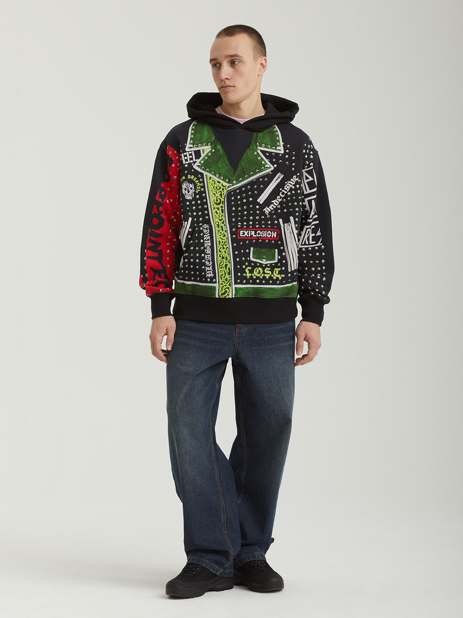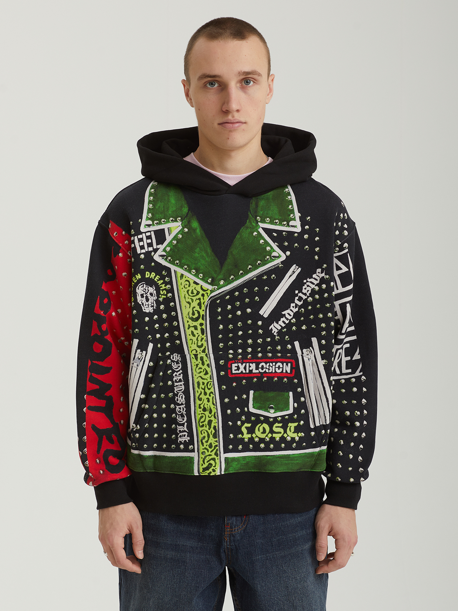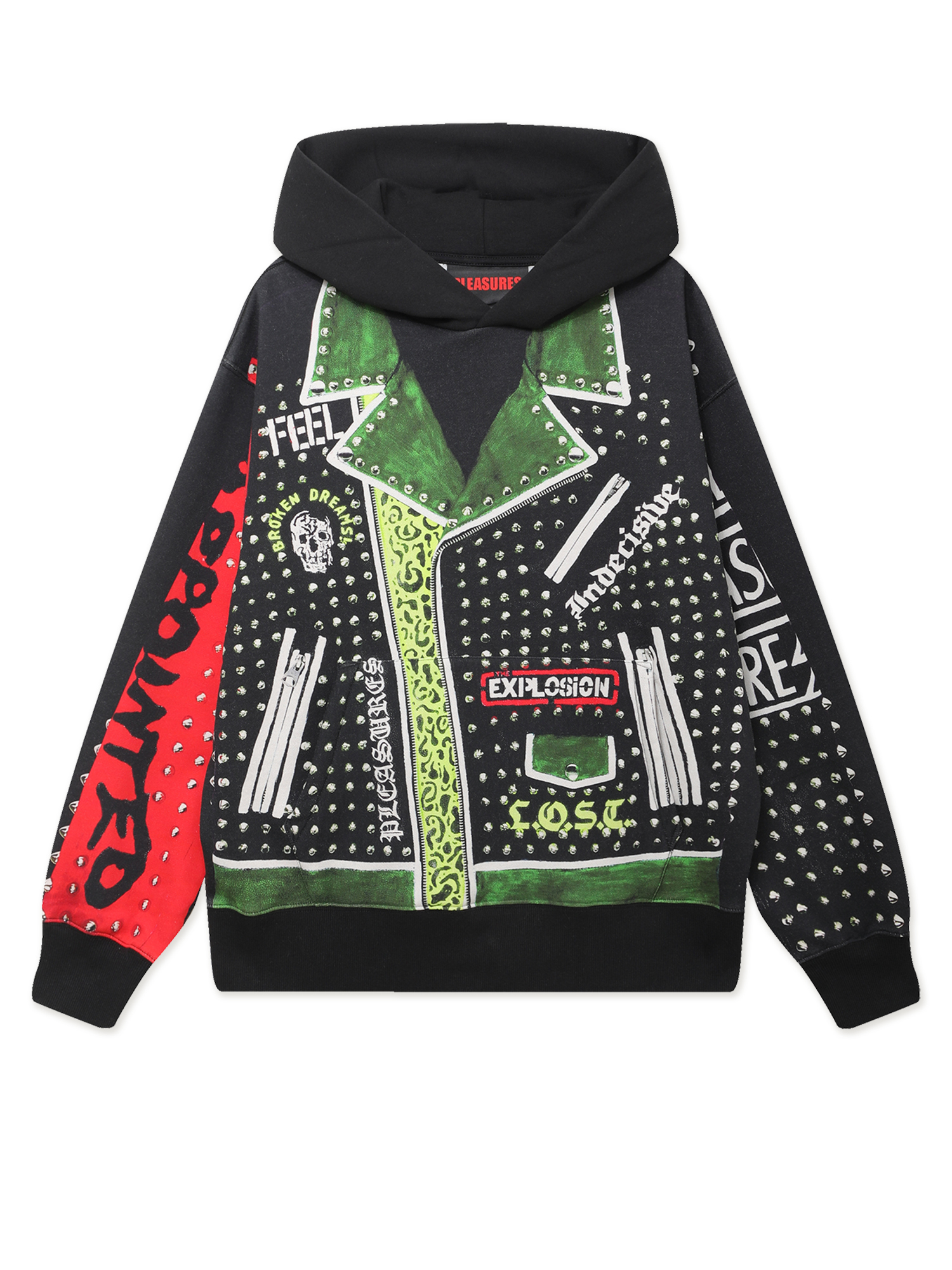 Классическая кожаная куртка, напечатанная на худи. Полноформатный графический принт в характерной эстетике Pleasures. Модель выполнена из плотного смесового трикотажа в свободном крое. Оснащена объемным карманом-кенгуру, эластичными манжетами и нижней резинкой в рубчик для удобной посадки.